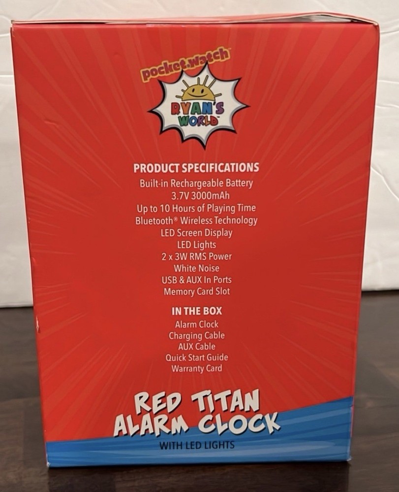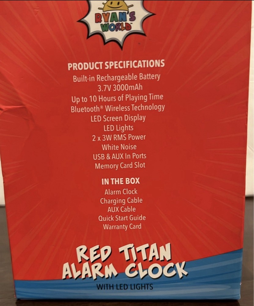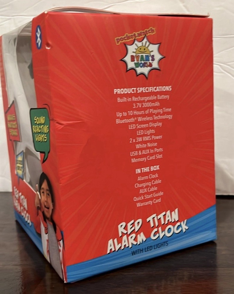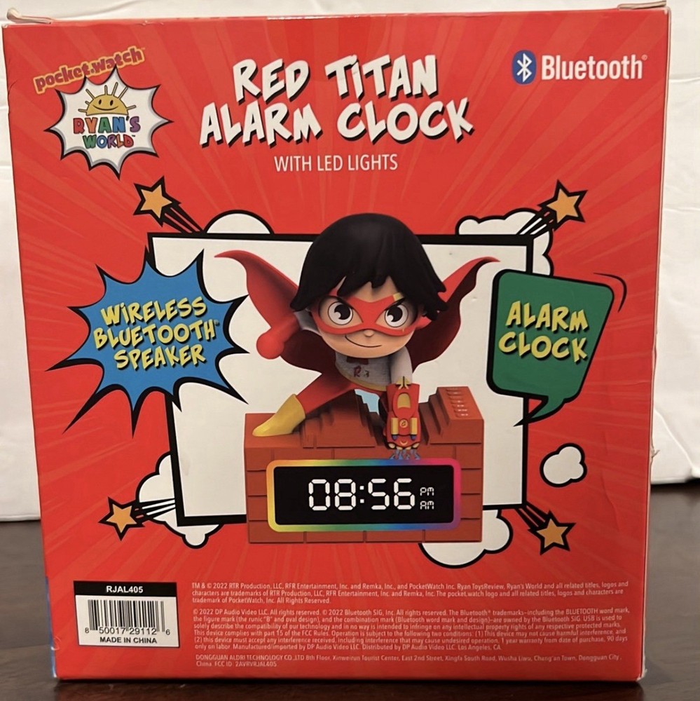 The Ryan's World DJ Kid's Alarm Clock and Bluetooth Speaker provides a happy wake-up call for your little one. No more morning grumpies! With advanced Bluetooth technology, this device connect quickly and seamlessly, making it easy to listen to music whether you're at home or traveling to Grandma's house! • Bluetooth wireless connection • LED time display • RGB LED lights. Shelf 3.2; Bin V