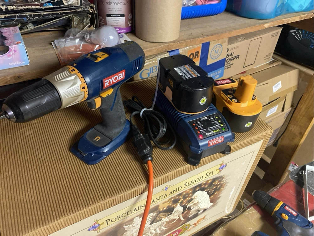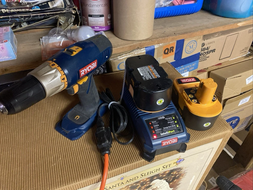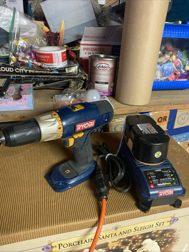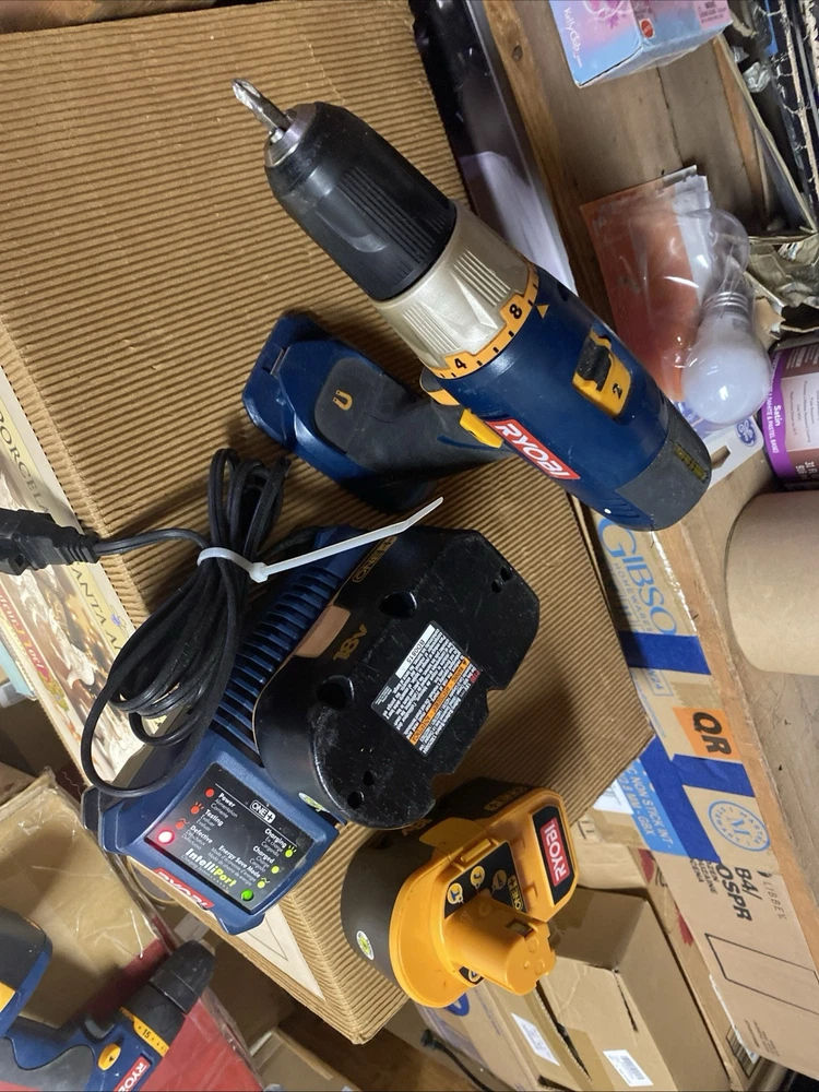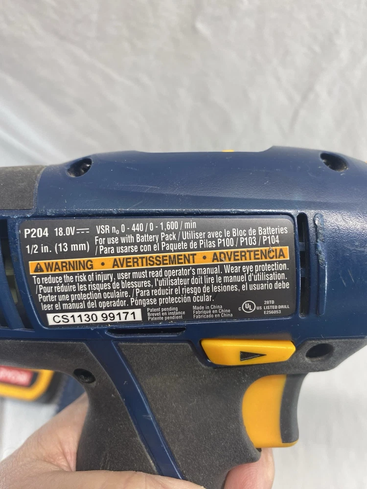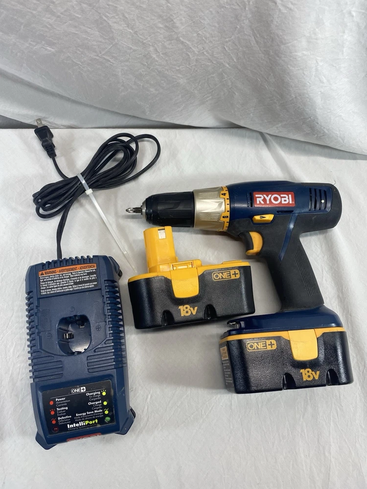 Ryobi 18V P204 Cordless 1/2" Drill Set includes a drill, battery charger, 18V NiCd battery, and a carrying bag. The compact blue drill features keyless chuck, 1/2 inch chuck size, and comes with 1 battery. It is a versatile tool for various home and workshop projects.