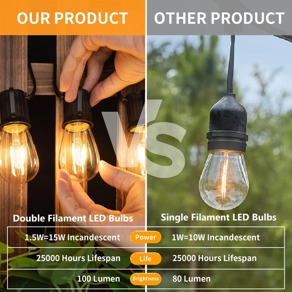 Product Specification: Watts:1.5W (Replace 15W Incandescent Lamp) Dimmable: No-Dimmable Lumen:150lm Color:2700K (Soft White) Beam Angle:360 Degree CRI:80+Ra Voltage:AC 110V-130V Base Type: E26 Medium Screw Base Package: 15 Packs of S14 LED Bulbs Application Commercial Use: Hotel, cafe, commercial buildings supermacket theaters shop-window and artwork lighting. Home Use: Bathroom, bedroom, Kitchen, living room, dining room and dressing room lighing, wall lamps, table lamps and vanity lighting. Outdoor Lighting: The globe replacement light bulb is ideal for outdoor string light. It is perfect for your garden, patio, deck, pergola and outdoor space. Warm tips--These S14 1.5 watt led bulb couldn't work with Solar String Light and other low volatage string light bulbs. 【Energy Efficient & Money Saving】Equipped with energy-efficient LED Filament, these S14 LED Bulbs will reduce heat output and save over 90% on the electricity bill of lighting, which makes it an economical alternative to 10W-15W incandescent or halogen string light bulbs. 【High CRI 80+ & Stable Output】Features high CRI 80+, bring out a vivid and natural color, providing you with a better visual enjoyment. And the high quality of light output will also remain stable throughout the lifetime. It means that the soft warm light bulb will create welcoming and comfortable light for your home. 【Super warm & No Delay】Designed with the latest LED source technology, this outdoor LED light bulb has a output of up to 100 lumens. It will emit full brightness at soft white 2700k with 360-degree light. No delay and no dark space, widely used for such as string lights in backyard, patios, outdoor, indoors bars,garden or other decoration light fixtures. 【Easy To Install & Wide Application】15 Pack LED String Light Bulbs Replacements with E26 screw bases can be easily screwed into the light fixtures directly, optimal choice for outdoor decoration like patio, porch,garden,festoon,camp,party and etc.