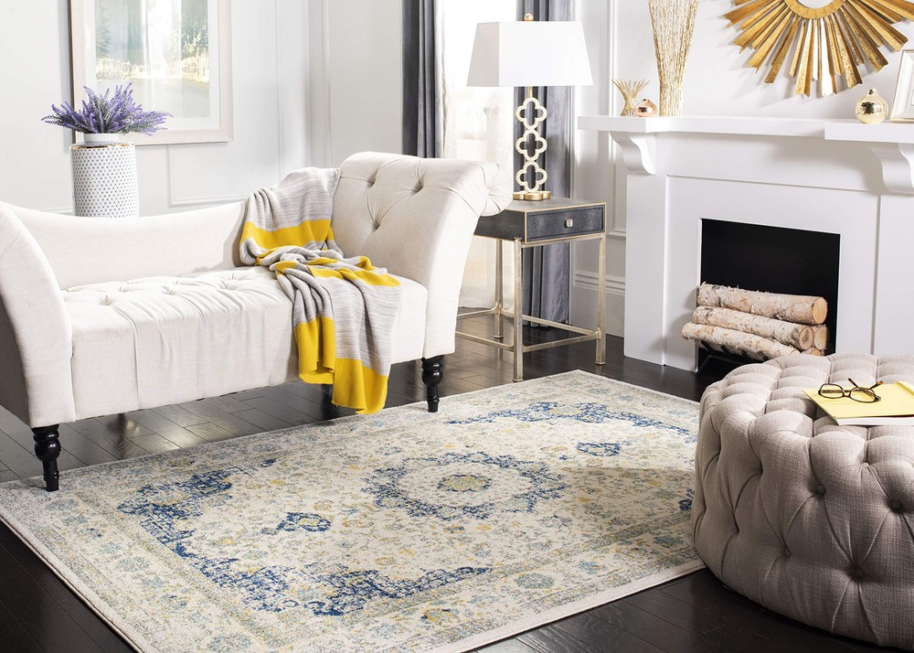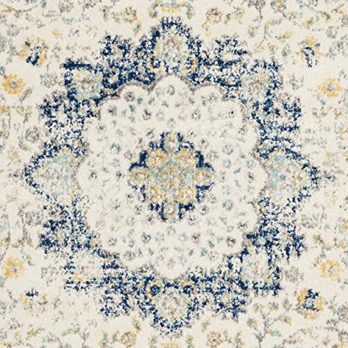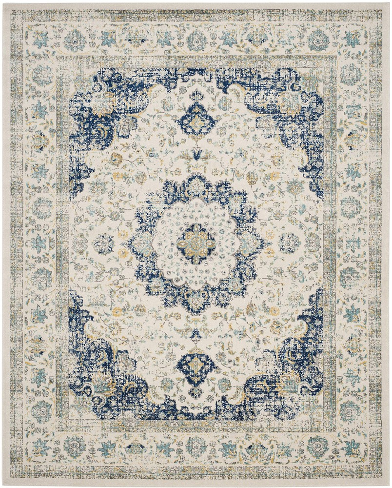 Fusing old world charm with contemporary sensibilities, the Evoke Collection of fashion-forward Frieze area rugs is a marvelous display of dazzlingly designed, durable indoor carpets. This gorgeous vintage-inspired rug features shades of turquoise, royal blue, grey, and ivory with a central floral medallion. A refined power-loomed construction ensures precise details and its enhanced luxurious synthetic polypropylene and polyester fibers guarantee a virtually non-shedding rug. Due to the low shedding, these rugs holds up in high-traffic area of the homes and looks beautiful in the living room, bedroom, home office, dining room, foyer, or nursery. With the charm of a rare heirloom, this collection explores expertly designed weathered appearances and elegant detailing. Transitional rug adds a shabby chic designer touch to any décor Refined power-loomed construction Enhanced polypropylene and polyester fibers for low shedding Distressed oriental pattern with central medallion Low 0.4-inch cut pile for a sleek look Jute weft backing Perfect for any Room: Living Room, Bedroom, Dining Room, Nursery, Foyer, or Home Office Crafted in Turkey A rug pad is recommended Surface Type Brick,Carpet,Concrete,Hardwood Surface,Pavers,Stone,Tile [STAIN RESISTANT & NON-SHEDDING]: Expertly machine-woven from enhanced synthetic durable fibers that are stain resistant and have a virtually non-shedding 0.4-inch thick pile.Construction type:Machine Made [KID AND PET-FRIENDLY]: Safe for everyday indoor high foot traffic and areas more prone to life’s unpredictable messes from kid or pet activity [TRENDY STYLE]: Shabby chic medallion design beautifully enhances any room of the home, from the living room, dining room, bedroom, entryway, nursery, dorm room, study, home office, or eat-in kitchen [EASY MAINTENANCE & DURABLE]: Stress-free cleaning includes regular vacuuming and gently blotting out minor stains with a mild detergent or carpet cleaner.[TRUSTED BRAND]: SAFAVIEH has been a trusted brand and leader in home furnishings for over 100 years, using their expertise in crafting trendy high-quality designs; Begin your rug search with Safavieh and explore over 100,000 products today Product Note : Rugs may contain temporary creases upon arrival, allow time for creases to flatten and settle
