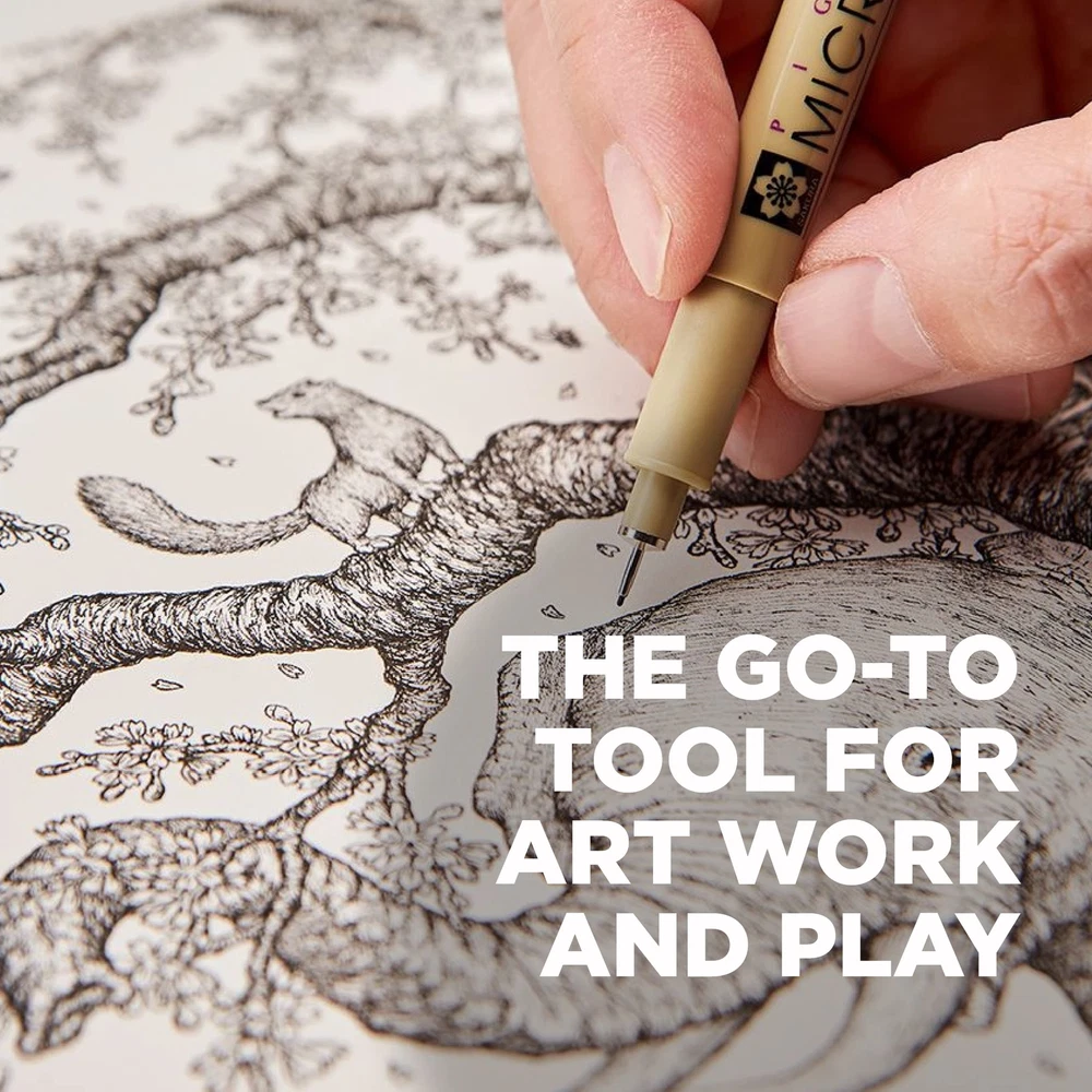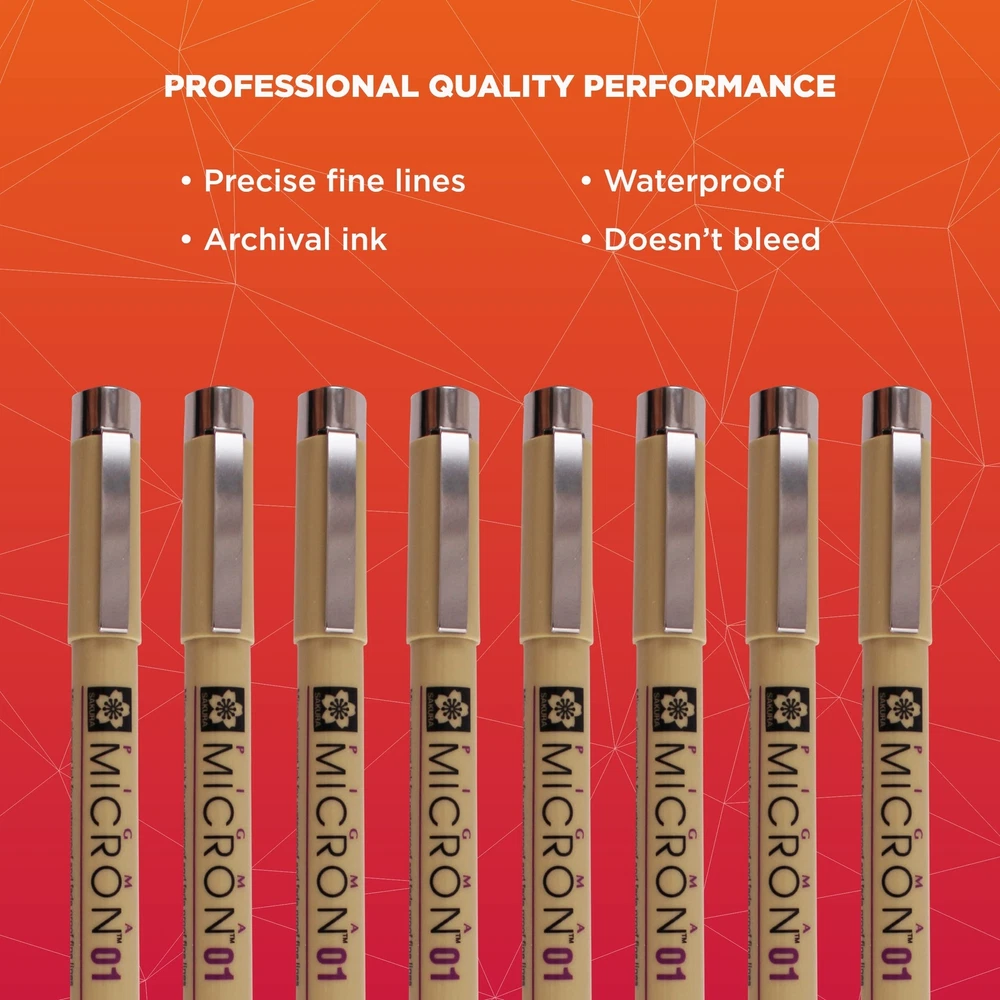 Pigma Micron Fineliner Pens feature archival quality ink for use in acid-free environments, and these pens are chemically stable, waterproof, and fade resistant. Avoid smears, feathers or bleed-through on most papers with these black pens. Pigma Micron pens are certified non-toxic, approved by ACMI toxicologists, and bear the trusted AP Seal. Use for graphic art, scrapbook, archival recording, pen and ink illustrations, freehand art, rubber stamps, cartooning, and more. Due to the delicate nature of the smaller nibs, apply gentle pressure during use to avoid bending. Pigma ink, invented by Sakura over 30 years ago, continues to be the most reliable permanent ink on the market today. Artists, the government, and scientists consider Pigma Micron a basic tool for any archival-quality, handwritten project. Use Pigma Micron to leave a mark that will last a lifetime. Manga artists, professional illustrators and watercolorists use the seven point sizes to create precision lines. About Sakura To be human is to be uniquely creative. We have a drive to create—new ideas, stories, products, art, and more. While technology will change the way we live, only we as humans have the particular ability to imagine and unlock possibility. At Sakura of America, we foster this incomparable human capability to think, dream, experiment, and connect. We know everyone is capable of creativity. This trait is within everyone, not just select people. Whether you are using our products for artwork, expression, problem solving, storytelling, or organization, creativity is at the core—allowing us to connect with ourselves and with others. We believe if you foster your creative abilities, you can reach your full potential. We encourage people to take a moment to explore how creativity unlocks new perspectives, self discovery, and human connection. Precise Ink: Black and colored Micron pens create precise marks that stand the test of time Assorted Sizes: Contains 8 Micron pens in various point sizes for versatile use Archival Quality: Sakura Micron ink is waterproof, fade resistant, bleed free, quick drying, and pH neutral Color Consistency: Pigma Micron pens use single pigments for consistent color every time Professional Results: Japanese quality Sakura pens deliver professional results for all your writing and drawing needs