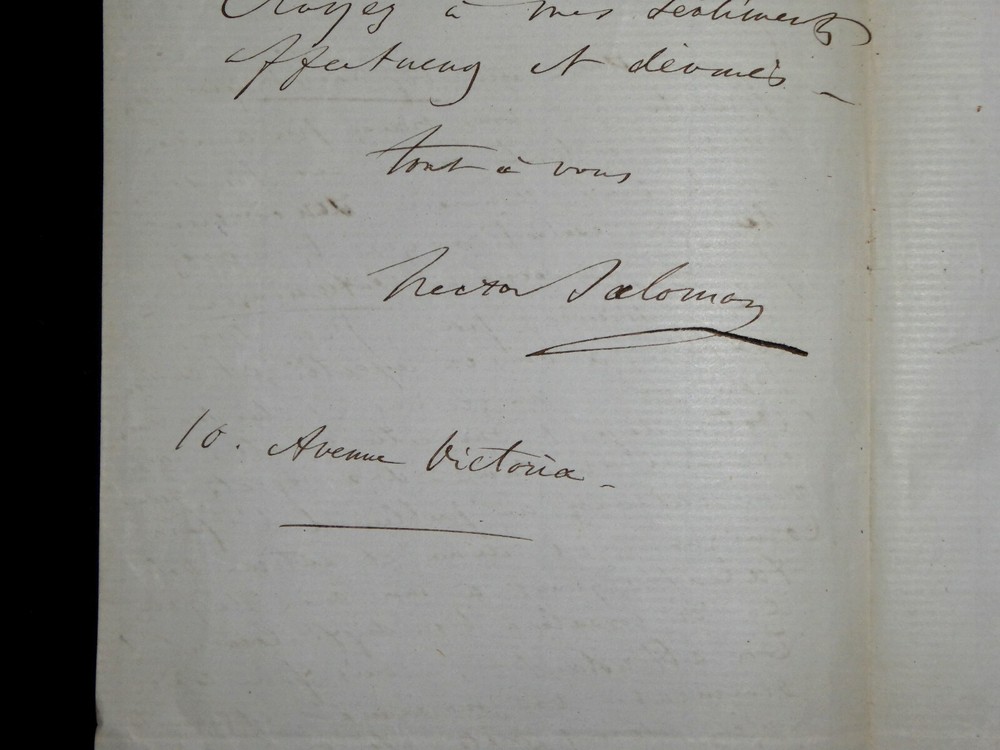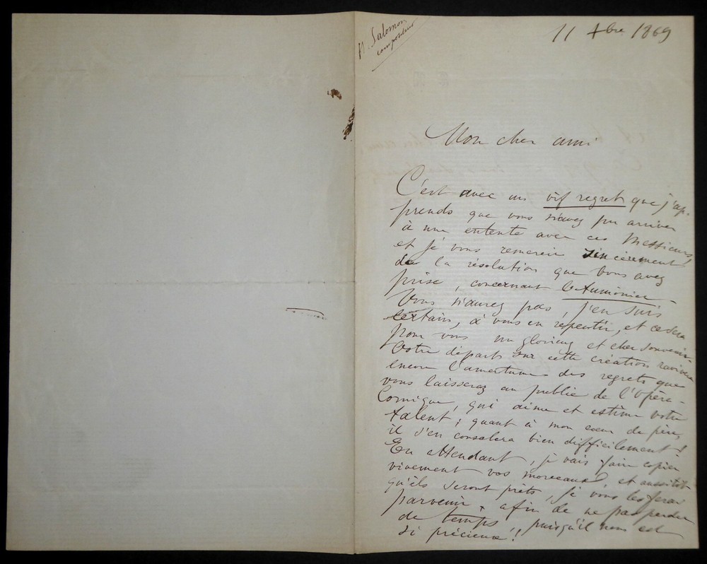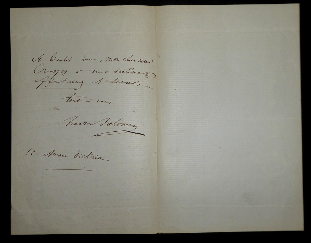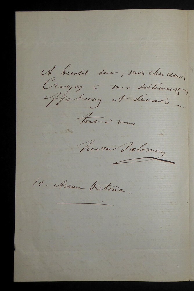 Hector SALOMON. Lettre autographe signée, 1869, Paris. Lettre en deux pages adressée à un confrère à propos de son départ de l'Opéra Comique. Il précise que son départ "sur cette création ravivera" les "lamentations" ainsi que des regrets de la part du public de l'Opéra qui "aime et adore votre talent". Dimensions : 13.5 x 20.7 cm. 2 pages. Etat : Bon état de conservation. Hector Salomon est un compositeur français, né à Strasbourg le 29 mai 1838 et mort le 28 mars 1906 à Paris. Il a été l’un des « Chefs du chant » à l’Opéra de Paris. Wikipédia Envoi soigné dans un emballage rigide et étanche. Satisfait ou remboursé. Si vous n'êtes pas entièrement satisfait, je reprends la marchandise avec retour à ma charge pour l'Europe et à la charge de l'acheteur pour le reste du monde. N’hésitez pas à visiter ma boutique et affiner vos recherches en fonction des catégories qui vous intéressent. Ma boutique L'Art Délivré. Lettres autographes, vieux papiers, livres anciens, photographies, gravures, timbres… Nous expertisons et/ou rachetons dans toute la France vos lettres, collections de lettres et livres anciens. Merci de votre visite. Jérôme KAYSER. Lettre en deux pages adressée à un confrère à propos de son départ de l'Opéra Comique. Il précise que son départ "sur cette création ravivera" les "lamentations" ainsi que des regrets de la part du public de l'Opéra qui "aime et adore votre talent". Hector Salomon est un compositeur français, né à Strasbourg le 29 mai 1838 et mort le 28 mars 1906 à Paris. Il a été l’un des « Chefs du chant » à l’Opéra de Paris. Wikipédia Satisfait ou remboursé. Si vous n'êtes pas entièrement satisfait, je reprends la marchandise avec retour à ma charge pour l'Europe et à la charge de l'acheteur pour le reste du monde. N’hésitez pas à visiter ma boutique et affiner vos recherches en fonction des catégories qui vous intéressent. Ma boutique Nous expertisons et/ou rachetons dans toute la France vos lettres, c