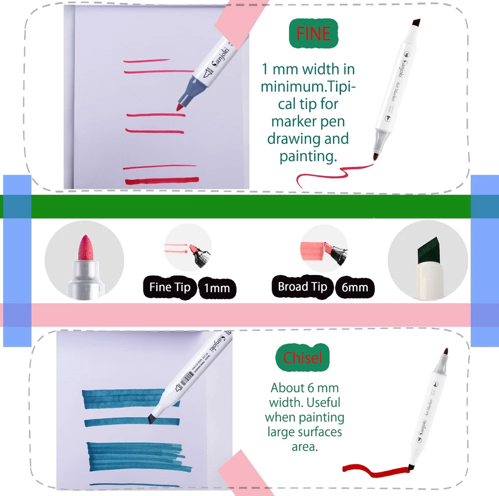 Dual Tips: Each pen features two tips. The chisel tip, which is 6mm wide, is perfect for covering large areas, while the fine tip, capable of drawing 2mm wide lines, is ideal for sketching. Whether for sketching, illustration, drawing, card making, design, or advertising, Sanjoki markers never fail to impress! SMOOTH BLENDING: Our high-quality, non-toxic ink blends seamlessly, enabling effortless creation of excellent artwork. With our premium ink, beginners can achieve smooth gradations more easily compared to other marker versions. DURABLE AND INNOVATIVE BOX:Our travel cases have been crafted to be foldable. By folding the top, the entire case can be leaned on the desk, allowing the colour numbers on the caps to be clearly displayed while our artists can remain comfortably seated. Additionally, you'll save on a pen holder, as our case itself serves as an excellent marker organiser. DRIES INSTANTLY AND NO SMUDGING:The wet ink will never spoil your work! Thanks to our premium alcohol-based ink, your artwork will dry promptly and will never fade over time. Sanjoki's well-crafted tips also guarantee smudge-free results." GREAT VALUE: With 120 vibrant markers included in the set, along with a two-way travelling bag, this set makes for an exceptional gift for special occasions. We stand behind our products with a 100% Satisfaction guarantee. If you are not completely satisfied with your purchase, please don't hesitate to contact us. We are committed to providing you with a solution that meets your needs and ensures your satisfaction.