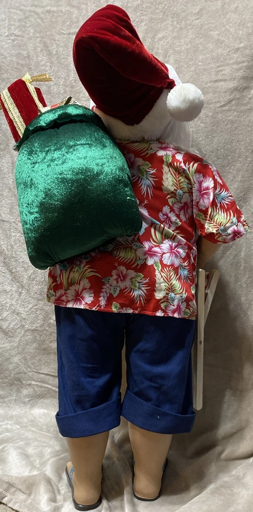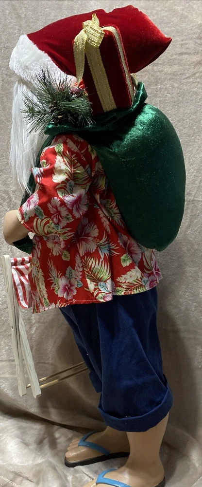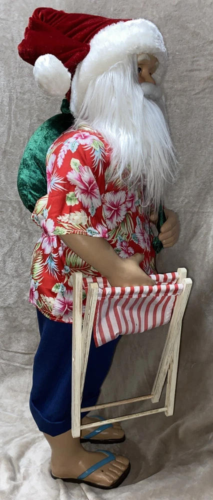 Beach Santa Claus 36” store display / greeter. He’s adorable and very well made. Wearing a Hawaiian shirt and carrying his sack of presents and his beach chair. Wearing his Santa hat and sunglasses can easily be added. Note the small spot on one of his feet. Other than that, no imperfections I see. Store Display Light weight not heavy Chair movable folds out Super cool display for office business Home school Great Christmas present Birthday gift Surf shop Surfer Beach home Resort Tropica Red and white striped Beach chair
