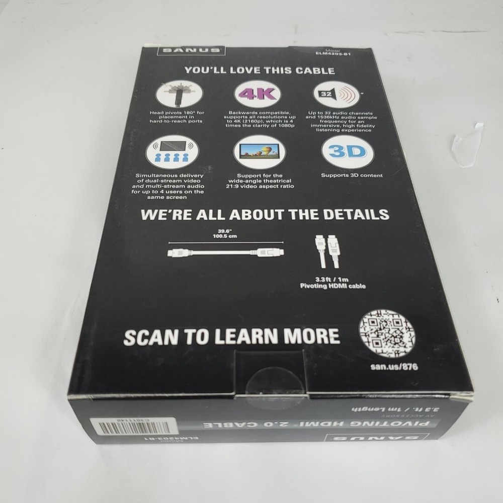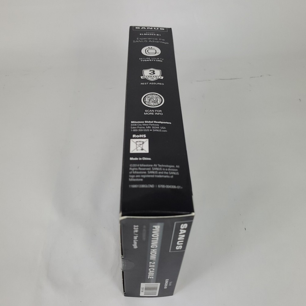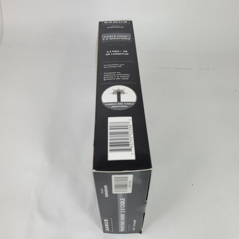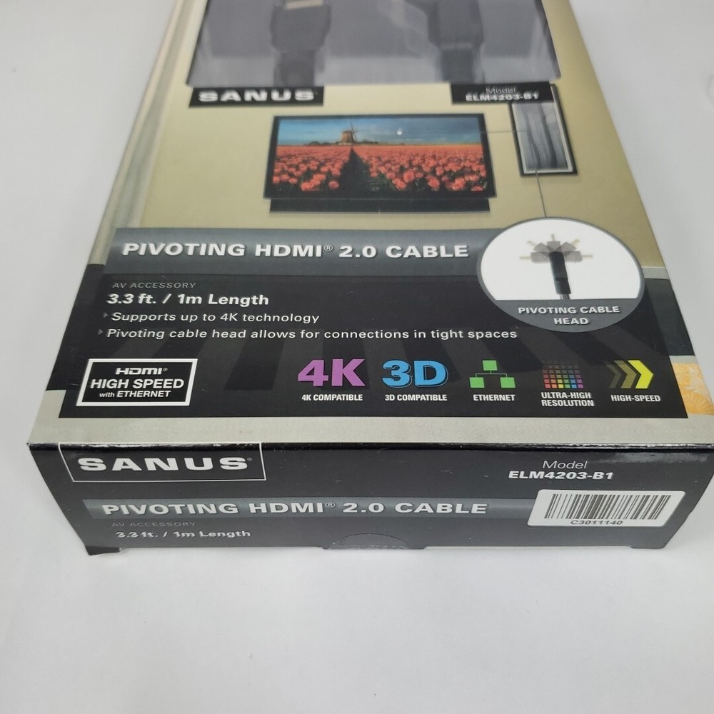 This SANUS ELM4203-B1 3.3 pivoting HDMI cable is designed for high-speed and 4K compatibility. Has a pivoting connector to avoid interferences with other objects and has a cable length of 3.3 ft. The HDMI 2.0 connector A and B provide a seamless connexion for your TV, video, and home audio needs. This cable is made in China and has an output voltage of 5V. The cable features a pivoting design and is designed for use with various devices. It is a great addition to your TV, video, and home audio accessories.