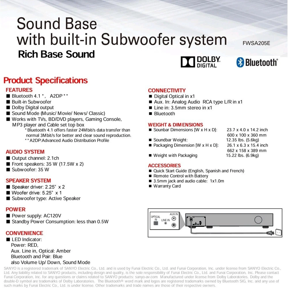 SANYO Sound Base with built-in Subwoofer System - FWSA205E - with Remote /cable