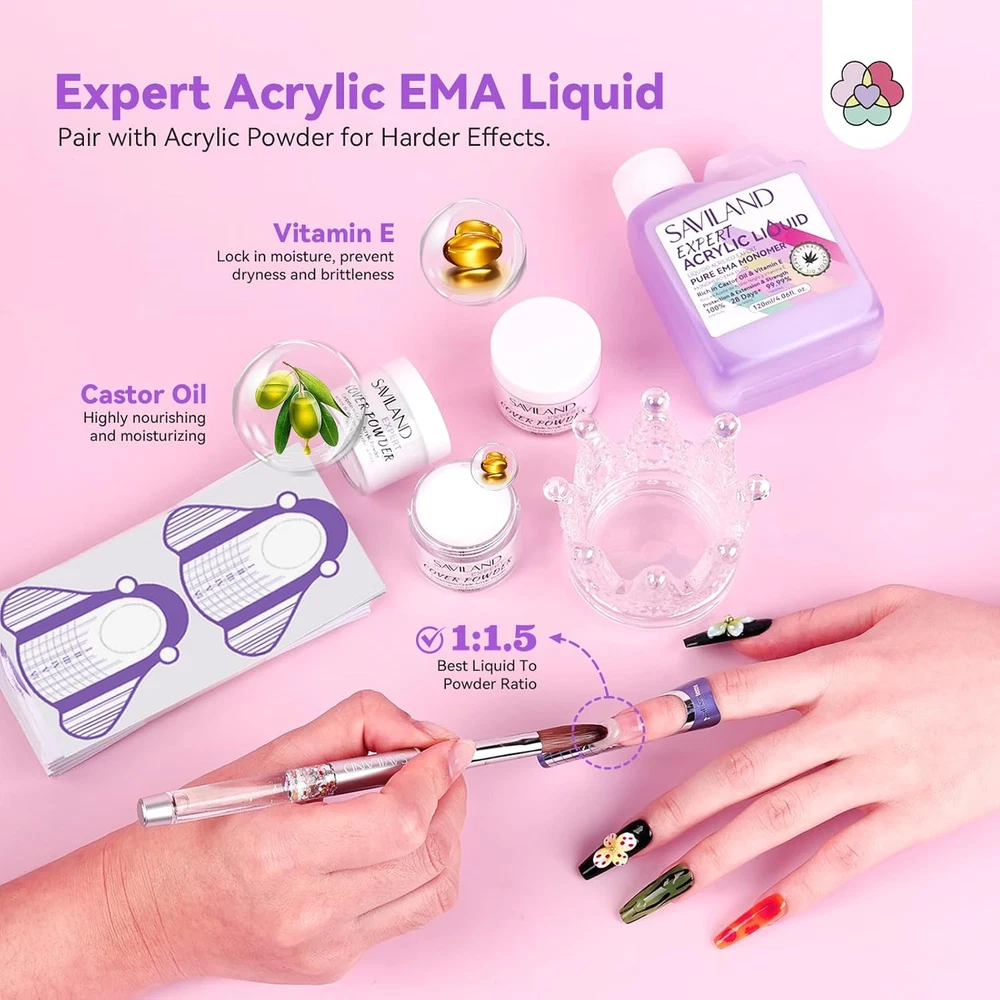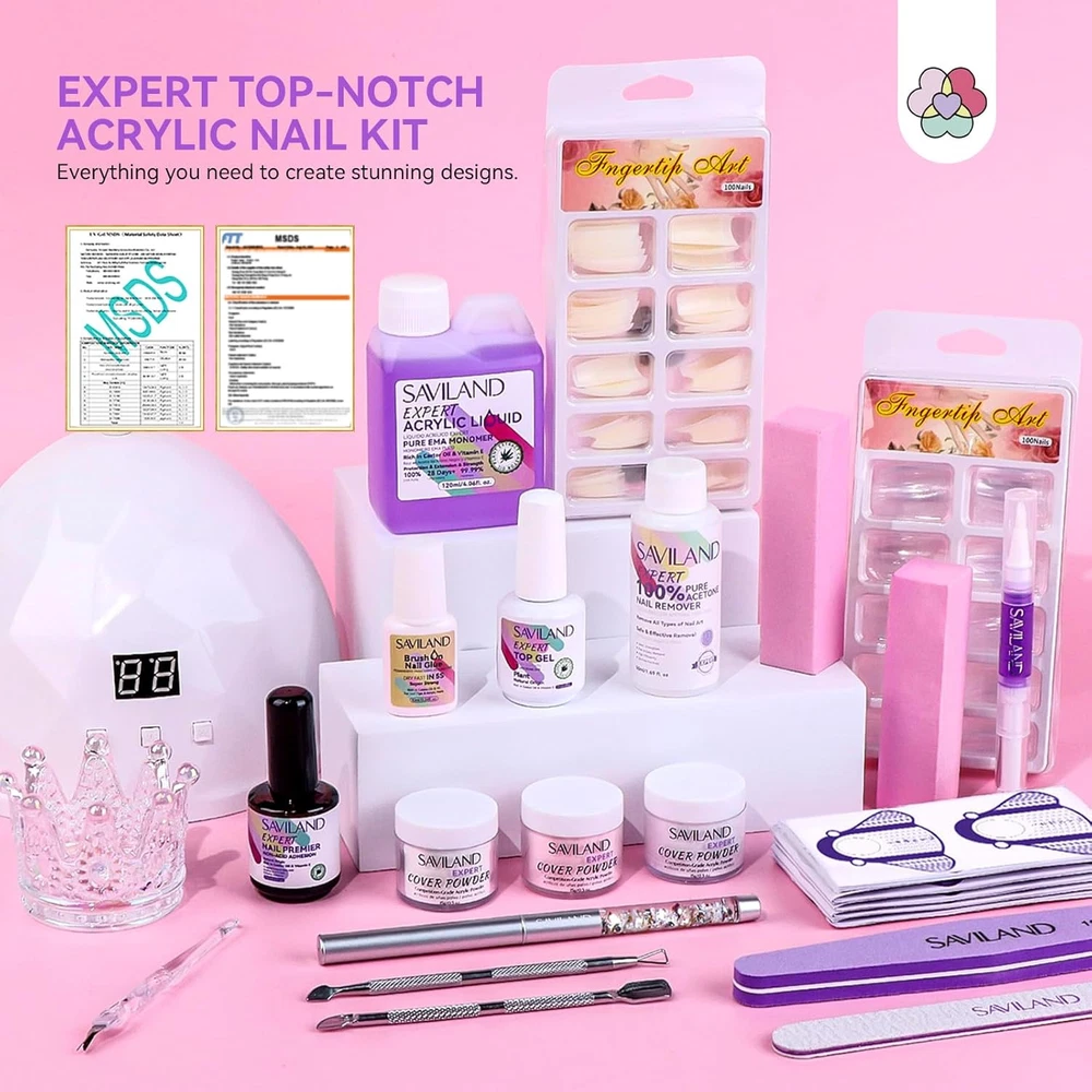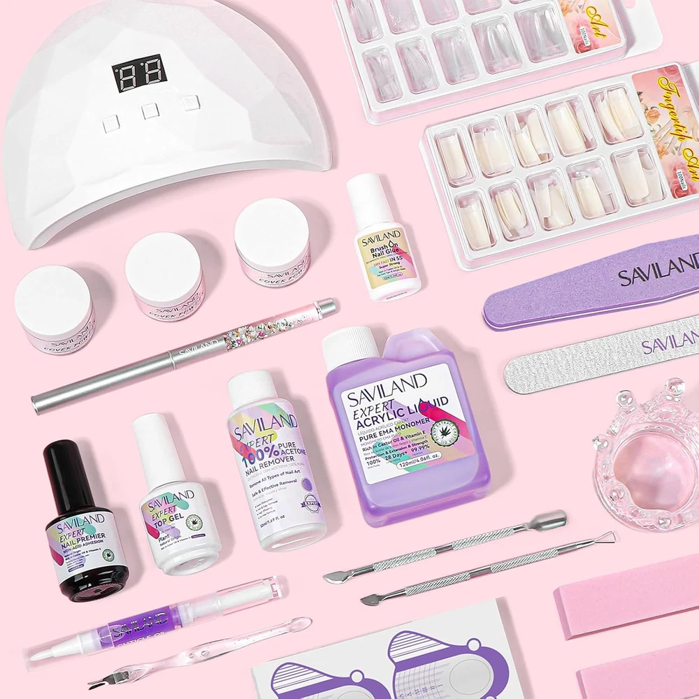 SAVILAND Plus Acrylic Nail Kit: Professional Nails Kit Acrylic Set Clear White Pink Acrylic Powder and Liquid Set with U V Nail Lamp Nail Remover Acrylic Nail Starter Kit for DIY Home Use Description Features: Top Notch Acrylic Nail Kit: This Acrylic Nail Kit comes with Acrylic Powders, Acrylic Liquid, Nail Remover, Nail Primer, Top Gel, Nail Glue, Nails Tips, Acrylic Nail Brushes, Cuticle Oil Pen and other Acrylic Nail Supplies. Perfect choice for beginners home DIY nail art Acrylic Powder and Liquid Set: SAVILAND Acrylic Powders includes 3 colors: clear/pink/white. The Acrylic Liquid used with Acrylic Powder can create a protective and hard layer to cover and protect your natural nails, ensuring 28 days of durable wear Quick & Efficient Nail Remover: Nail remover makes removal faster and more efficient, easily dissolving tough gel, including builder nail gel that can be difficult to remove Bring the Salon Home: The Nail Primer can give your manicure a healthy and natural appearance and Top Gel is like the armor of the manicure, which not only makes the manicure more shiny and can protect the manicure.The quick-curing U V Lamp for gel nails ensures convenience and portability Professional Tools for Stunning Nails: The French Nails Tips are made of high quality ABS plastic, sturdy and durable. You can use 5s quick-drying super Nail Glue together with French Nails Tips, which can achieve stunning nail without the need for long drying times Product Details: Package Dimensions : 12.83 x 6.1 x 4.69 inches; 2.49 Pounds Manufacturer : SAVILAND Handling We will ship all orders within 3 business day of payment. Delivery We take pride in offering fast and reliable delivery for your orders! We are committed to getting your products to you as quickly as possible. Generally, we would like to inform you that all orders will be delivered to you within 1-3 business days after processing.However, in some cases, delivery times may vary depending on the buyer's location. Especially in remote or rural areas, the expected delivery time may be extended. In such situations, we do our best to ensure that your order reaches you as quickly as possible.If there are any delays, we will be happy to contact you to explain the situation. Our goal is to enhance your satisfaction with our fast delivery times. We work diligently to ensure that your order arrives safely.Trust us and enjoy our speedy delivery! Return Policy All items qualify for returns within 30 days of receipt. Buyer is responsible for return shipping on any item that is not damaged. Feedback We take our reputation seriously, we buy and sell online, so we understand the value of trust. If you are unsatisfied with your order, please contact us and we will work with you to resolve it to your satisfaction.