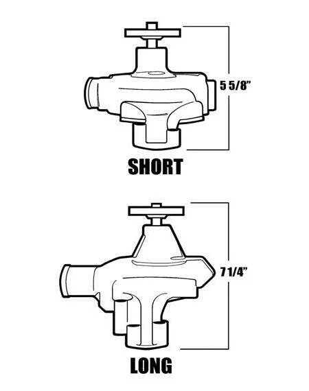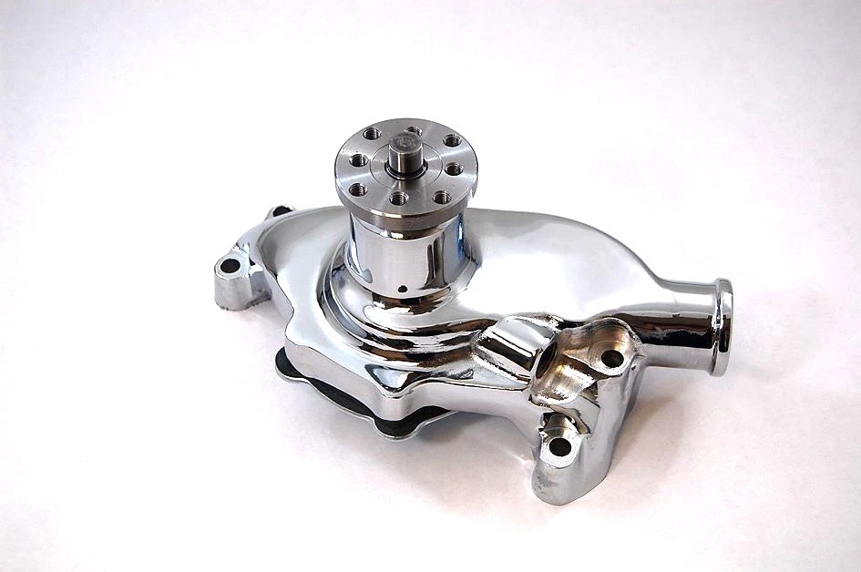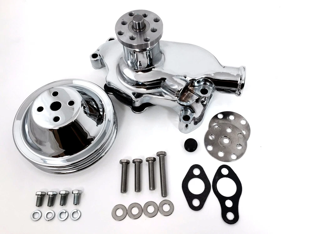 SB Chevy Water Pump "Short" Style & Chrome Double Groove Pulley High grade aluminum water pump, this pump will flow up to 40% more coolant than stock pumps, it will dissipate heat better than the regular OEM cast iron pumps, also lighter. This pump features high quality roller bearings, custom impeller for maximum water flow and reduced cavitation at high RPM's. This pump will clear cam belt drives and most blower drives. High Quality Chrome Plating! Pump Features: Application: This Pump Originally Came on: 1955-68 SB Chevy 283-350 V8 Passenger Cars, 1969-70 Corvettes with 350 V8 Engines, 1955-1972 Light Duty Trucks with 350 V8 Engines, However, this pump will fit all SB Chevy blocks up to 1985. Material: Aluminum. Finish: Chrome. Specs: 5/8" Pilot, 1/2" NPT side port. Pulley Flange: Dual Bolt Pattern. Package: Water Pump, Gaskets to mount to block & Plug. Rotation: Standard. Kit Includes: Chrome Aluminum Water Pump Pulley Shims (2) 1/2" NPT Plug Stainless Water Pump Bolt Kit - Hex Polished Gaskets to Mount to Block (2) Chrome Pulley - Double Groove Pulley Bolts & Lock Washers - Hex (4) *NOTE: Please make sure this is the correct pump you need before buying, this is a "SHORT" water pump, it measures 5-5/8" from engine block to pulley flange (see picture attached), there is a LONG pump also available in our store.