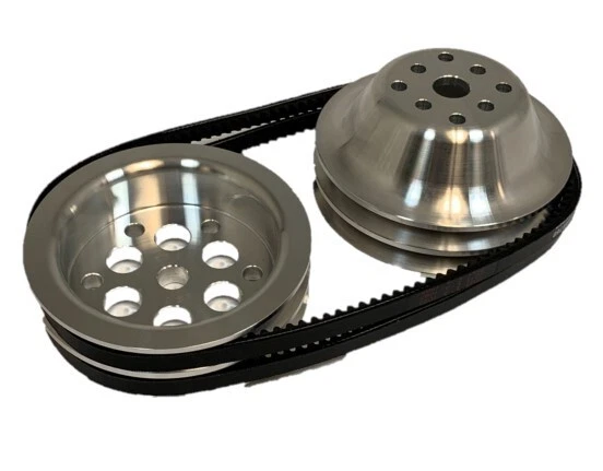 ARC 15410 SMALL BLOCK CHEVY ALUMINUM PULLEY KIT Short Style Water Pump, 1:1 ratio New cast aluminum pulley set for small block Chevy's. For "short" style water pumps. Double V-belt groove. Kit includes water pump pulley and crankshaft pulley plus matched pair of heavy duty belts and bushing for water pump shaft. Lightweight machined cast aluminum 1:1 speed ratio for maximum cooling Reduces impeller speed helping prevent cavitation Improved high RPM cooling Deep grooves for superior belt retention Fits water pumps with either 5/8" or 3/4" shaft (comes with bushing to fit 5/8" shaft) Please note that the crank pulley in these kits will require 3/8" bolts (not included) due to increased thickness (Allen head type bolts recommended). KMJ PERFORMANCE - TECH AND RETURNS - Please use the eBay messaging system for any returns or technical assistance MONDAY-FRIDAY: 8:00AM-5:00PM SATURDAYS: 8:00AM-4:30PM (CST) Click on store image to view our current listings of High Performance Products! Payment: Please make payment within 7 days of purchase. Paypal and Visa/MC/Discover credit card payments are accepted. Please use the eBay message system if you have any questions or need assistance. PAYPAL PAYMENTS - The majority of Paypal payments can be processed within 2-3 hours after received during our normal weekday business times. To prevent any delays with your order you should watch for the following common issues: Be sure your shipping address has a physical address that Fedex/UPS can deliver to. Addresses that only have a PO Box can cause long delays and almost always result with having to credit/cancel the order in the end. You should be able to add one onto your payment when going through the payment process. Be sure the shipping address is correct when making payment. Shipments will go to the address that comes through on the payment. Within a short time it may be already shipped and on the way. Some of our listings may request a "note to seller" to let us know if you have a certain preference or need a specific thing such things as sizes, colors, etc. Putting a note on your Paypal payment is the best way to insure it should not be missed. In order to comply with Paypal's buyer/seller protection policy, any (single) payment having a total of $750 or more must be sent with signature confirmation on delivery. This applies to all packages that may be associated with the payment. If the ord er requires multiple packages someone will need to sign for each one. If you find there is any problem with your payment or order we recommend calling us during normal business hours if at all possible. If you miss us during regular hours you can leave a voice mail message on our phone system. While we do our best to keep up with eBay messages, during times of heavy volume an order can get processed and shipped before we're able to get through them all to stop or change an order. Shipping: Unless a listing is set up that allows calculated shipping for other locations, the shipping amount given for an item will be ground shipping to the lower 48 states only. We do not offer any next day, air freight, or other expedited services on eBay orders. We try and combine EBay auctions when possible. Normally it will be the highest shipping amount plus half the shipping amount on other items, sometimes better on orders of small items. Some items are not combined due to size or weight such as crankshafts, torque converters, radiators, cylinder heads, etc. On multiple item purchases the shipping amount is not figured automatically during checkout so please request a new invoice or wait for us to send a combined invoice so we can adjust the total. We may have auctions that state free shipping when purchased with certain items. If purchasing items with free shipping, please request a new invoice before paying . The shipping amount is not figured automatically during checkout. We are unable to refund your Paypal once payment has been sent. If you have any doubt what your shipping will be please feel free to message us during business hours. Powered by SixBit's eCommerce Solution