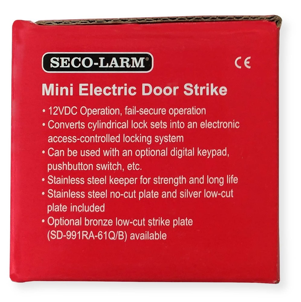 SD-991A-D1Q Mini No-Cut Door Strike For Indoor Use, Converts Cylindrical Lock Sets Into an Electronic Access-controlled Locking System, Stainless Steel Keeper Key Features Converts cylindrical lock sets into an electronic access-controlled locking system Fail-secure operation - Door remains locked if power to the strike is lost 2-wire installation, non-polarized connection Stainless steel keeper for strength and long life Includes Stainless Steel No-Cut and Silver-Colored Aluminum Low-Cut Strike Plates Can be used with virtually any cylindrical door locking system Can be used with an optional digital keypad, pushbutton switch, and other entry devices Suitable for office-type applications Reversible non-handed design fits either right-hand or left-hand doors Shallow design for use with most metal doors Powered by a solenoid, not a buzzer coil For indoor use Specifications Operating Voltage: 12VDC Current Draw: 280mA12VDC Static Strength: 1,000-lb (454kg) Endurance: 250,000 Cycles (Factory tested) Latch Throw: 1/2" (13mm) Operating Temperature: 14°~120°F (-10°~49°C) Operating Humidity: 0~85% (Non-condensing) Dimensions: Stainless Steel No-Cut Plate 2-3/4"x1-1/8"x15/16" (70x28x24 mm) Fail-secure operation - Door remains locked if power to the strike is lost Includes Stainless Steel No-Cut and Silver-Colored Aluminum Low-Cut Strike Plates Can be used with virtually any cylindrical door locking system Can be used with an optional digital keypad, pushbutton switch, and other entry devices Reversible non-handed design fits either right-hand or left-hand doors