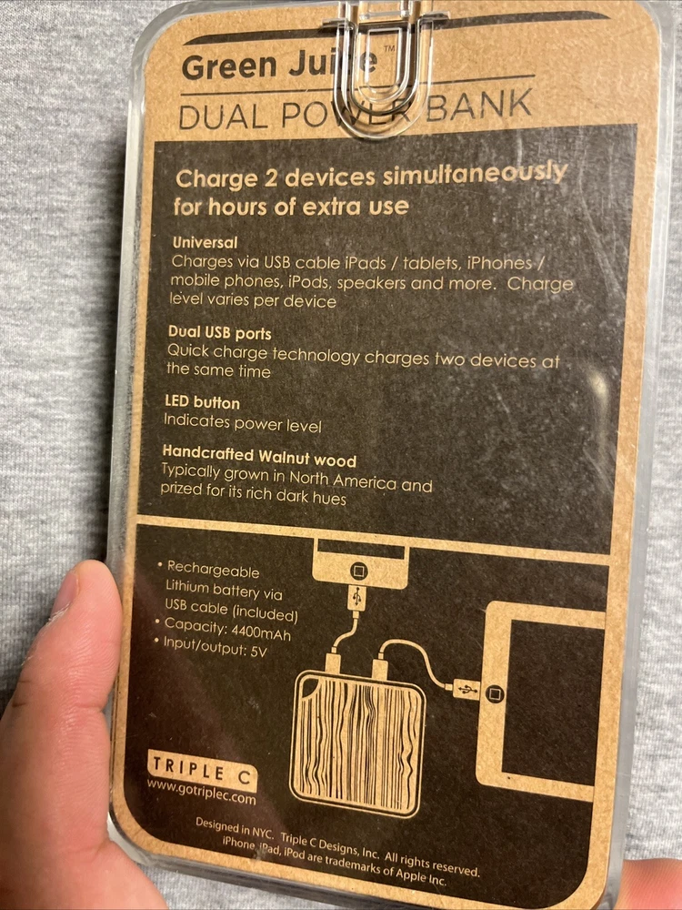 Type:Power Bank Charger / Battery Back upBrand Name:Triple C DesignsPower Capacity:4400mAhBrand:Triple C Green Juice ZebrawoodConnectivity:Dual USBModel:ASN617W5Compatible Model:UniversalCompatible Brand:UniversalMPN:AZ595A111355485-us, ASN617W5Number of Ports:2Items Included:Charging CableVoltage:4400mAhColor:Zebrawood / Black