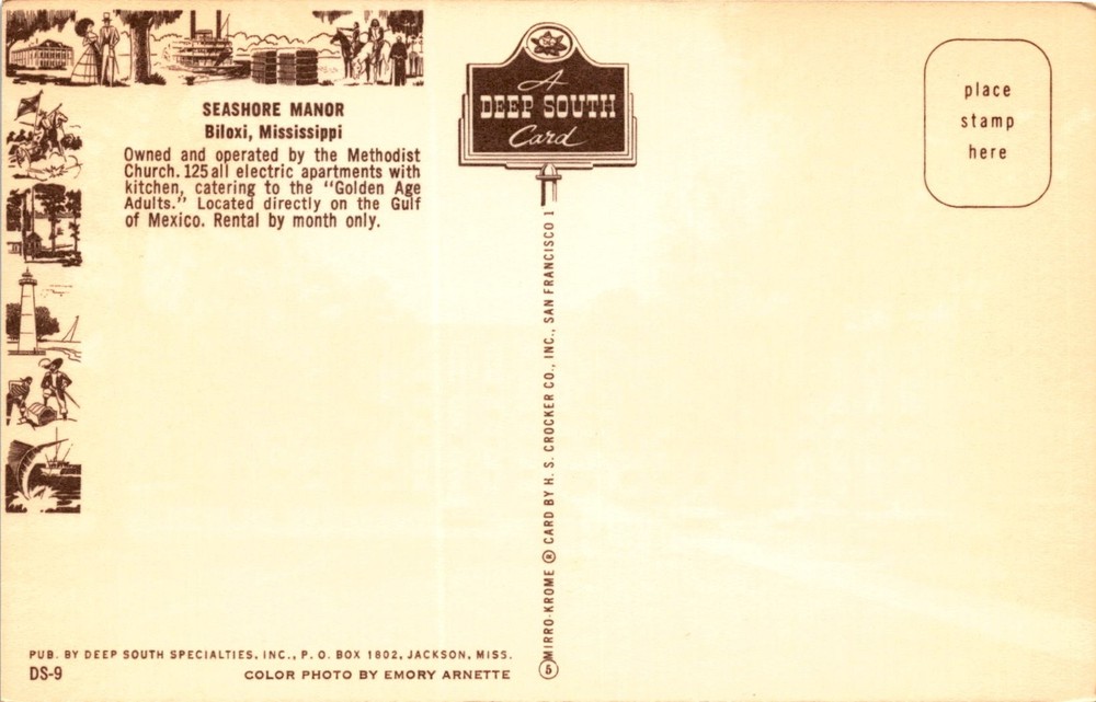 The postcard features Seashore Manor in Biloxi, Mississippi, which is owned and operated by the Methodist Church. It consists of 125 all-electric apartments with kitchens, catering specifically to the Golden Age Adults. The facility is located directly on the Gulf of Mexico and offers rentals by the month only.