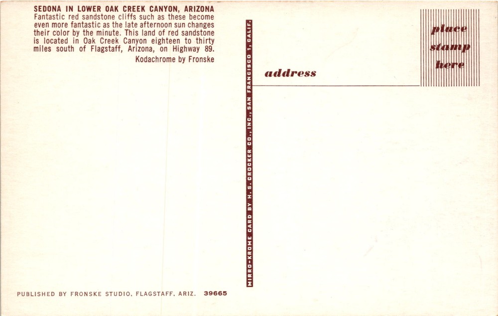 MAKE AN OFFER. THE MORE YOU BUY THE BETTER DEAL I WILL ACCEPT The postcard depicts Sedona in Lower Oak Creek Canyon, Arizona, known for its fantastic red sandstone cliffs that change color in the late afternoon sun. Located 18 to 30 miles south of Flagstaff on Highway 89, this area is a popular tourist destination for its stunning natural beauty.