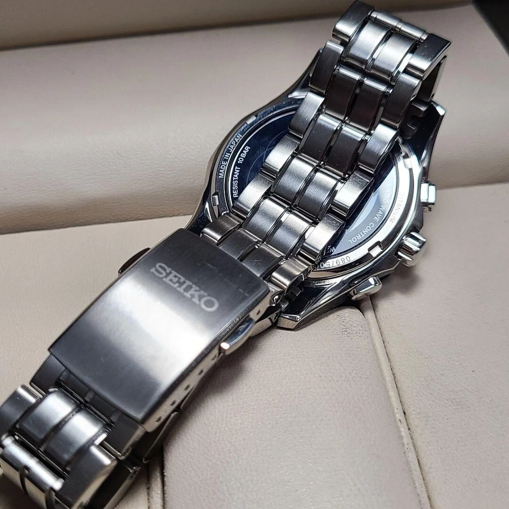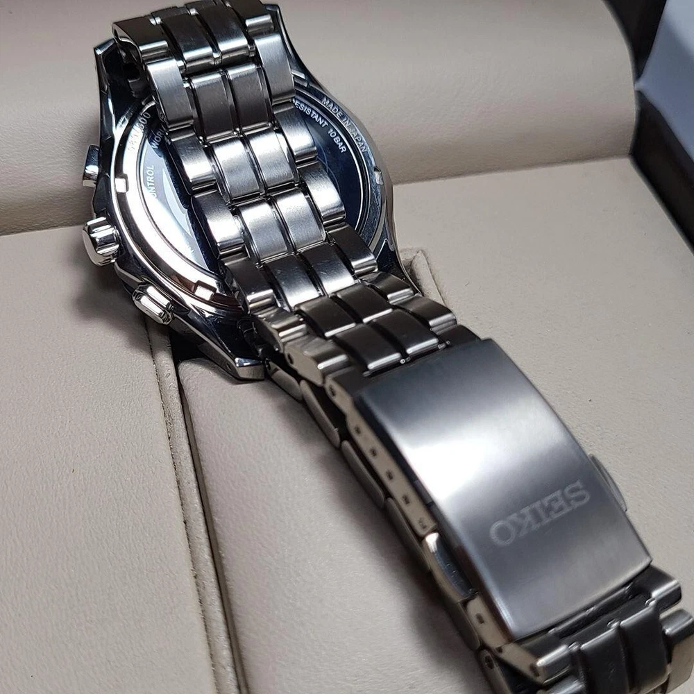Band Color: Silver Dial Color: Blue Water Resistance: 100 m (10 ATM) MPN: Does not apply Watch Shape: Round Department: Men Brand: Seiko Customized: No Display: Analog Case Material: Stainless Steel Type: Wristwatch Case Size: 40 mm Band Material: Stainless Steel UPC: Does not apply Year Manufactured: 2008 Country/Region of Manufacture: Japan Movement: Radio Wave Solar Features: 12-Hour Dial Model: Seiko Solar Reference Number: SAGA019 Case Color: Silver gtin13: Does not apply