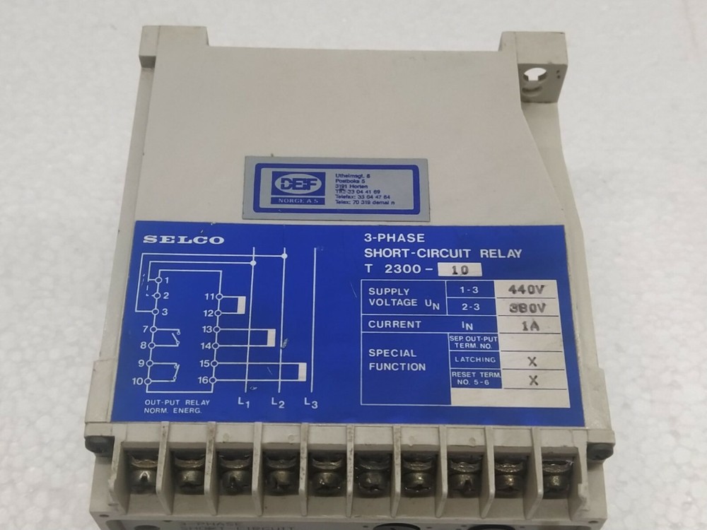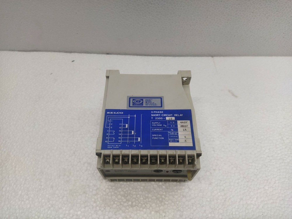 We are pleased to offer SELCO T2300-10 3-PHASE SHORT CIRCUIT RELAY 440V Product Detail: SELCO T2300-10 3-PHASE SHORT CIRCUIT RELAY 440V MODEL: T2300-10 TYPE: 3-PHASE SHORT-CIRCUIT RELAY SUPPLY VOLTAGE: 1-3:- 440V SUPPLY VOLTAGE: 2-3:- 380V CURRENT: 1A Shipment processing time: All orders are processed within 1-2 business days. Orders are not shipped or delivered on weekends or holidays. Shipment confirmation & Order tracking: You will receive a Shipment Confirmation email once your order has shipped containing your tracking number(s). The tracking number will be active within 24 hours. Customs, Duties and Taxes: We are not responsible for any customs and taxes applied to your order. All fees imposed during or after shipping are the responsibility of the customer (tariffs, taxes, etc.). Damages: In case of damage or lost of shipment during transit, We will investigate the matter and provide the satisfactory resolution. Returns Policy: We offer return or exchange of ordered item up to 30 days of receipt of goods in subject to certain condition. In case of damaged goods we shall offer the replacement or refund for the ordered item. If you require any more details, request you to send us the direct message through eBay for early resolution. Thanks