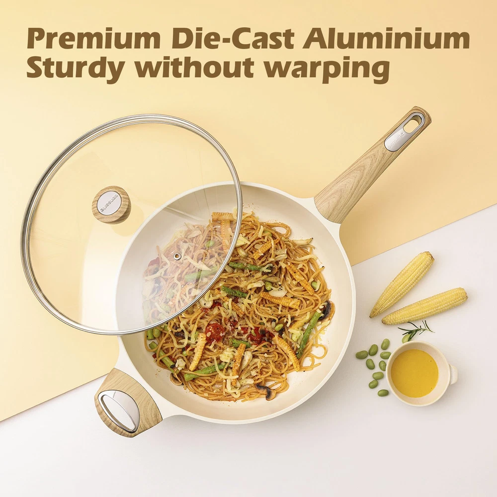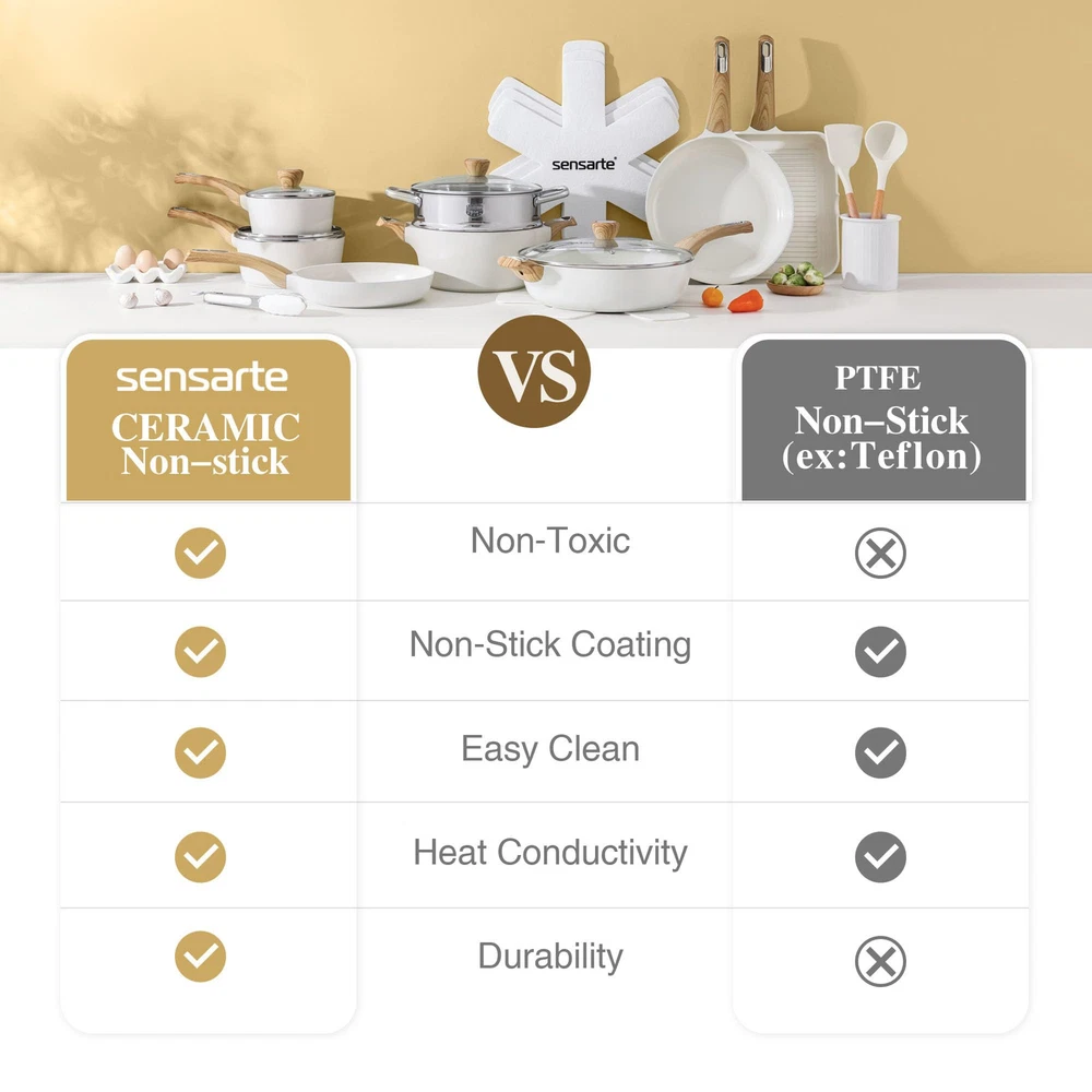 Healthy Ceramic Cookware Sets - SGS approved. Non-toxic, free of PTFE, PFAS, PFOA, PFOS, lead, cadmium and other toxic substances that can leach into food. Naturall Nonstick - Ceramic non-stick is healthier and scratch-resistant with excellent food release. Only less oil is needed for cooking, for a healthy, low-fat diet. 20-Piece Pots and Pans Set Includes - 9.5 & 11 inch frying pan set, 5Qt saute pan with lid, 4.5Qt casserole with lid & steamer, 1.5Qt & 2.5Qt saucepan with lid, 11 inch grill pan, Silicone spatula & spoon & tong, 5pcs pot protectors. Induction Compatible - 4.8mm thick stainless steel pan bottom makes this cookware set suitable for all stovetops. Die-cast aluminum construction allows the pan to heat up quickly and evenly, keeping the heat consistent. No warping and durable. Easy to Clean - Simply wipe with a paper towel or rinse with water, hand washing is recommended as it cleans effortlessly. Stay-Cool Handle & Glass Lid - The anti-scald wood-grain Bakelite handle is ergonomically designed for comfort and ease of handling. The explosion-proof glass lid prevents splashing and ensures maximum visibility.