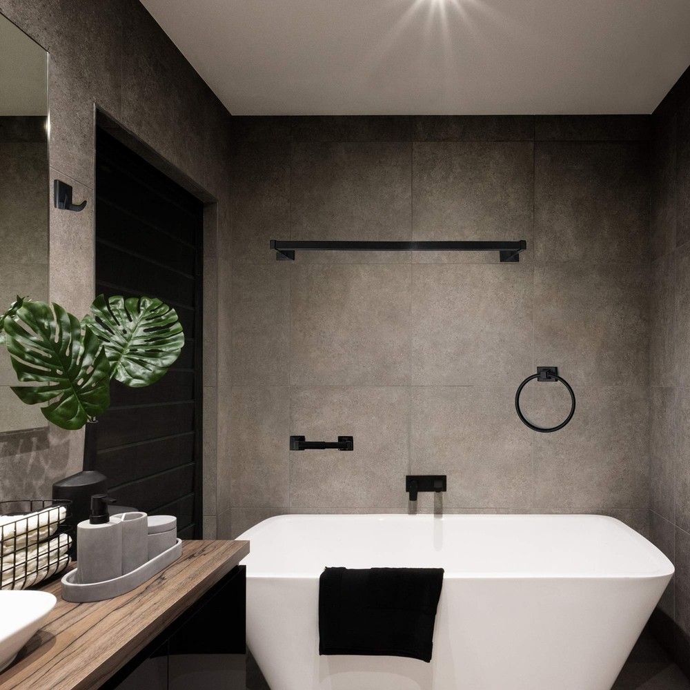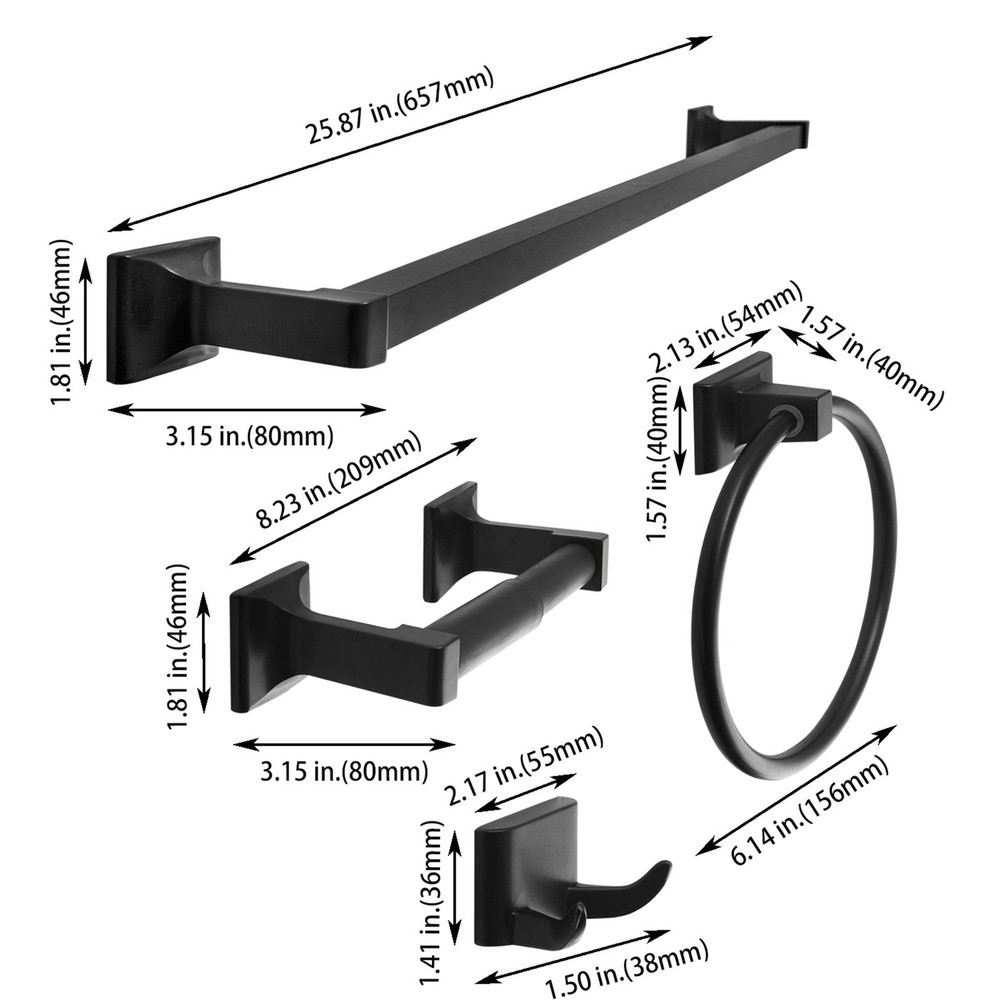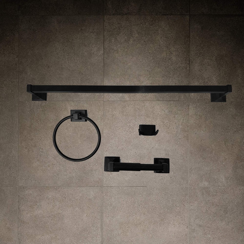 ALL METAL CONSTRUCTION - Fabricated with HEAVY DUTY Die Cast Zinc, ensuring durability and longevity. ISO 9001 and ISO 14001 certified manufacturer. Therefore, this bathroom hardware set is the perfect solution to your bathroom use issues. SURFACE FINISH - SENTO bathroom accessories set is hand polished with every detail. Hight quality plating process passing with 96hrs salt spray testing. The 4-piece set designed out of solid metal that is finished in beautiful Matte Black. This will allow the one complete set to stand the test of time. EASY TO INSTALL - SENTO accesorios de baño is super easy to install and can be fitted in just a few minutes. Installation kit set includes mounting brackets, mounting screws and drywall anchors, and with manual to help make the job easier. SEAMLESS CONNECTION - For any decorative style, our bath hardware set concealed posts make the bathware looks more elegant and stylish. It has simple and classic look with concealed screw design at the base of the holder. 4 PIECES BATHWARE SET INCLUDES: 24-inch Towel Bar, Standard Toilet Paper Holder, Towel Ring, and Robe Hook. Classic design is ideal for bathroom, outdoor shower and remodeled bathroom closet, kitchen cabinet, Laundry room, sitting room, etc.