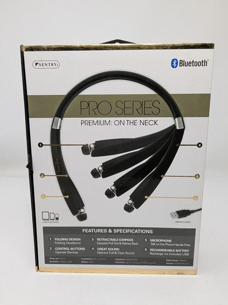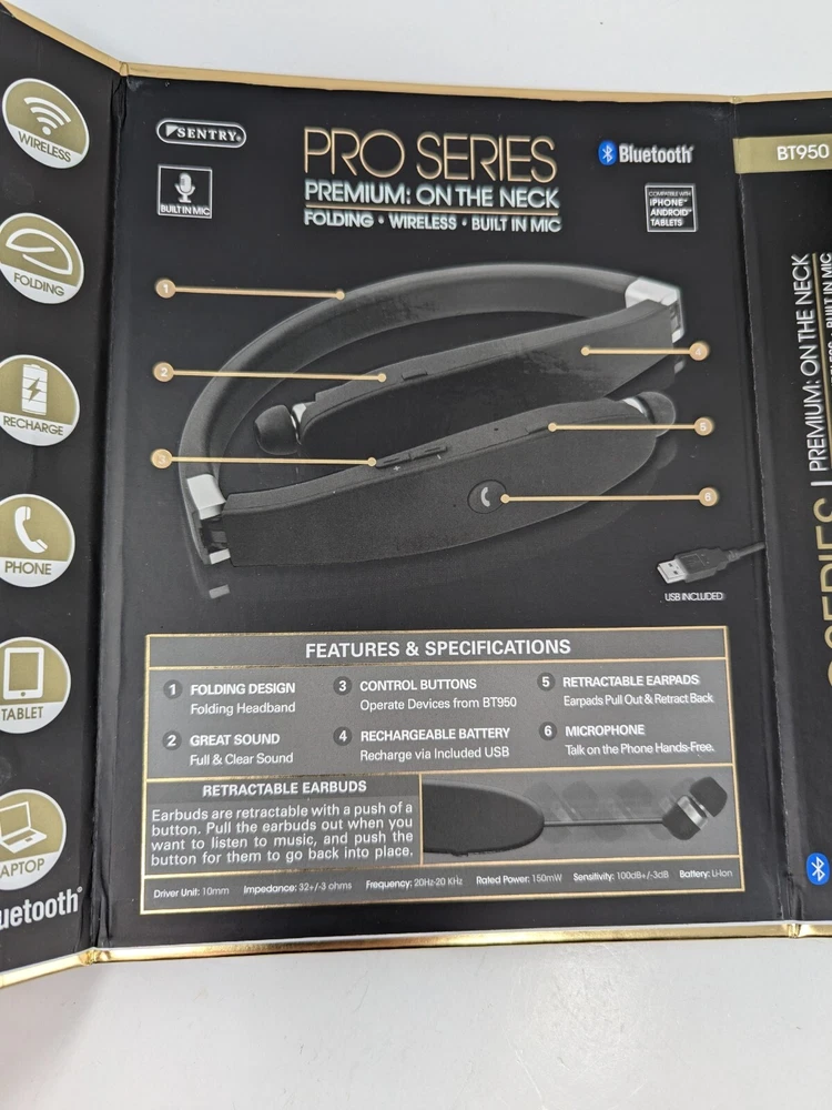 MPN:BT950Suitable For:ListeningYear Manufactured:2010sgtin13:080068549505Color:BlackUPC:080068549505Type:Earbud (In Ear)Features:Built-in Microphone, Foldable, WirelessNumber of Earpieces:DoubleMicrophone Type:Built-InWireless Technology:BluetoothCountry/Region of Manufacture:ChinaModel:BT950Brand:SentryConnectivity:BluetoothForm Factor:Neckband