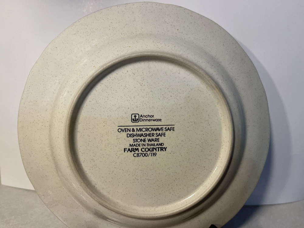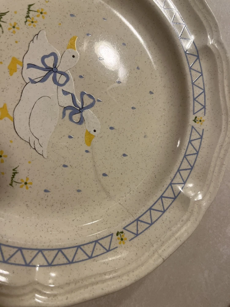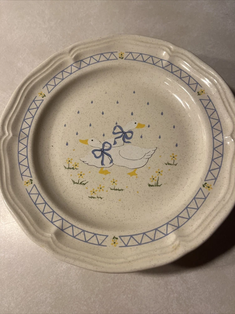 Add some vintage charm to your table setting with this set of 3 Farm Country Goose Salad/Dessert plates. The plates have a diameter of 7.5 inches and feature a colorful geese pattern that will make your meal presentation more appealing. These plates are made of stoneware and are durable enough to withstand everyday use. One of the 3 has a visual heat crack (see pictures)