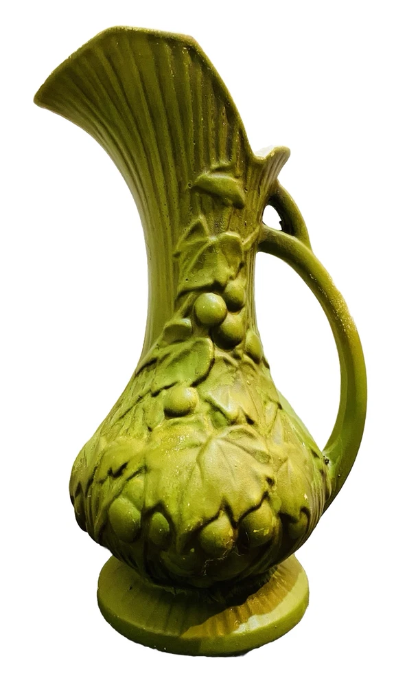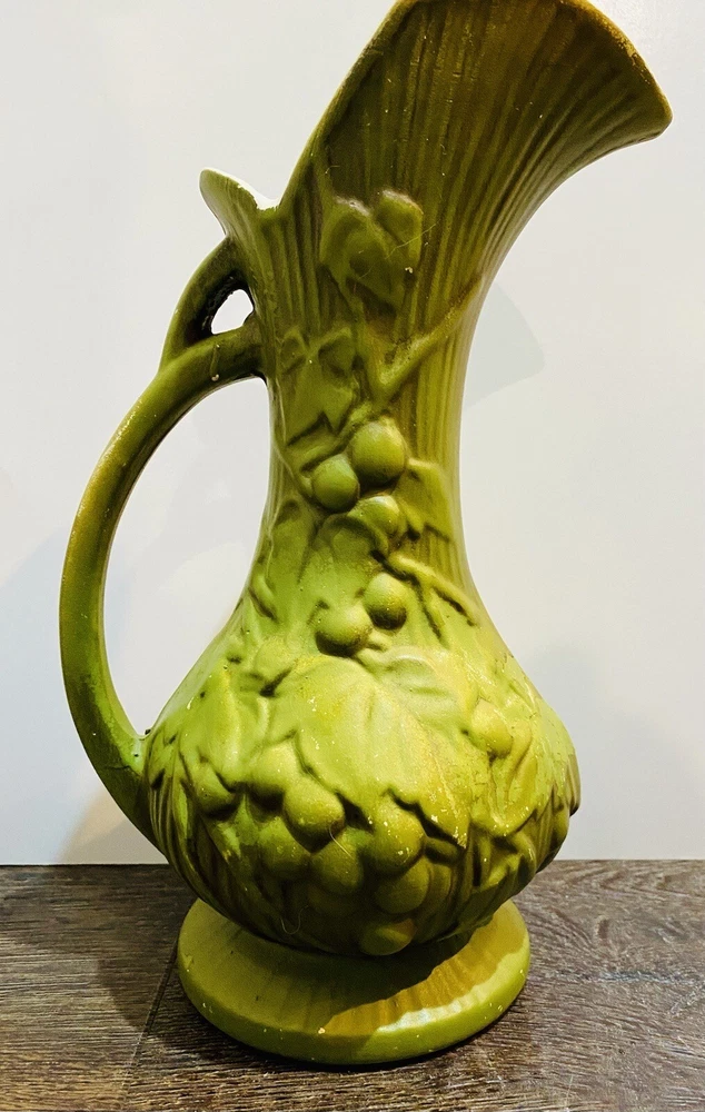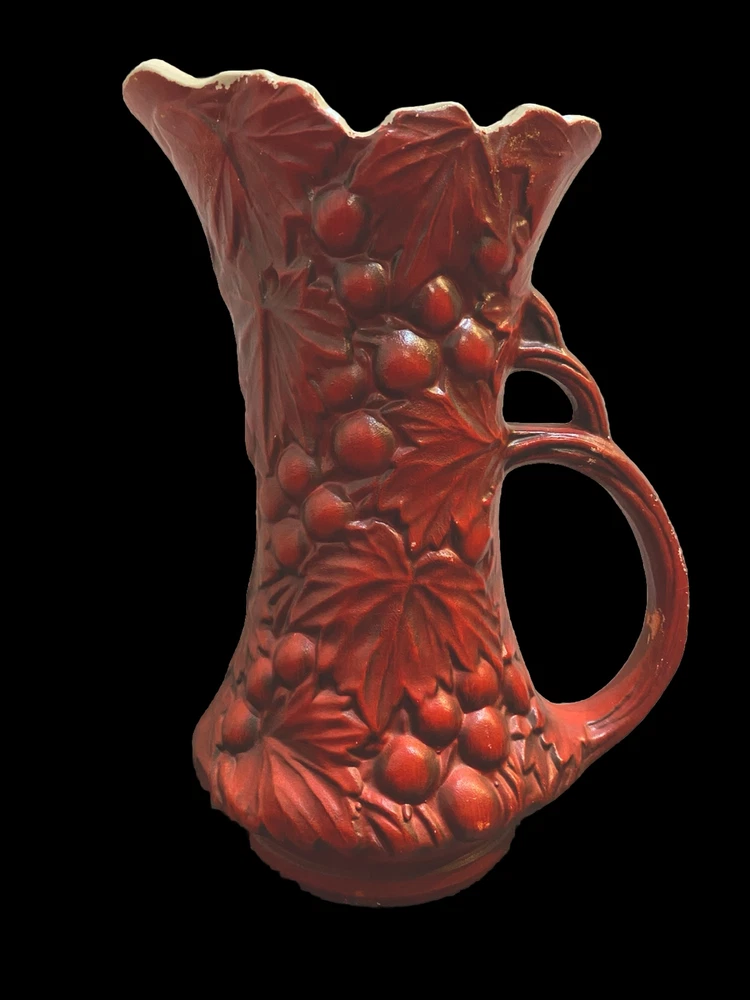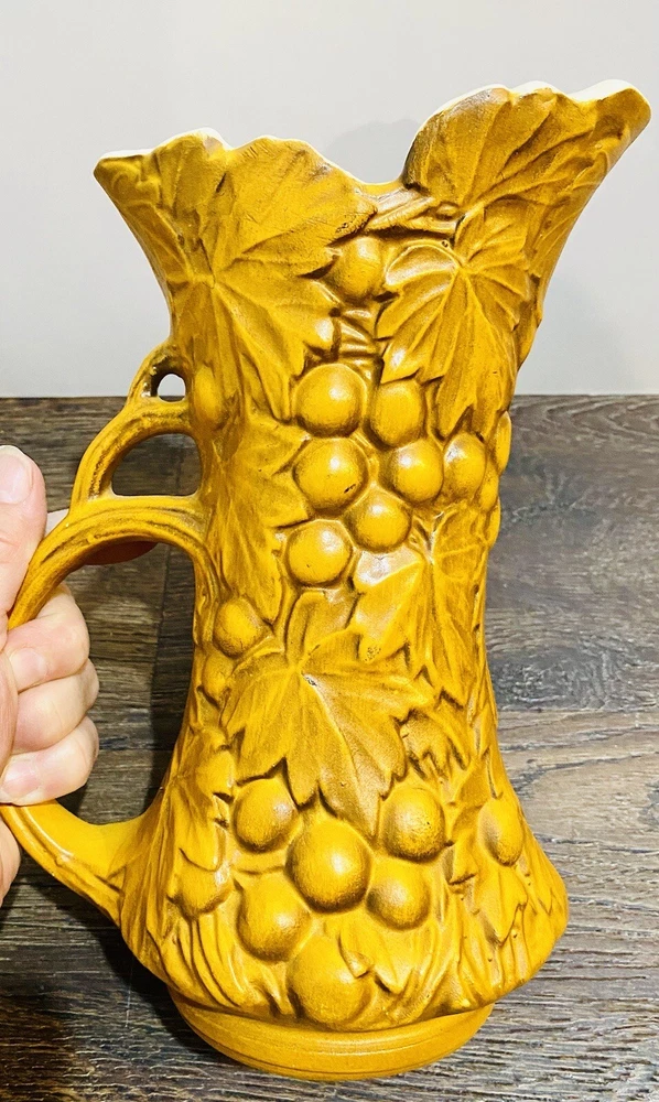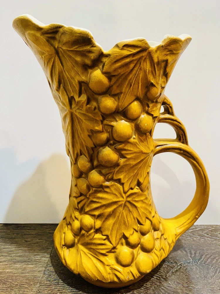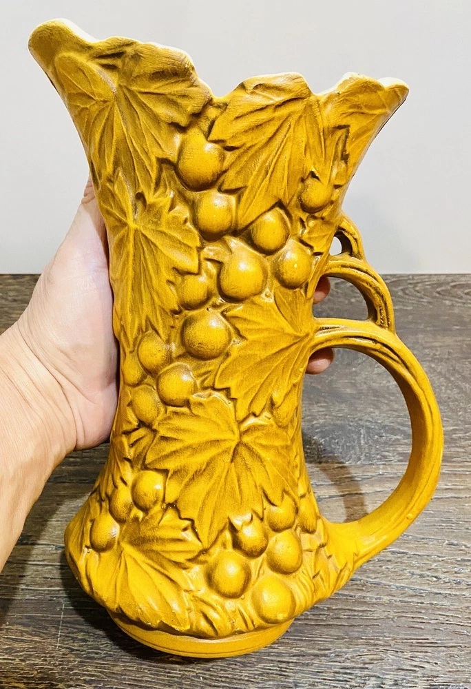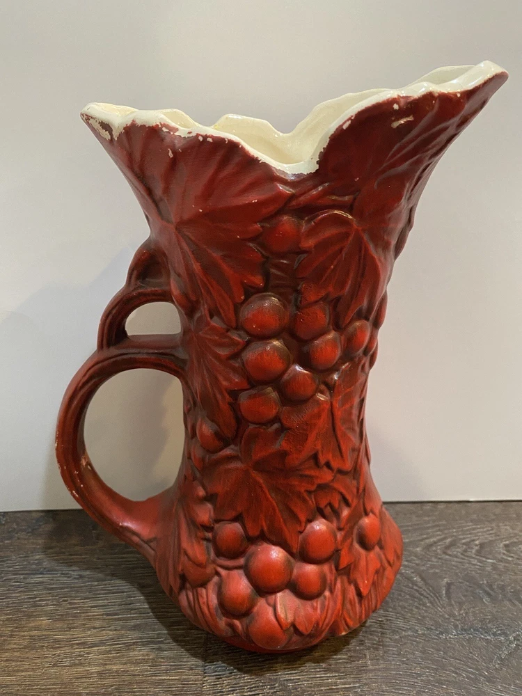 There is paint fading and imperfections with the vases. Please view all pictures as reference. Add a touch of vintage charm to your collection with this beautiful set of three McCoy Pottery Pitchers. Each pitcher features a glossy finish with a pattern of grapes and leaves in vibrant shades of yellow, red, and green. Handmade in the USA in the 1950s, these pitchers are a true representation of art pottery production technique. They have been well-preserved over the years and are in great condition. The item has a unique style and is perfect for both decorative purposes and serving drinks. Please read before bidding/buying: My items are usually pre-owned or vintage items and show signs of wear from years of use and storage --not brand new condition. Please take this into consideration when buying. I try to describe the item as accurately as possible and provide several pictures so you can determine condition. I am not familiar with everything so please ask questions before buying or let me know if you think I've overlooked any details. Items are sold as is with all sales being final. Payment is expected within 5 days or an unpaid item case will be opened with Ebay. I always leave feedback upon receiving feedback. This is how I know all is well and you're item arrived in good order. Thanks for your interest. **All reasonable offers considered**