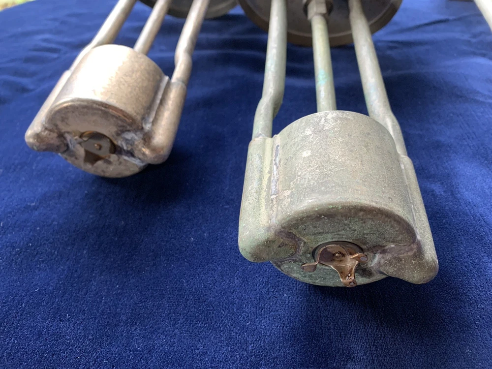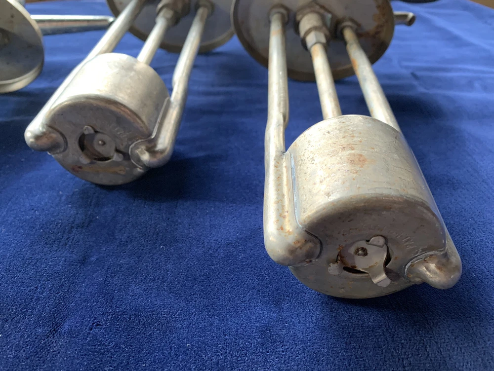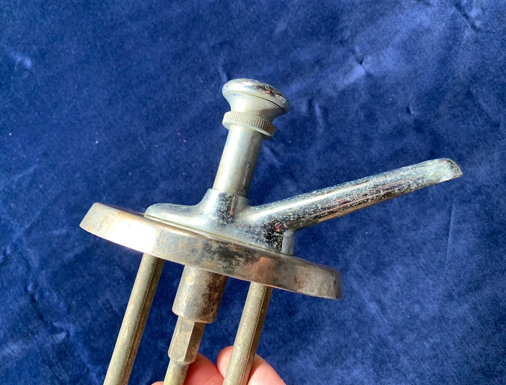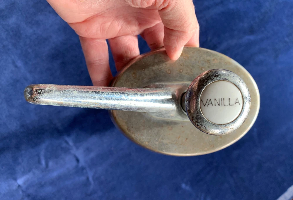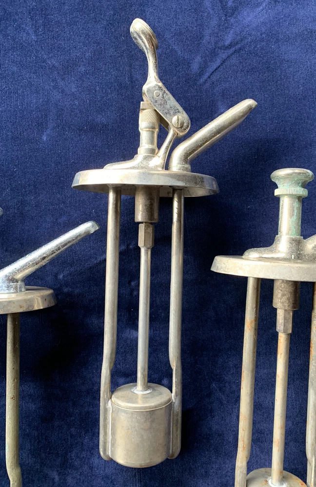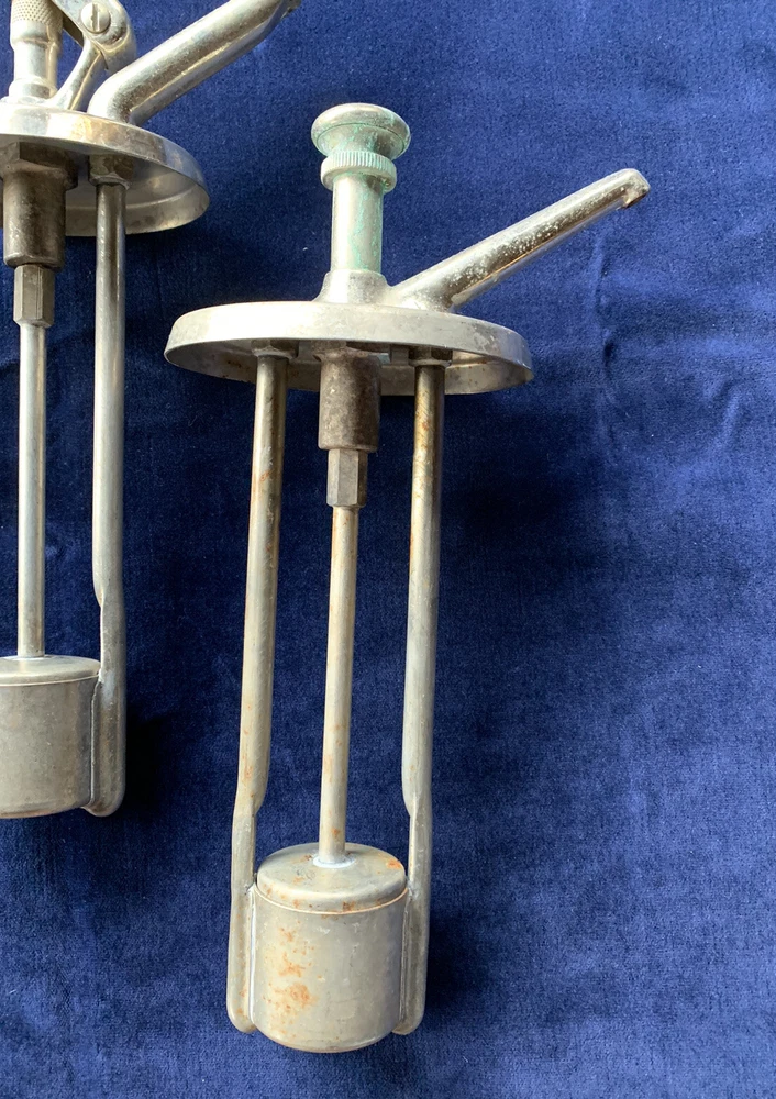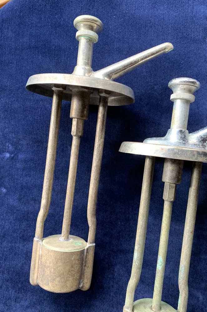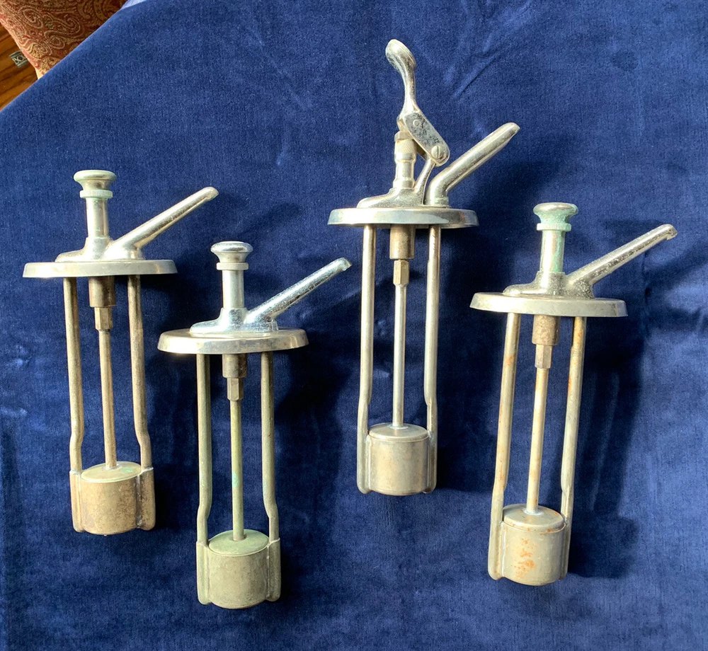 Set of 4, vintage, soda fountain / ice cream parlor syrup dispensers. Probably from the 20's or 30's based on the design. They show signs of age and use. Rust spots, etc. Please see pictures for details / condition. I put them in water...pressed the handle...and water came out. Therefore, I presume they work but make no guarantees. What you see is what you are buying, so please feel free to ask any questions that you may have. Also, if you need more pictures, do not hesitate to ask as well. No returns. Thank you for looking!