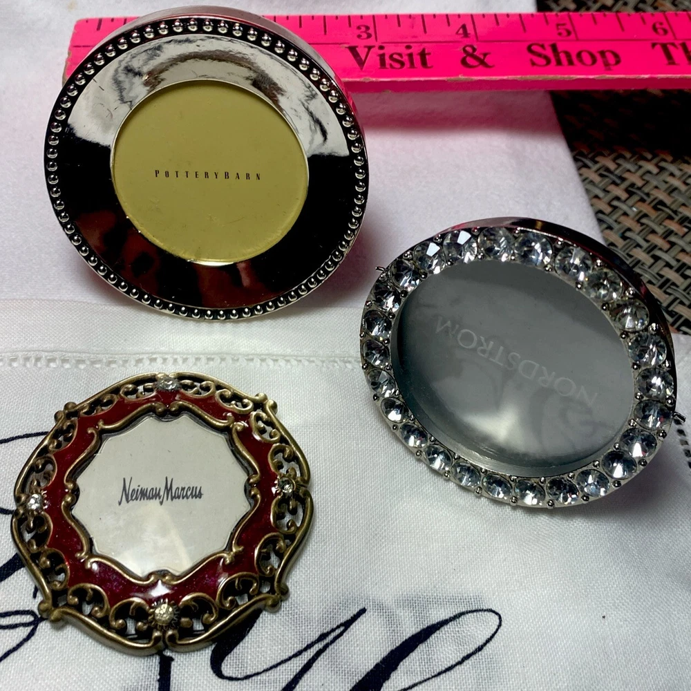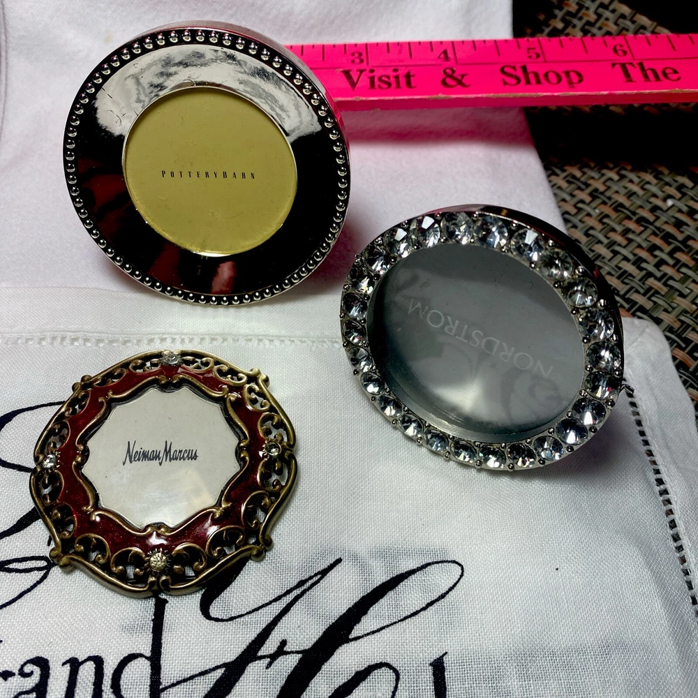 Trio of pretty tny picture frames, well, the Nieman Marcus one, Jay Strongwater, is actually a clip on - and i don't know how to insert a photo.... The price is for all three of them