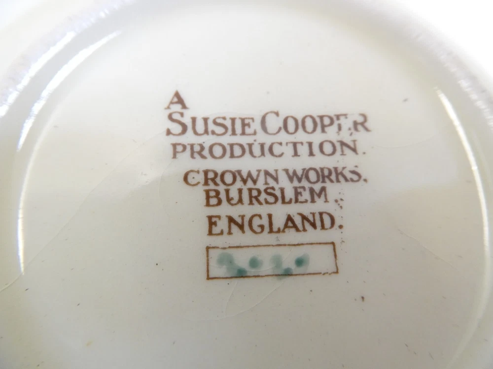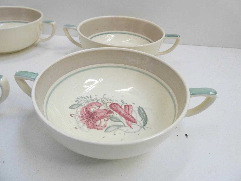 SET4 SUSIE COOPER FLORAL 2 HANDLE SOUP BOWLS RAMMEKINS CROWN WORKS BURSLEM IN GOOD CONDITION - STAMPED TO BASE 11.5 CM DIAMETER 16.5 CM ACROSS HANDLES 4.5 CM HIGH SEE PHOTOS FOR GUIDE TO SIZE AND CONDITION