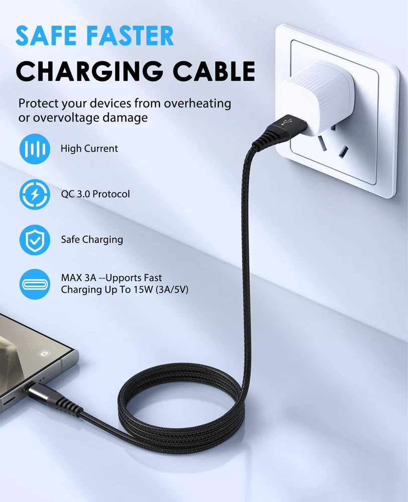 SEYIIRE USB c Cable ,2-Pack 3ft USB a to Type c Charger Fast Charging high Speed Nylon Cord Compatible with Samsung Galaxy A20, S20 S10 Plus S10E, Note 8, Moto, LG(Black) Quick Data Transfer and Fast Charging: Support data transfer speeds of up to 480Mbps and 15W fast charging (3A/5V). High Quality Cable: Nylon braided with USB connectors rated to withstand over 40,000 bends. Premium Combo: Includes 2 high-quality nylon braided USB-A to USB-C 2.0 cables (3 feet each). Wide Compatibility: Compatible with all USB Type-C devices including Samsung Galaxy S23+/S23/S22/S22+/S20/S10/S10E/S10 Plus/S9/S9 Plus/S8/S8 Plus, Note 8/9/10/20, A10e/A51/A50/A12/A11, OnePlus 3T/2, Nexus 5X/6P, LG G5/G6/G7/G8/V20/V30/V35/V50/V60, Moto Z/Z2, Google Pixel, and other USB-C devices. High-quality service: Respond within 24 hours and promptly provide solutions! Quick Data Transfer and Fast Charging: Support data transfer speeds of up to 480Mbps and 15W fast charging (3A/5V). High Quality Cable: Nylon braided with USB connectors rated to withstand over 40,000 bends. Premium Combo: Includes 2 high-quality nylon braided USB-A to USB-C 2.0 cables (3 feet each). Wide Compatibility: Compatible with all USB Type-C devices including Samsung Galaxy S23+/S23/S22/S22+/S20/S10/S10E/S10 Plus/S9/S9 Plus/S8/S8 Plus, Note 8/9/10/20, A10e/A51/A50/A12/A11, OnePlus 3T/2, Nexus 5X/6P, LG G5/G6/G7/G8/V20/V30/V35/V50/V60, Moto Z/Z2, Google Pixel, and other USB-C devices. High-quality service: Respond within 24 hours and promptly provide solutions! Shipping from the USA All of our products are shipped from the USA, ensuring quick delivery to your destination. Payment We offer the following payment methods: PayPal, credit card, bank transfer, and eBay's secure payment system. Free Shipping & Free Returns Shipping within the USA is FREE. Additionally, any return is absolutely free for you. Risk-Free Purchase You have the option to return an item within 30 days without any justification. We cover the return shipping costs! Fast Shipping We ship immediately upon receipt of payment. Generally, the package is delivered within 2-3 days in the USA. If it takes longer, we will contact you. Quality and Costs Made in Europe, USA, China No customs fees or additional charges Total satisfaction guarantee Invoice with declared VAT available upon request in .pdf format Feedback Your feedback is very important to us. After you pay for your purchase, you will automatically receive positive feedback from us.
