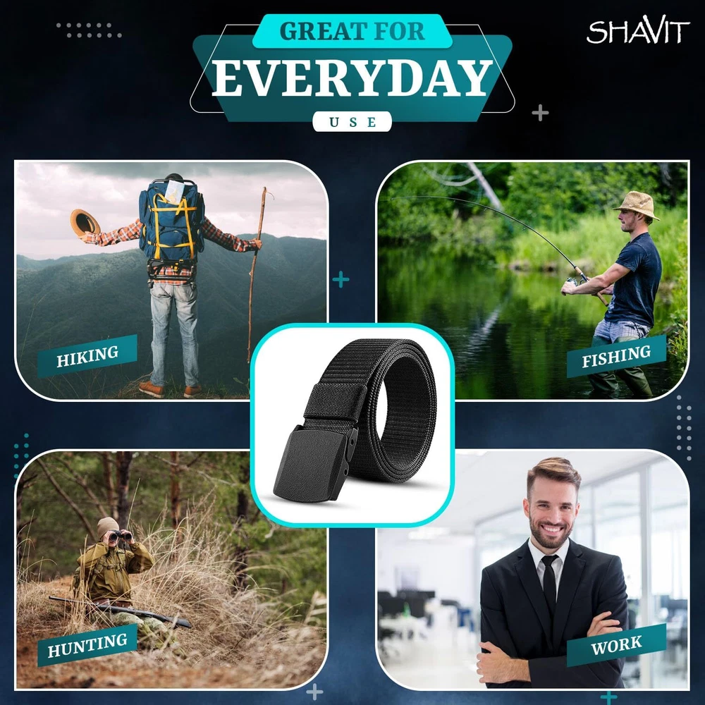 SHAVIT Nylon Belts for Men, Work Belt Adjustable Slide Plastic Buckle Web Canvas Tactical Belt, Great for Outdoor Hiking, Fishing, Hunting, Work and Every Day Use Nylon Canvas Breathable Military Tactical Men Waist Belt With Plastic Buckle Airport Friendly - Metal-Free Plastic Cam Buckle Belts for Men and Women with No Metal Plastic Buckle for Work and Travel Adjustable Size - Hole-less belt means you can adjust the length freely Shipping We offer FREE shipping on all orders! We ship within Three business days of payment, usually sooner. We use a selection of shipping services such as UPS, FedEx, USPS etc. We only ship to the lower 48 states, no APO/FPO addresses or PO Boxes allowed. Local pickups and combined shipping options are not provided at this time. Return You can return a product for up to 30 days from the date you purchased it. Any product you return must be in the same condition you received it and in the original packaging. Please keep the receipt. Payment We accept payment by any of the following methods: PayPal Please pay as soon as possible after winning an auction, as that will allow us to post your item to you sooner! Feedback Customer satisfaction is very important to us. If you have any problem with your order, please contact us and we will do our best to make you satisfied. Contact Us If you have any queries, please contact us via ebay. We usually respond within 24 hours on weekdays. Please visit our eBay store to check out other items for sale! Thank you for shopping at our store.