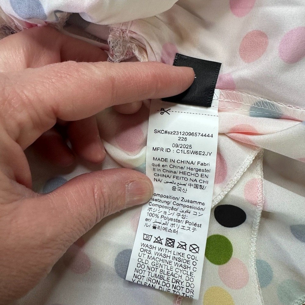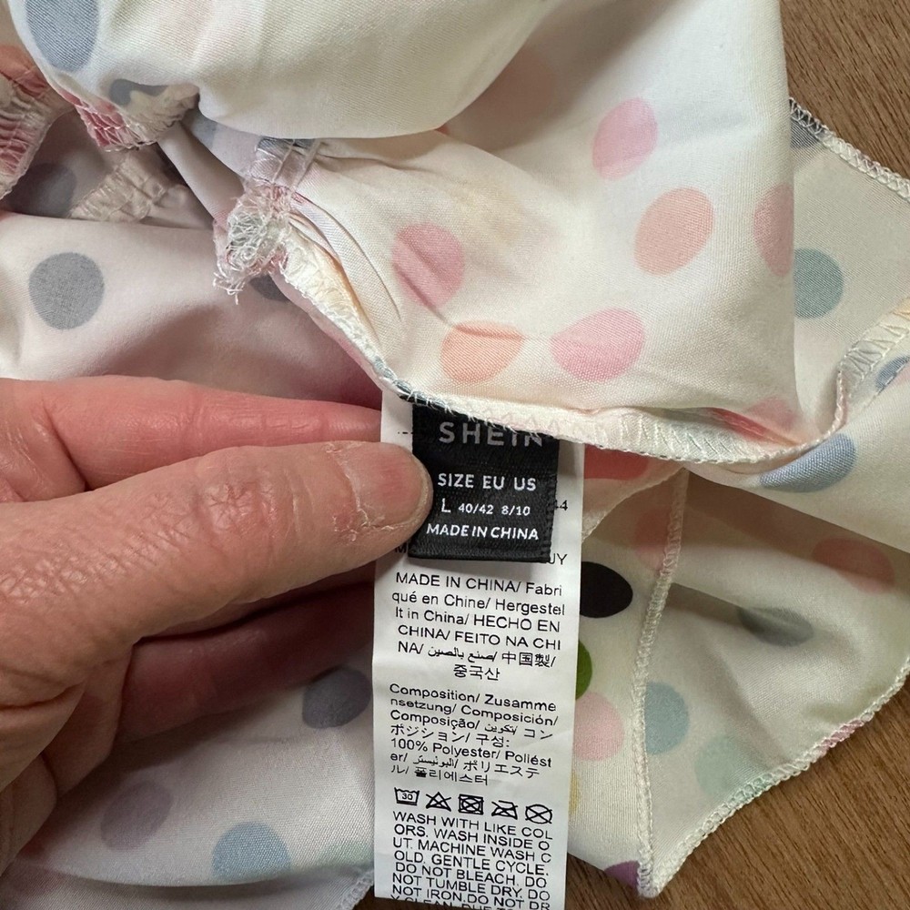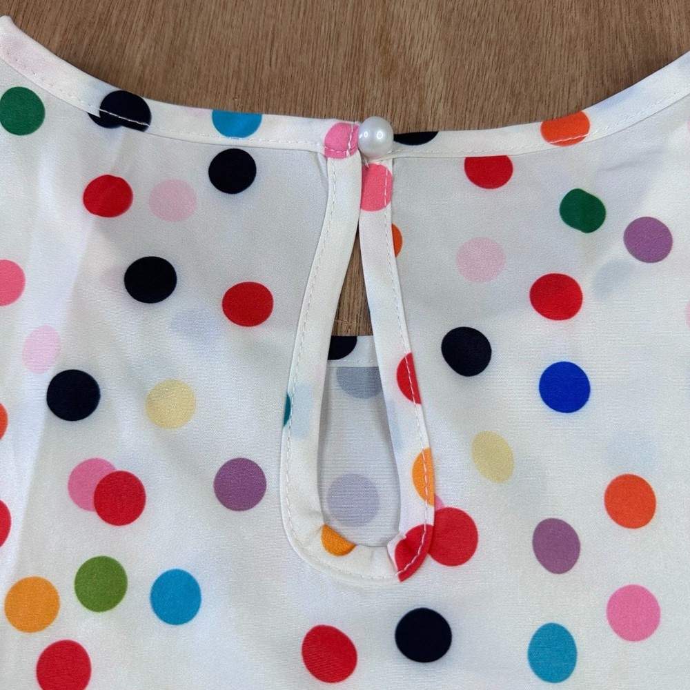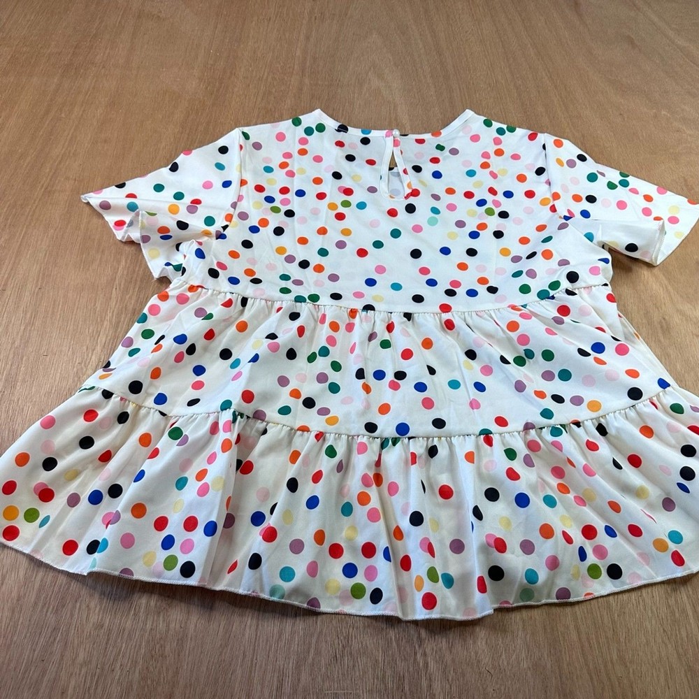 SHEIN women’s babydoll blouse featuring a playful multicolor polka dot print on a lightweight white background. This trendy top has a relaxed tiered silhouette with short flutter sleeves and a keyhole button closure at the back. The flowy babydoll style creates a comfortable oversized fit that pairs easily with jeans, shorts, or leggings. Perfect for spring and summer outfits, casual everyday wear, vacation looks, or festival style. FEATURES Brand: SHEIN Size: Large (US 8/10) Color: White with multicolor polka dots Style: Babydoll Blouse / Tiered Top Closure: Back Keyhole Button Material: 100% Polyester Sleeve: Short Flutter Sleeve MEASUREMENTS Pit to Pit: 20 in Length: 24 in CONDITION Good pre-owned condition. No major flaws observed. Please review photos for full condition details. #polkadot #babydolltop #springstyle #shein 1820