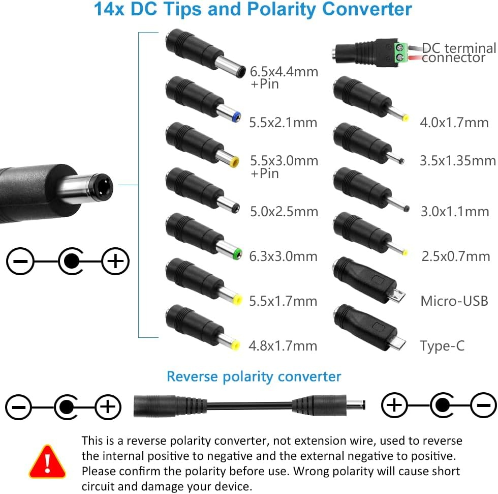 Store New Arrivals Add to Favorite View Feedback Contact SHNITPWR 60W Universal Power Supply DC 3V 4V 4.5V 5V 6V 7V 7.5V 8V 9V 10V 11V 12V Adjustable Variable Power Adapter 100V-240V AC to DC Converter 1A 2A 2.5A 3A 4A 5A with 14 Tips & Polarity Converter Description Current Rating 1 Amps, 1.5 Amps, 2 Amps, 2.5 Amps, 3 Amps, 3.5 Amps, 4 Amps, 5 Amps Power Source Corded Electric Mounting Type Wall Mount Color Black Brand SHNITPWR Specification Met CE, FCC, RoHS Size 60W ๐๐ง๐ฉ๐ฎ๐ญ ๐๐ง๐ ๐๐ฎ๐ญ๐ฉ๐ฎ๐ญ: Input: AC 100~240V, 50/60Hz ; Output: DC 3~12V Adjustable, Max 5A 60W ; It can supply with any voltage between 3~12V,such as 3V 3.5V 4V 4.5V 4.8V 5V 5.5V 6V 6.5V 7V 7.5V 8V 8.5V 9V 9.5V 10V 10.5V 11V 11.5V 12V, etc and any amp less than 5A, such as 300mA, 500mA,1A, 1.5A, 2A, 2.5A, 3A, 3.5A, 4A, 4.5A, 5A. LCD display will show the output voltage, in case that wrong voltage regulation damage your device. ๐๐ฉ๐ ๐ซ๐๐๐๐ ๐๐๐ซ๐ฌ๐ข๐จ๐ง ๐๐จ๐ฐ๐๐ซ ๐๐ฎ๐ฉ๐ฉ๐ฅ๐ฒ: Based on hundreds of users feedback, we have made the following improvements: 1. The knob can be adjusted more evenly, and it can reach 5V ~ 6V by rotating 50%. 2. Increase the off gear to turn off the power without pulling the plug. 3.Add a polarity converter cable, which make it compatible with more devices๏ผdoubles its range of application. ๐๐๐ฉ๐๐ฌ ๐ ๐ซ๐๐ช๐ฎ๐๐ง๐ญ๐ฅ๐ฒ ๐๐ฌ๐๐ ๐๐ข๐ฉ๐ฌ: It comes with an original 5.5x2.5mm tip and 14pcs frequently used tips: 6.5x4.4mm+Pin, 5.5x2.1mm, 5.5x3.0mm+Pin, 5.0x2.5mm, 6.3x3.0mm, 5.5x1.7mm, 4.8x1.7mm, 4.0x1.7mm, 3.5x1.35mm, 3.0x1.1mm, 2.5x0.7mm, Micro-USB, Type-C and DC terminal connector. Can be applied to almost all commonly used electronic devices. You can screw wires onto it easily, perfect for DIY projects. ๐๐ข๐๐ ๐๐๐ง๐ ๐ ๐จ๐ ๐๐ฉ๐ฉ๐ฅ๐ข๐๐๐ญ๐ข๐จ๐ง๐ฌ: The 60W all-in-one multipurpose AC/DC adapter fit for many 3~12V small household electronics such as LED strips, under-cabinet light, TV Box, smart speaks, wireless routers, essential oil diffuser humidifier, USB fan, Wifi camera, USB Hub, hard disk box, DC motor, DC pump, digital photo frame, DVR NVR surveillance system etc.For indoor use only. ๐๐๐๐๐ญ๐ฒ ๐๐ซ๐จ๐ญ๐๐๐ญ๐ข๐จ๐ง ๐๐ฒ๐ฌ๐ญ๐๐ฆ๐ฌ: Built-in multiple safety protection systems. Automatic over voltage cut-off, over current cut-off, over temperature cut-off, short circuit cut-off. We focus on producing premium quality and safety power adapters. No noise, no spontaneous combustion, no explosion, no fire hazard, safe to use. 6ft long power cable makes it convenient to use. ๐๐ข๐ง๐๐ฅ๐ฒ ๐๐จ๐ญ๐: This product is an AC to DC adapter, NOT charger!!!It canโt be used to charge electronic devices with batteries, such as laptops. Please choose correct voltage before plug it to your device. Wrong voltage may damage your device. We recommend to use less than 80% of the full load. Product description Parameter Input: AC 100V~240V 50/60Hz Output Voltage: DC 3V~12V Adjustable Output Current/Wattage: Max 5A 60W Output DC connector:5.5mm x 2.5mm (inside"+", outside"-") Reverse polarity converter: 5.5mm x 2.1mm 14 Tips Size: 6.5x4.4mm+Pin, 5.5x2.1mm, 5.5x3.0mm+Pin, 5.0x2.5mm, 6.3x3.0mm, 5.5x1.7mm, 4.8x1.7mm, 4.0x1.7mm, 3.5x1.35mm, 3.0x1.1mm, 2.5x0.7mm, Micro-USB, Type-C and DC terminal connector. Power cable length: 7.7ft / 236cm Safety Compliance: FCC / CE/ RoHS Working Temperature: -10~40โ Weight: 0.66 lb / 300g Attention: The power cord between power brick and DC plug will lead to 0.4V~0.6V voltage drop, so we designed the screen displayed voltage was 3.5V~12.5V. Only in this way can your device really get 3V~12V voltage. This is the reason why we advertise the power supply's voltage range is 3V~12V, not 3.5V~12.5V. Package included 1x 60W Universal Power Supply Adapter; 14x DC Tips; 1x Reverse polarity converter cable Latest upgraded version of adjustable power supply๏ผ Based on hundreds of users feedback, we have made the following improvements: The knob can be adjusted more evenly, and it can reach 7V ~ 8V by rotating 50%. Increase the off gear to turn off the power without pulling the plug. Add a polarity converter cable, which make it compatible with more devices. Correct knob label, "Min" being 3 volts and 12 volts being "Maxโ. Kindly note: Some user complained that voltage will change slightly without adjusting it. In fact, this is normal when your device is working. Besides, ambient temperature, magnetic field, signal noise will also affect output voltage. But the change is slight and acceptable. It will not damage most of the electronics. Caution: The 4cm short black power cord is a reverse polarity converter, not extension wire. It is used to reverse the original polarity of the power supply output port ( reverse the internal positive pole to negative , and the external negative pole to positive). Please confirm the polarity of your devicesโ power port before use. If the positive and negative poles are reversed, it will cause short circuit and damage your device. Is this 3~12V 60W universal power supply (PS) compatible with your device? 1. Check Voltage Please find the spec label of your device and check the working voltage. It should be among 3V~12V DC, not lower than 3V or higher than 12V DC. Otherwise, your device will not work or be damaged. 2. Check Current Check the max current your device will draw. It should be equal to or less than 5A, such as 1A,2A,2.5A, 3A, 3.5A, 4A, 4.5A, 5A. Otherwise, your device wonโt work well and the PS will be damaged very soon. 3. Check Plugs Check the power input port of your device. The PS is equipped with 14 pcs frequently-used DC tips. Please confirm wether it fits for your device before buy. If 