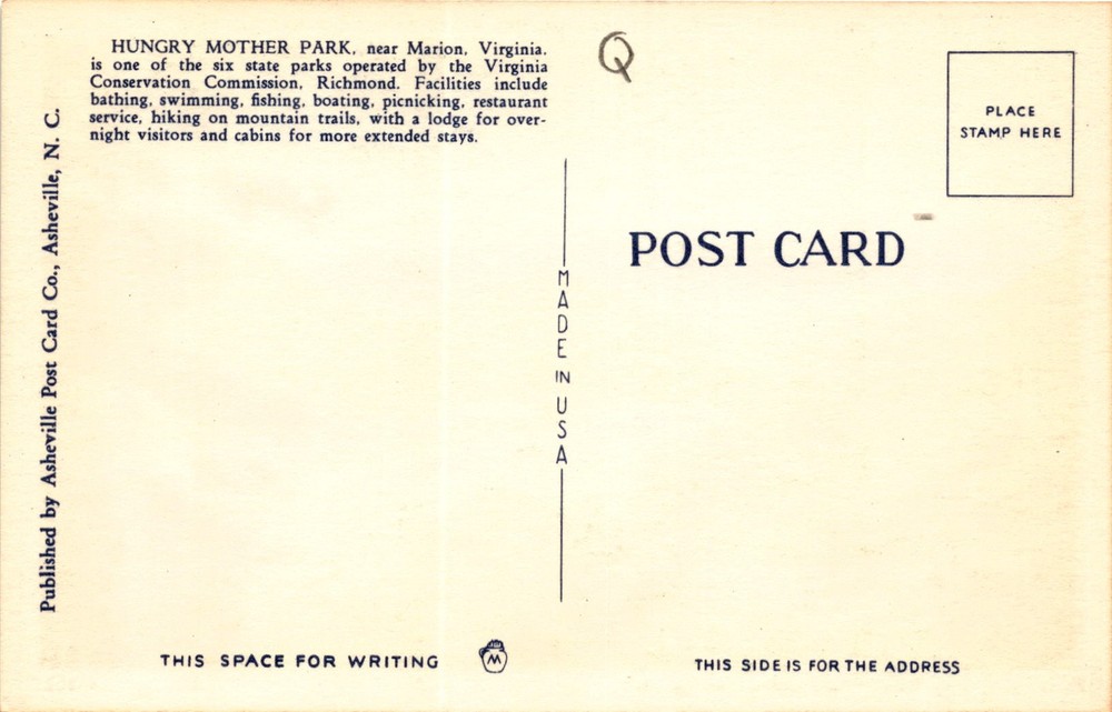 The postcard features a photo of the Shore Line Drive at Hungry Mother State Park near Marion, Virginia. Hungry Mother Park is one of the six state parks operated by the Virginia Conservation Commission in Richmond. The park offers various facilities and activities including bathing, swimming, fishing, boating, picnicking, restaurant service, and hiking on mountain trails.