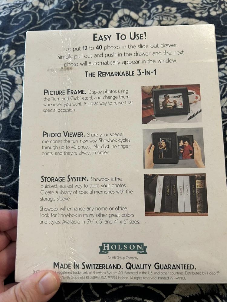 Introducing the SHOWBOX 3-in-1 Photo Viewer/Frame Storage Holds (40) 4"x6" Photos NIB! This product is perfect for those who want to display and store their photos in a convenient and stylish way. The device is made by Holson and is designed to hold photos of up to 4" x 6" size. The photo viewer is made of plastic and comes in black color. It is a versatile product that can also function as a picture frame and a storage system. The device is manufactured in Switzerland and has not been modified. It is a great addition to any collection and is perfect for those who love to showcase their photos in a high-quality and elegant way.