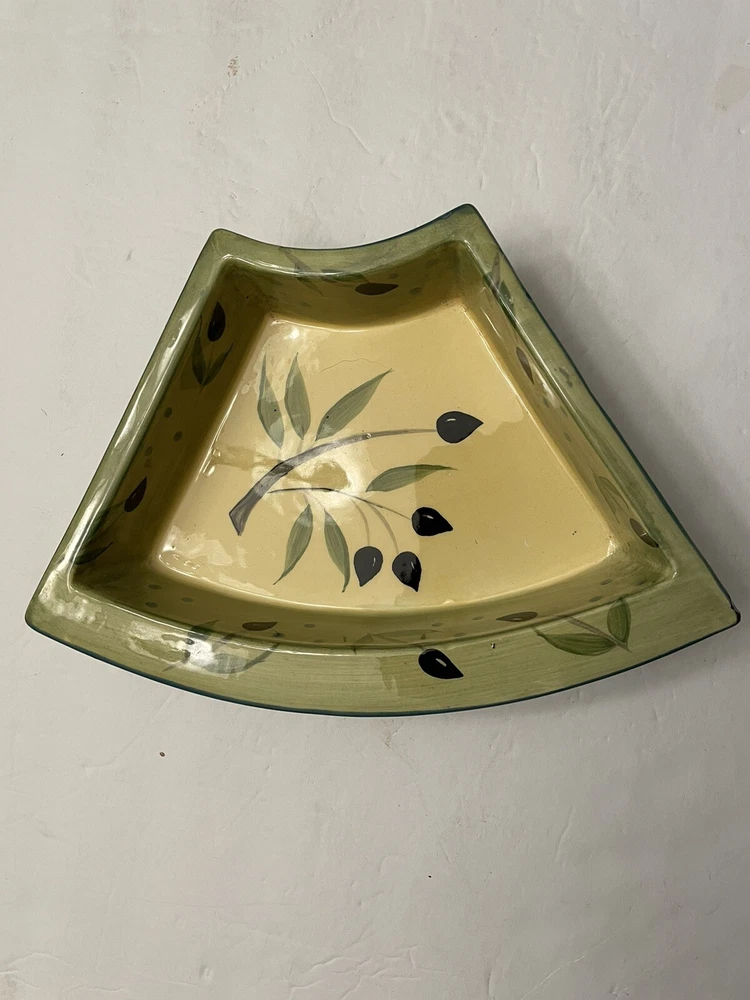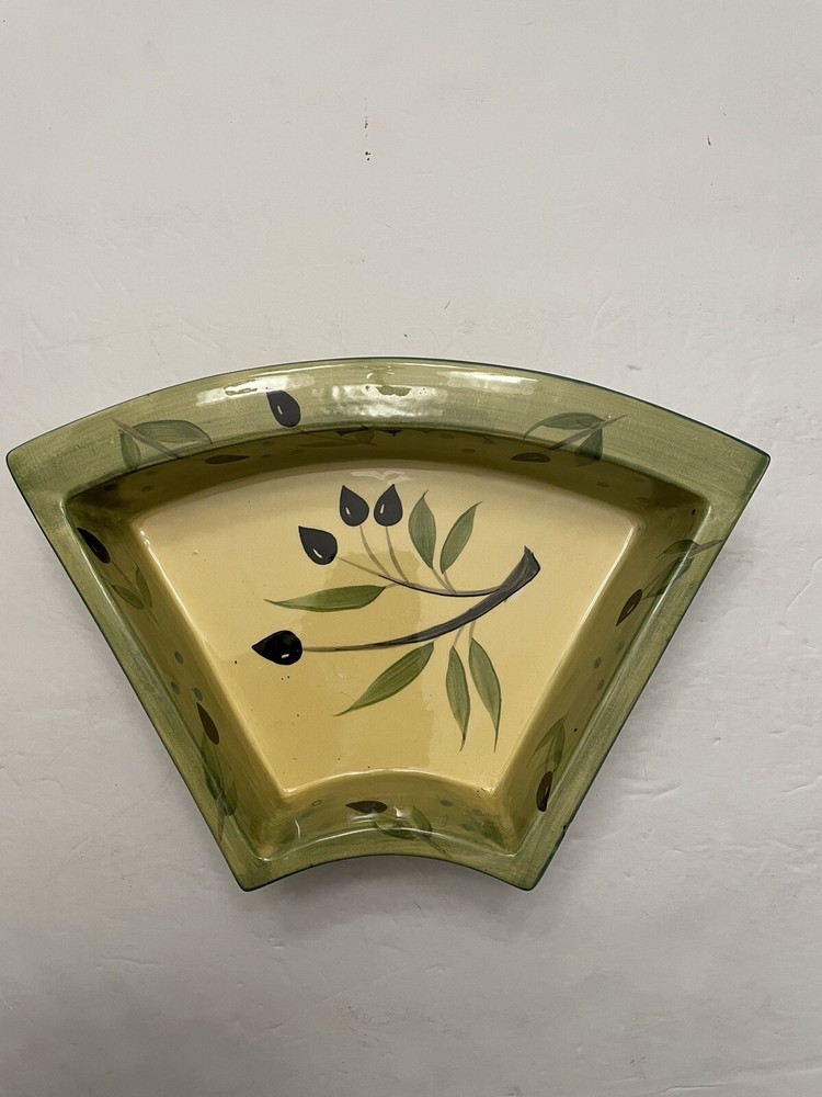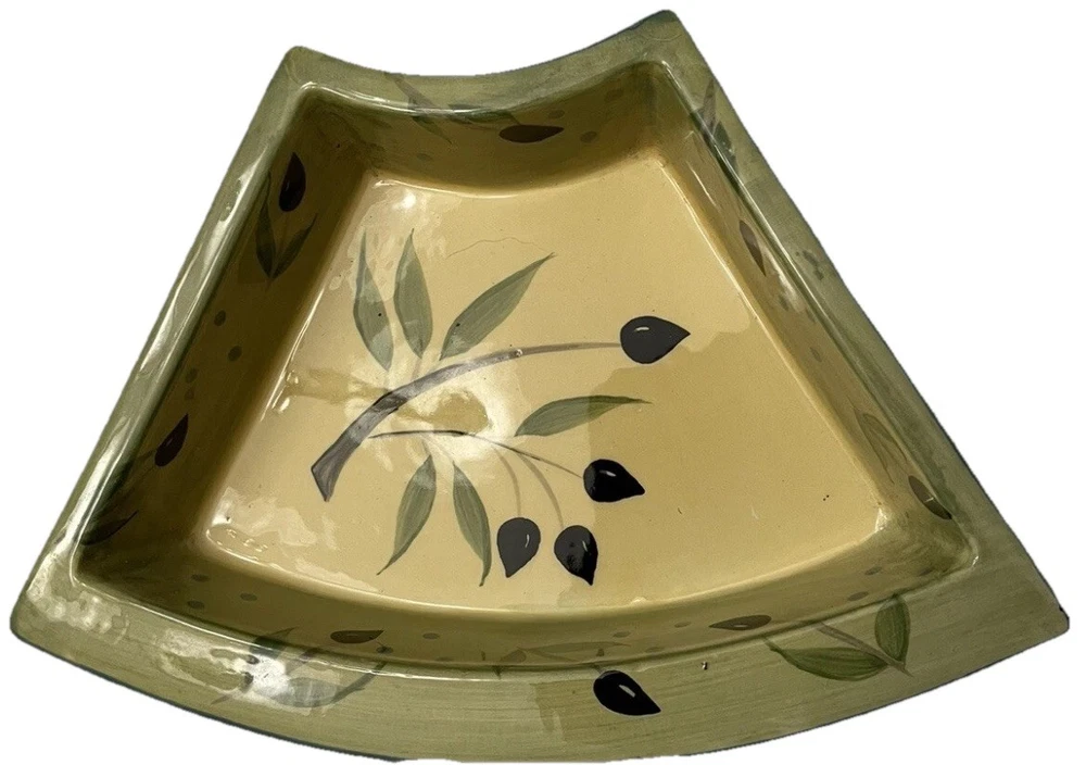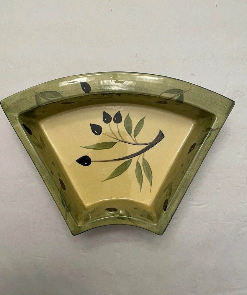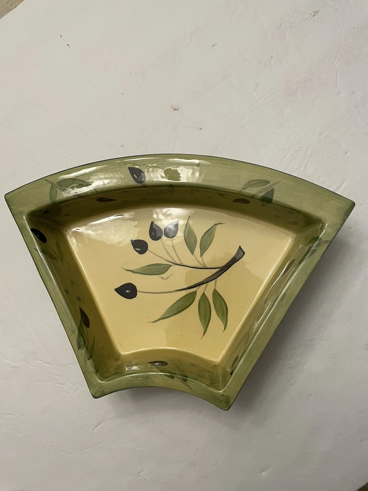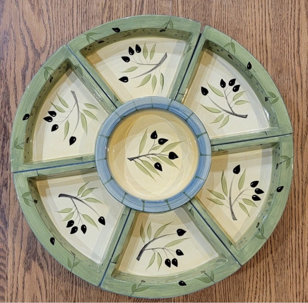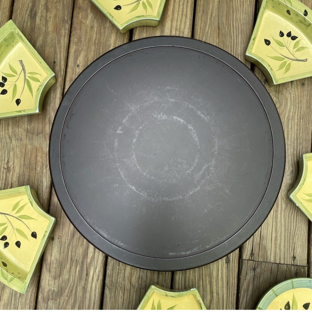 In Excellent Condition, no chips or wear and the turn table functions perfectly. This beautiful gift worthy turntable is a must-have for any dining or entertaining occasion. With a Mediterranean style design and a glossy finish, it is made of dark brown wood and ceramic serving dishes. The middle is round in shape with 6 additional serving pieces surrounding it. An olive branch design is artistically featured throughout the set. Measuring 20.5 inches in diameter and 5 inches in depth, this turn table has a total of seven compartments to hold a variety of foods and delectables. It is easy to fill and features a convenient turn table tray for serving. The turntable design allows for easy sharing and access to the items on the platter. Perfect for all occasions, this 8-piece set is sure to impress your guests.