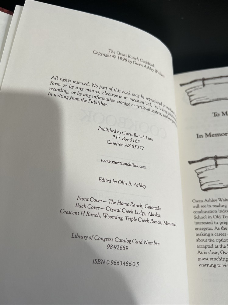 This hardcover, first edition book titled "Great Ranch Cookbook: Spirited Recipes" by Gwen Ashley Walters is a must-have for any cooking enthusiast. The book features 253 pages of delicious recipes that showcase the unique flavors of the American West. The book is signed by the author and illustrator, Betsy Hillis, and is a vintage piece published in 1998 by Guest Ranch Link. It is a nonfiction narrative that falls under the categories of travel and cooking, with a focus on regional and ethnic American cuisine. The book's dimensions are 9.5 x 7.5 x .9 inches and it weighs 1 lb. 9 oz. This cookbook is a true gem for anyone interested in Western cuisine and agriculture. The book is shipped via USPS Media Mail in a box 📦