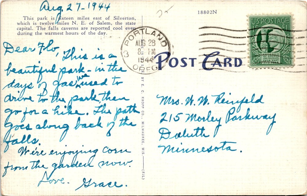 MAKE AN OFFER. THE MORE YOU BUY THE BETTER DEAL I WILL ACCEPT The postcard describes Silver Falls State Park in Oregon, specifically mentioning Silver Creek Falls. The park is located 16 miles east of Silverton and 12 miles northeast of Salem, the state capital. The postcard was sent in 1944, and the falls caverns in the park are noted for being cool even during the warmest hours of the day.