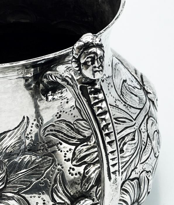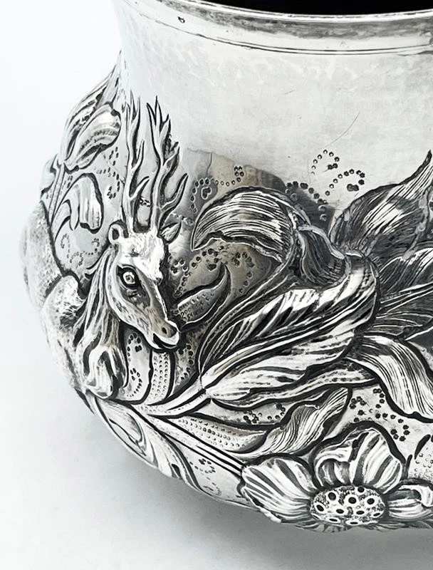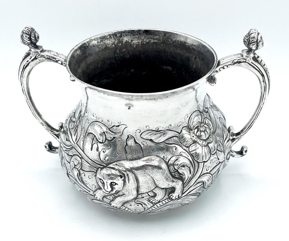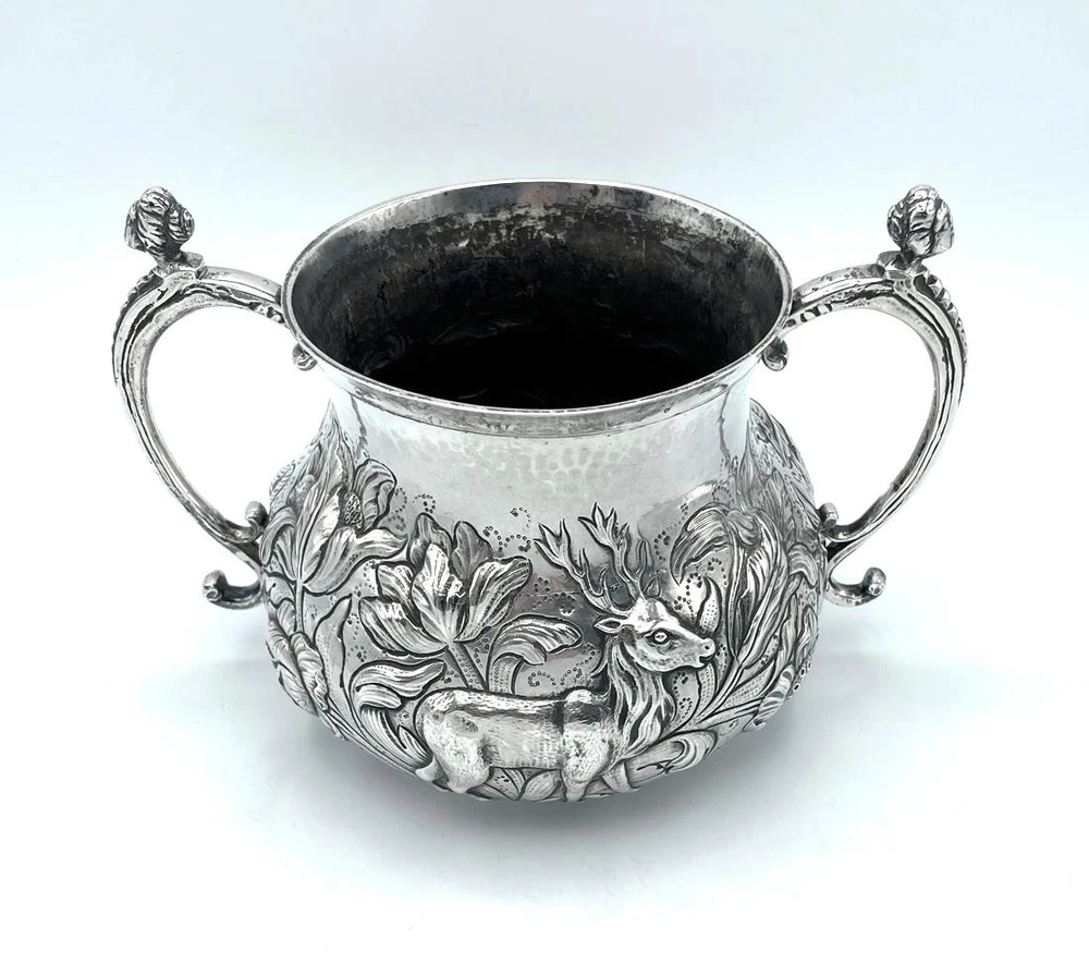 SILVER PORRINGER BOWL 23oz LONDON 1925 CHARLES II STAG & BEAR DESIGN Description SILVER PORRINGER BOWL 23oz LONDON 1925 CHARLES II STAG & BEAR DESIGN Fabulous large scale silver porringer by Pairpoint Brothers, London 1925. A copy of a King Charles II silver original. Bold repousse floral decoration featuring a stag & a bear. Marks: maker mark AP FP AP (Pairpoint Brothers); lion silver mark rubbed; London assay office mark; date letter k for the year 1925. Dimensions: approx 6½ inches dimater. Approximately 9¼ inches across the handles. Weight: approx 23.6 troy oz (734g) The interior is heavily tarnished. A few minor dings & dents but overall lovely condition. Pictures sell! Auctiva offers Free Image Hosting and Editing. 300+ Listing Templates! Auctiva gets you noticed! The complete eBay Selling Solution. Track Page Views With Auctiva's Counter