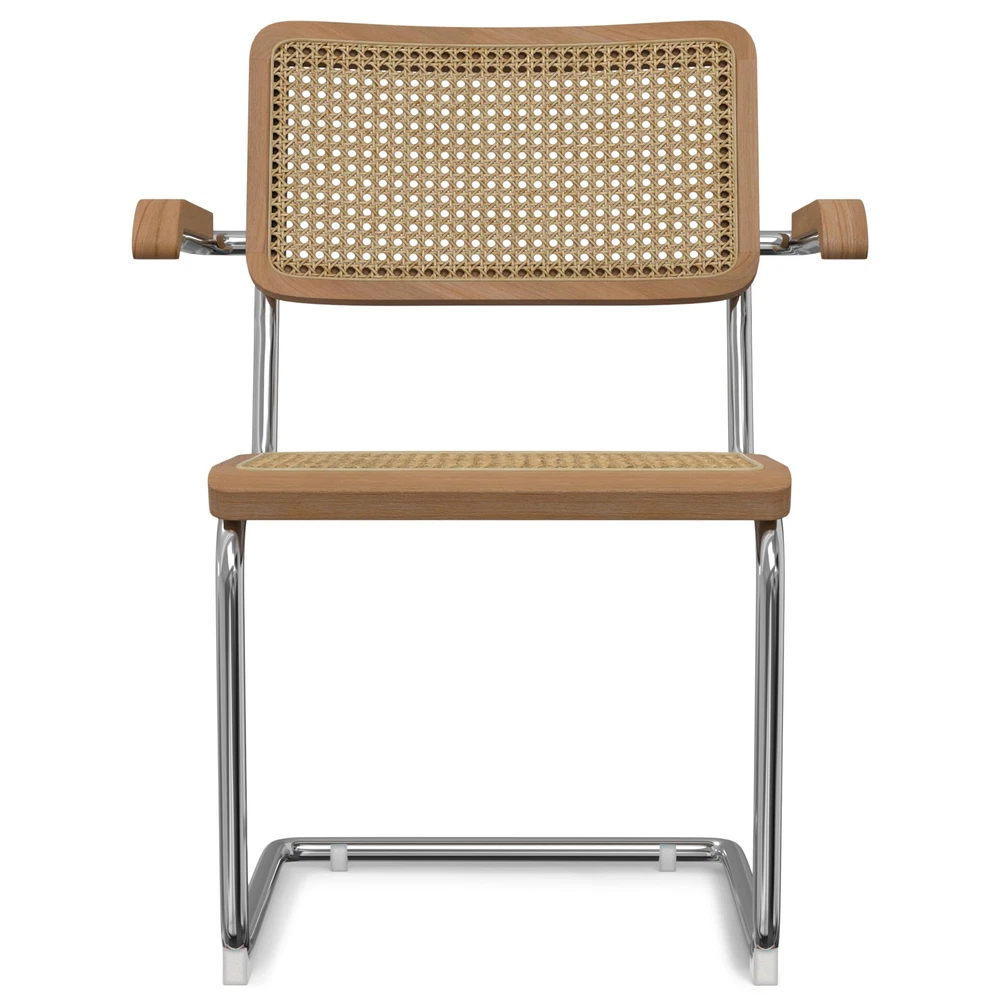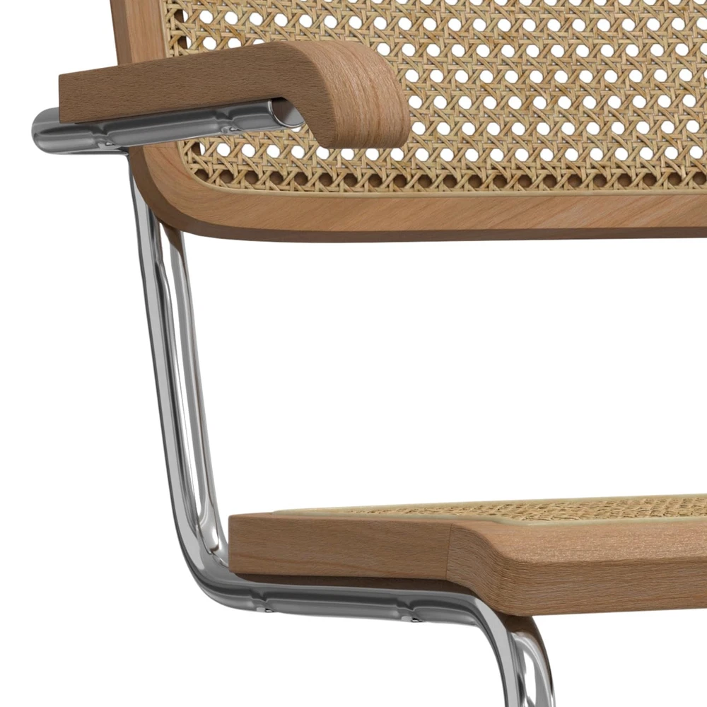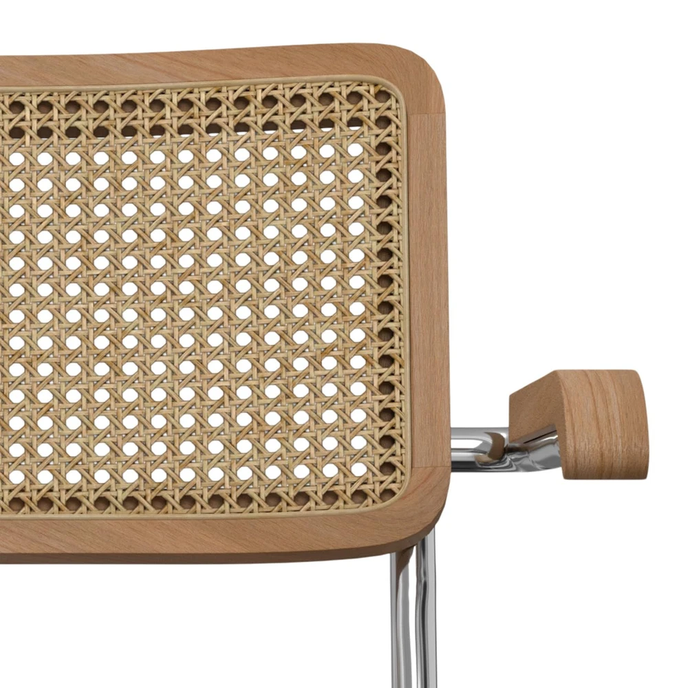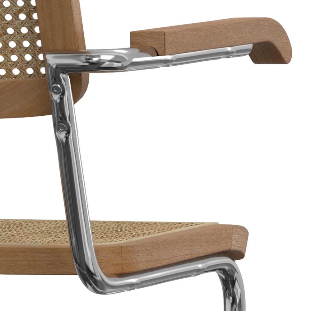 Bring mid-century modern elegance to your dining space with the Madalyn Dining Armchair Set. These handcrafted chairs blend natural beech wood frames with handwoven rattan seats and backrests, offering both style and comfort. The polished chrome cantilevered base adds a sleek, contemporary touch, while the curved arms provide ergonomic support for extended seating. Perfect for family meals or entertaining guests, these versatile chairs complement various decor styles, from minimalist to eclectic. Their durable construction and timeless design make them ideal for busy households looking to create a stylish yet functional dining area that can withstand daily use. Additionally, the natural materials used in the construction of these chairs ensure they are not only aesthetically pleasing but also environmentally friendly. The Madalyn Dining Armchair Set is a perfect blend of form and function, making it a valuable addition to any home. Whether you're hosting a dinner party or enjoying a quiet meal with family, these chairs will enhance your dining experience with their comfort and elegance. DIMENSIONS: 23.1" D x 19.1" W x 31.7" H Hand Constructed using solid wood, rattan, metal Seat and backrest are in a woven rattan in natural Multi-functional chair can be used in kitchen, dining room, office or sitting area Mid Century Modern styling includes a comfortable woven rattan seat and back, solid wood armrest and curved metal frame and base