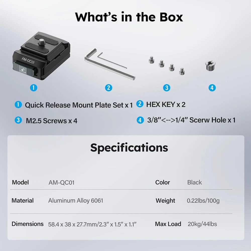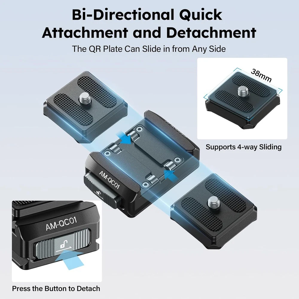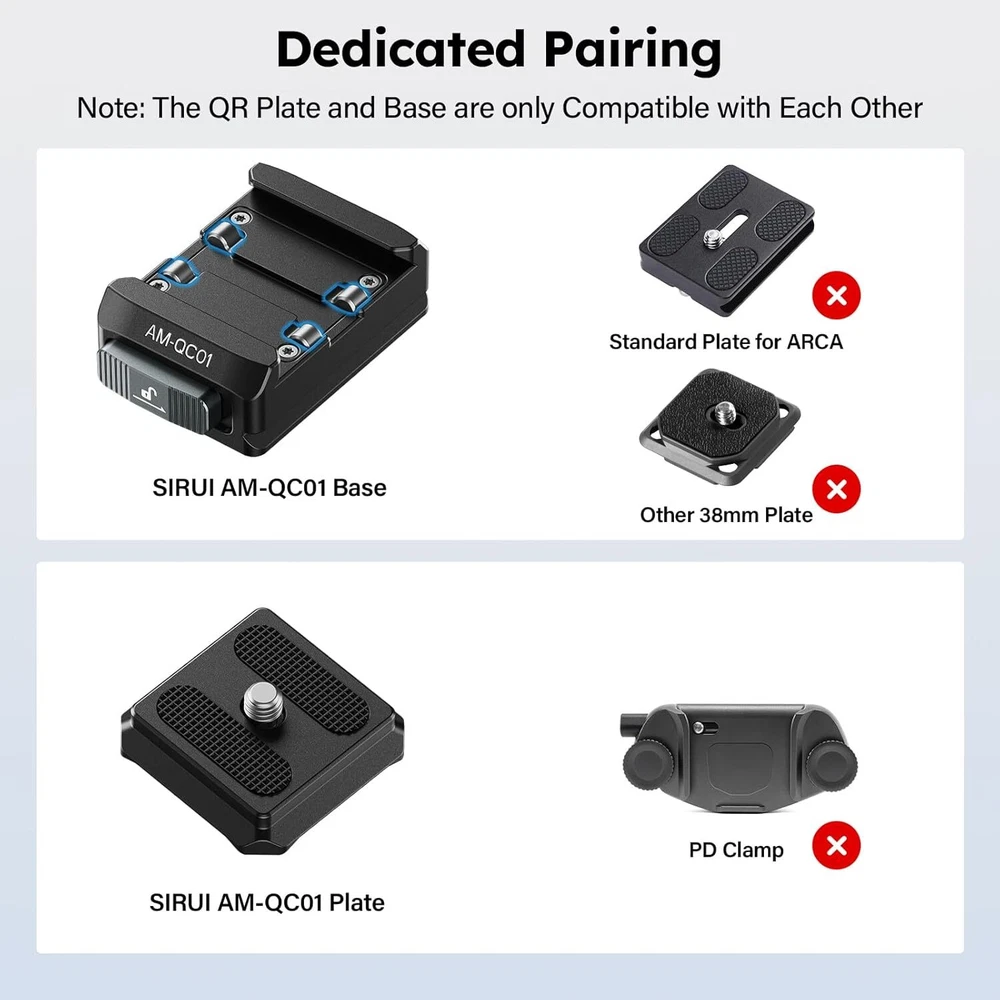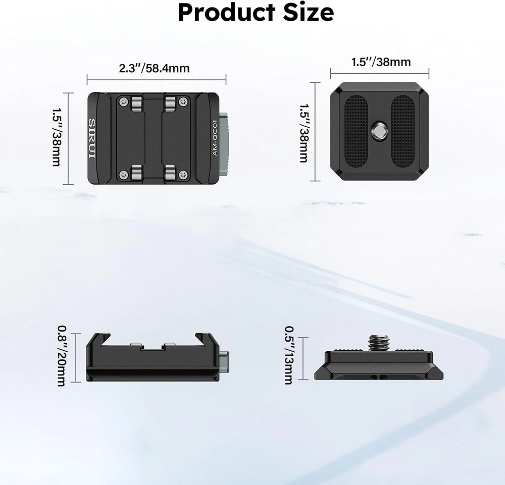 SIRUI 38mm Quick Release Plate and Clamp Kit, Quick Release System Camera Mount Adapter with 1/4"-20 & 3/8"-16 Threaded Holes, Baseplate for Tripod, Monopod, AM-QC01 Product Details Package Dimensions: 3.46 x 3.31 x 1.85 inches Item Weight: 3.52 ounces Item model number: AM-QC01 Manufacturer: SIRUI Brand: Sirui Compatible Devices: Camera Item Weight: 0.22 Pounds Maximum Weight Recommendation: 44 Pounds Dual Locking Mechanism: This SIRUI AM-QC01 38mm quick release plate kit consists of a top QR plate and a clamp. The top QR plate smoothly slides into the groove without the need for pressing any buttons and automatically locks into place. For added security, simply slide the locking button to engage the dual locking mechanism 4-way Sliding QR Plate: This square quick release top plate allows for both horizontal and vertical use, enabling you to slide the camera into the base from any of the four sides, saving time and effort. Please note, this top plate is not compatible with Peak Design Capture Clip Wide Compatibility: The camera baseplate features both 1/4" and 3/8" threaded holes at the bottom, and the entire base is compatible with clamp for Arca. You can securely attach the base plate to a tripod, monopod, or other accessories Friendly Reminder: The AM-QC01 base is exclusively compatible with the top plate included in this set and is not compatible with quick release plates of other specifications Premium Materials: The quick release plate and clamp kit is crafted from aluminum alloy, featuring a robust mortise and tenon construction and finished with CNC machining, ensuring top-notch quality. It supports a maximum load of 44 lbs/20 kg