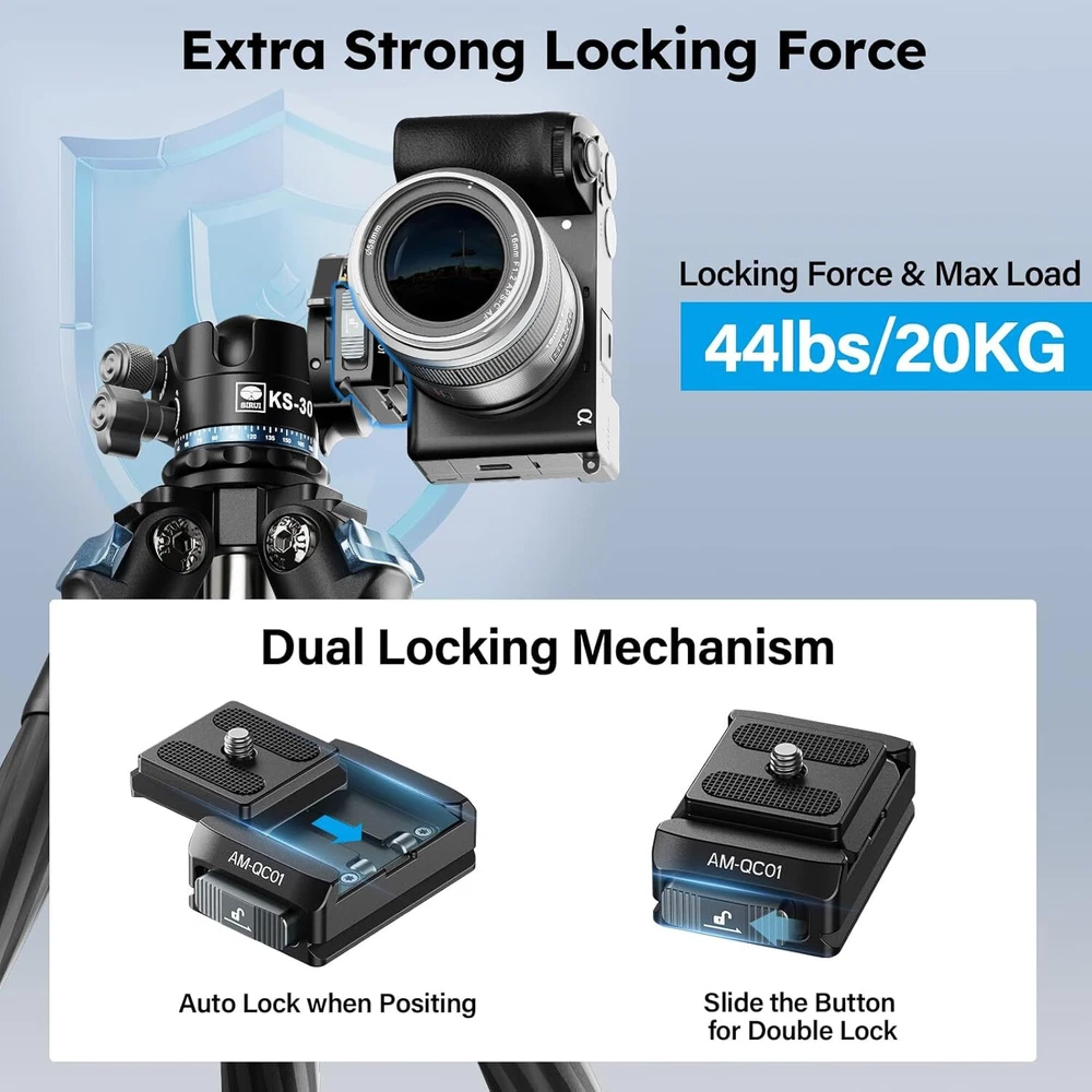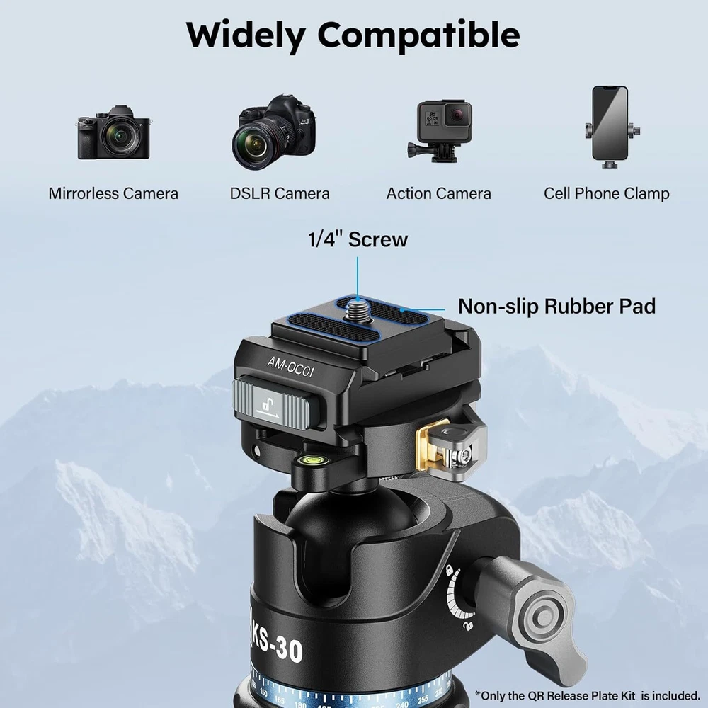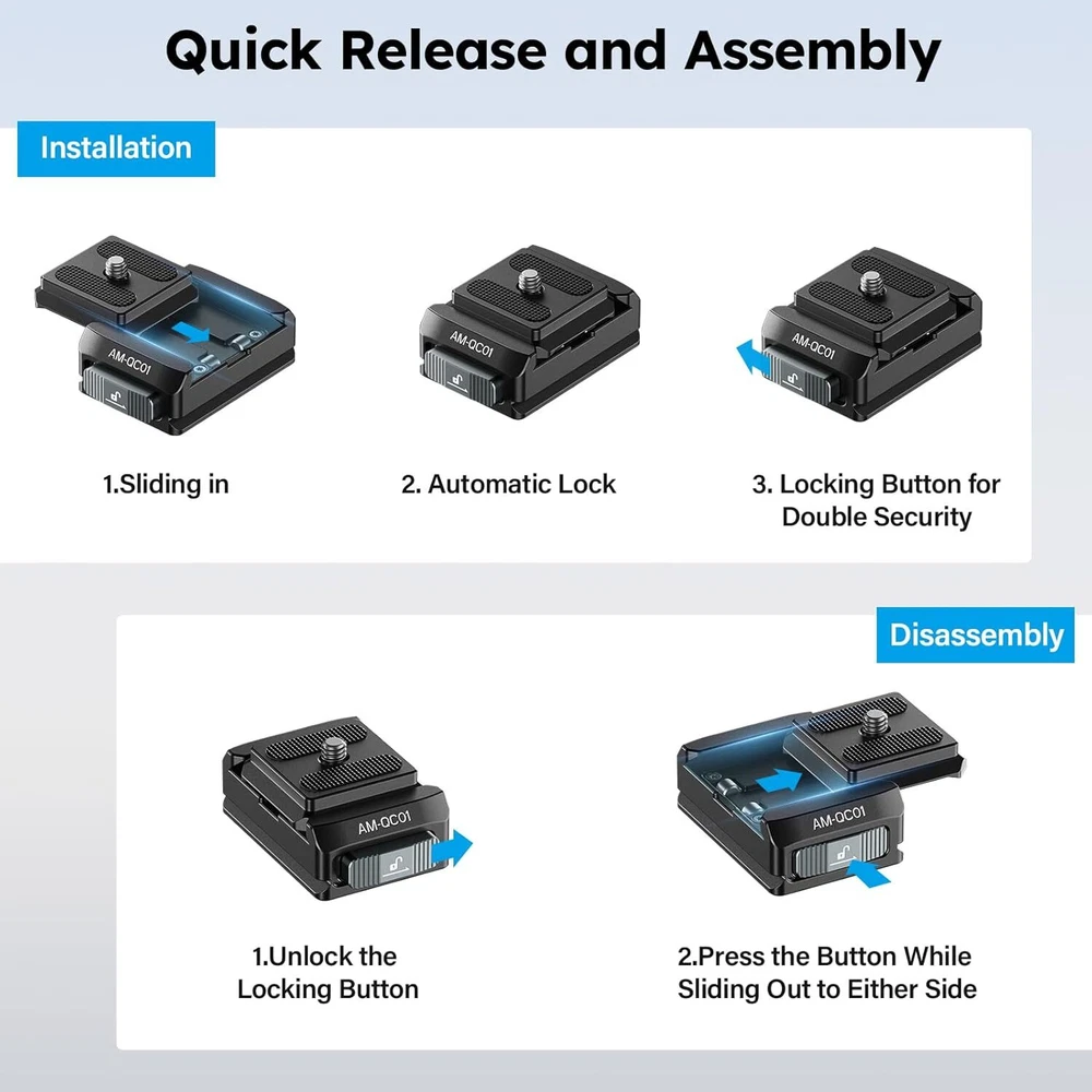 SIRUI 38mm Quick Release Plate and Clamp Kit, Quick Release System Camera Mount Adapter with 1/4"-20 & 3/8"-16 Threaded Holes, Baseplate for Tripod, Monopod, AM-QC01 Product Details Package Dimensions: 3.46 x 3.31 x 1.85 inches Item Weight: 3.52 ounces Item model number: AM-QC01 Manufacturer: SIRUI Brand: Sirui Compatible Devices: Camera Item Weight: 0.22 Pounds Maximum Weight Recommendation: 44 Pounds Dual Locking Mechanism: This SIRUI AM-QC01 38mm quick release plate kit consists of a top QR plate and a clamp. The top QR plate smoothly slides into the groove without the need for pressing any buttons and automatically locks into place. For added security, simply slide the locking button to engage the dual locking mechanism 4-way Sliding QR Plate: This square quick release top plate allows for both horizontal and vertical use, enabling you to slide the camera into the base from any of the four sides, saving time and effort. Please note, this top plate is not compatible with Peak Design Capture Clip Wide Compatibility: The camera baseplate features both 1/4" and 3/8" threaded holes at the bottom, and the entire base is compatible with clamp for Arca. You can securely attach the base plate to a tripod, monopod, or other accessories Friendly Reminder: The AM-QC01 base is exclusively compatible with the top plate included in this set and is not compatible with quick release plates of other specifications Premium Materials: The quick release plate and clamp kit is crafted from aluminum alloy, featuring a robust mortise and tenon construction and finished with CNC machining, ensuring top-notch quality. It supports a maximum load of 44 lbs/20 kg