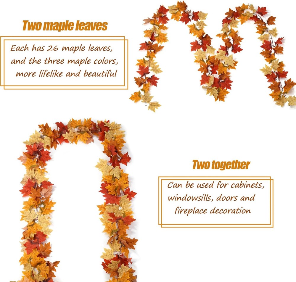 SITUMEIZI 2 Pack Fall Garland 6.5Ft Maple Leaf Red-yellow-2pc LuxeFusion Product Description Features Material: The leaves of artificial fall garlands are made of silk and plastic, there will be a plastic smell when received Packaging: 2 pieces 79-inch fake autumn maple leaf garlands. Multicolor maple leaves can warm any scene. But If you want to achieve a fuller effect, we recommend that you purchase multiple orders. Just use multiple fall garlands together to create the length you need Decorations: Fall maple garland is perfect for porches, tables, wall backdrops, picture frames, staircases, balcony draperies, doorways and fall wedding decor. They are also great for many holidays, such as Halloween, Christmas and Thanksgiving decorations Faux Fall Garland: Our autumn maple leaf garland has 3 different colors and shapes of leaves, made with reference to real fall vines, the leaves color from light to dark, looks lifelike, perfect for fall home decor Notes: Due to the long time of transportation, the maple garland may be squeezed, after receiving it can be loosened for a while or gently blown with a hair dryer to restore the shape of the maple leaves Product Details Manufacturer: SITUMEIZI Product Dimensions: 79 x 8.7 x 8.7 inches Item Weight: 9.1 ounces Country of Origin: China Item model number: XI0522-MA-REYE Brand: SITUMEIZI Color: Red-yellow-2pc Material: Silk Plant or Animal Product Type: Maple Shape: Maple Free Shipping All orders ship free and fast to your doorstep. Easy Returns Satisfaction guaranteed. 30-day returns, no questions asked. 24/7 Support Contact us anytime; we’re here to help, day or night. Brought to you by LuxeFusion – Quality you can trust.