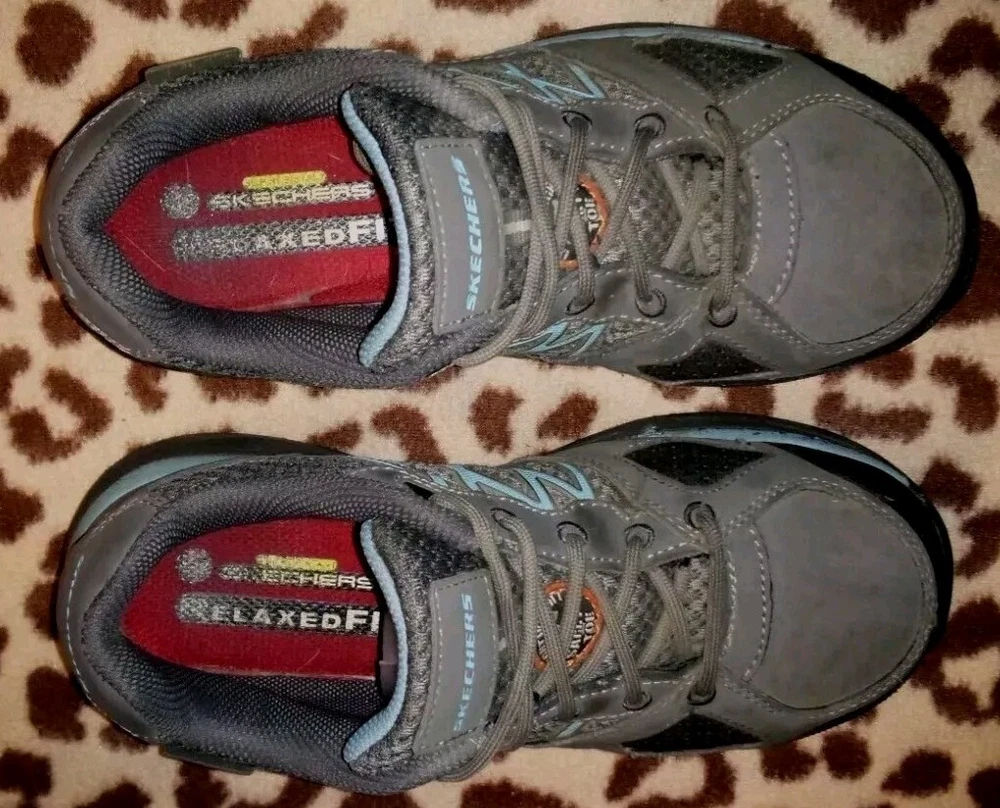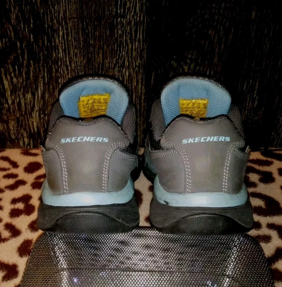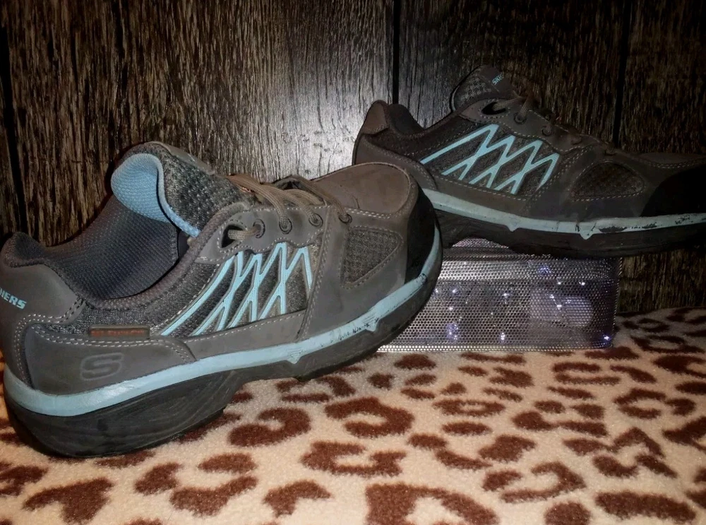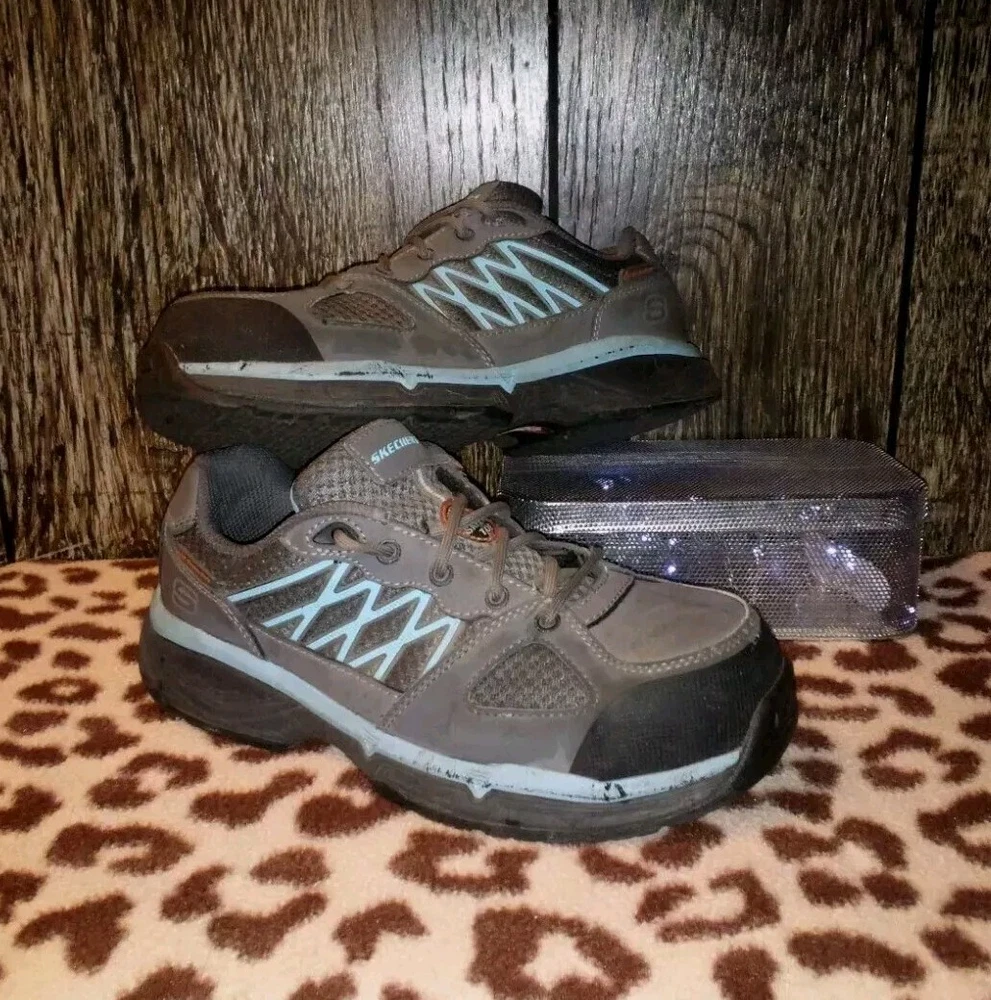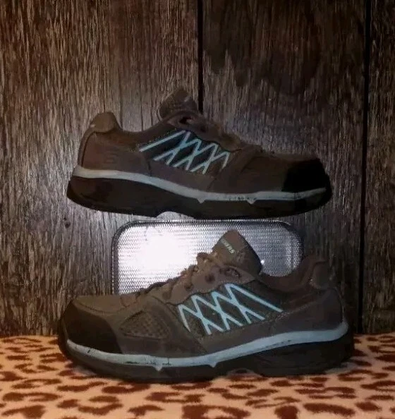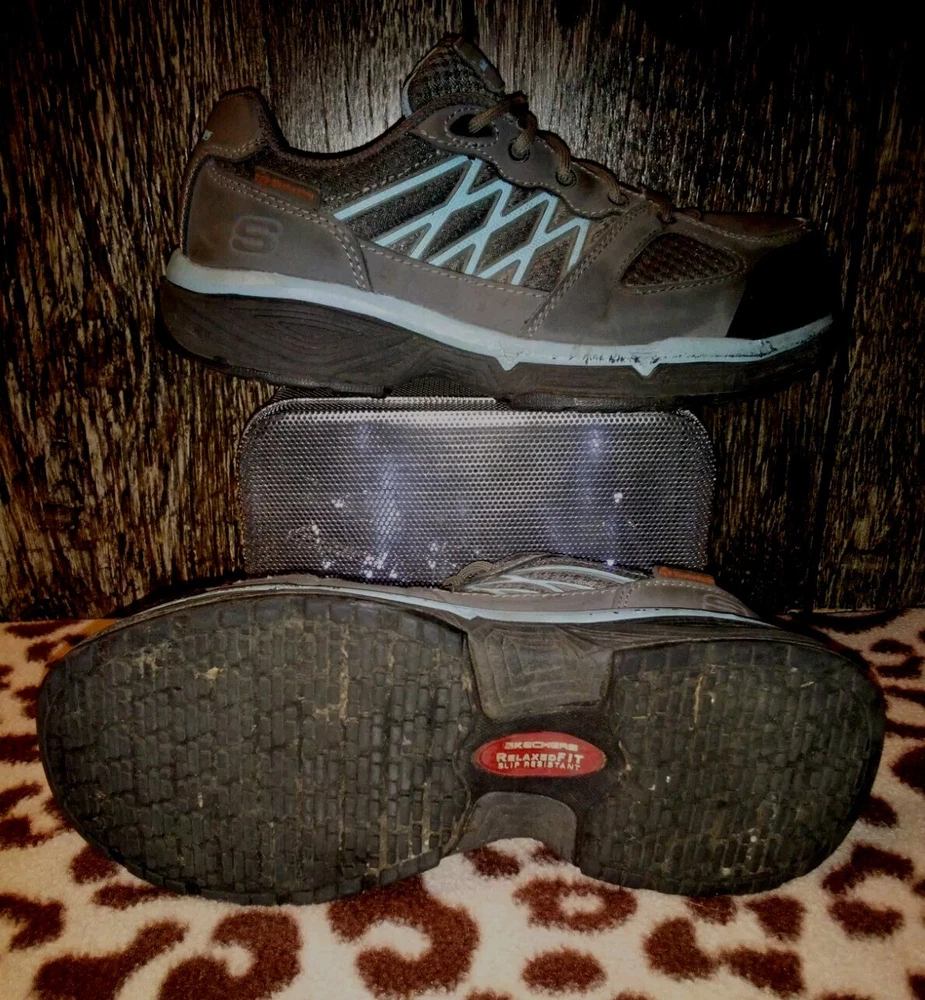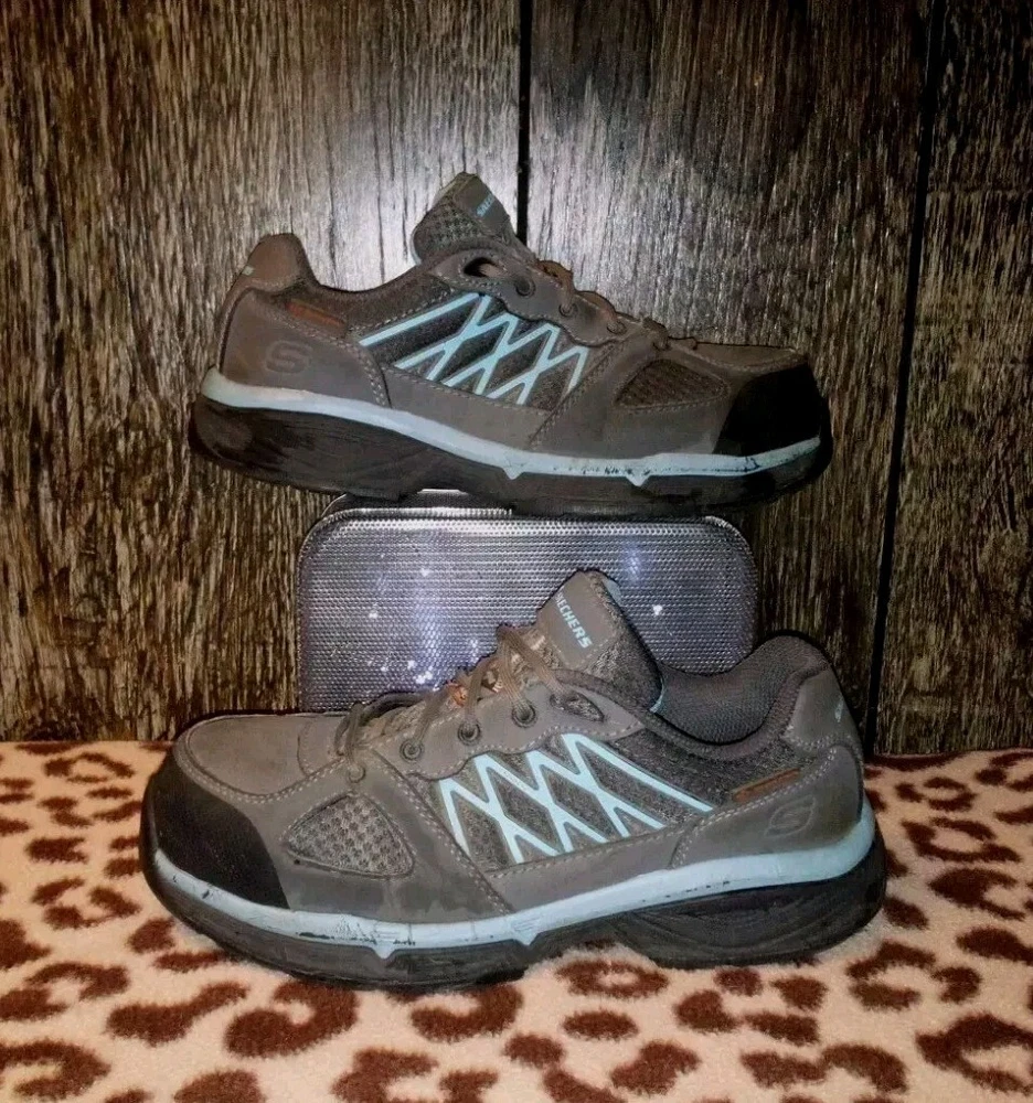 The product is a pair of Sketchers safety toe work shoes for women in size 10, designed with Static Dissipating (SD), Electrical Hazard (EH), and Conductive (CD) safety standards. They feature a gray color, a Relaxed Fit design for comfort, slip-resistant soles, and meet ASTM F2412/2413-11 standards. These shoes are made in China and come in a medium width. Perfect for industrial and safety environments, these shoes provide protection and support while ensuring comfort for the wearer. Thank you for choosing {Serendipity-Shop3}