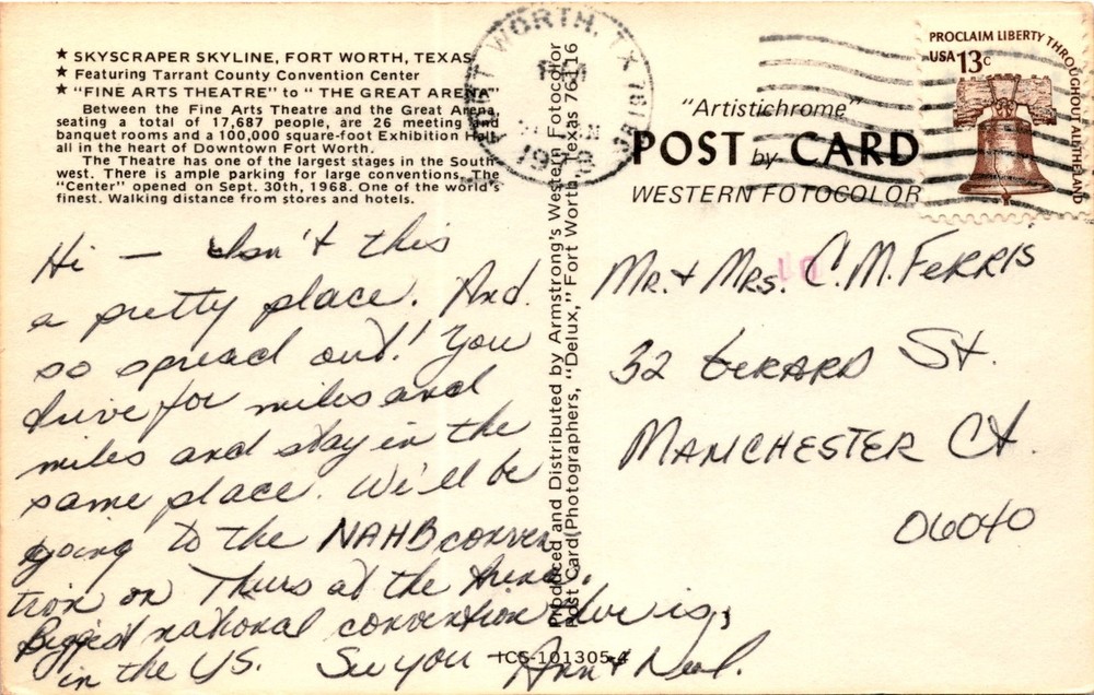 MAKE AN OFFER. THE MORE YOU BUY THE BETTER DEAL I WILL ACCEPT The postcard features a view of the Fort Worth, Texas skyline, with a focus on the Tarrant County Convention Center. The center includes the Fine Arts Theatre and the Great Arena, with a total seating capacity of 17,687 people. Additionally, there are 26 meeting and banquet rooms and a 100,000 square-foot Exhibition Hall.