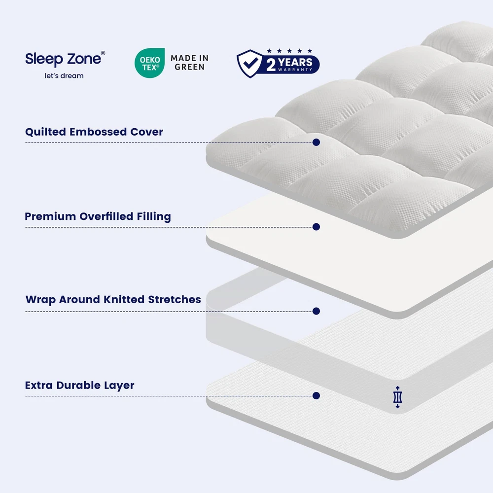 SLEEP ZONE Mattress Topper Queen Size, Cooling Mattress Pad Cover for Hot Sleepers, Extra Thick Pillow Top with Deep Pocket (White, Queen) Product Details Color: White Size: Queen Brand: SLEEP ZONE MPN: S2300ED3AWQU UPC: 840199210503 EAN: 0840199210503 Brand: SLEEP ZONE Color: White Size: Queen Fabric Type: Microfiber Special Feature: Washable Brand: SLEEP ZONE Color: White Size: Queen Fabric Type: Microfiber Special Feature: Washable Closure Type: Pull On Product Care Instructions: Machine Wash Water Resistance Level: Not Water Resistant Age Range (Description): All ages Material: Microfiber Manufacturer: SLEEP ZONE UPC: 840199210503 Item Weight: 10.43 pounds Product Dimensions: 60 x 80 x 15 inches Date First Available: October 14, 2023 SOFT & FLUFFY - We utilize 120gsm thick brushed ultra-fine fibers as the sleep surface, providing a cool and breathable feel. Filled with 800gsm 5D spiral fibers, thicker than most on the market, the fiber filling maintains exceptional softness and elasticity, making this mattress topper exceptionally fluffy. It creates an extraordinary sleep environment ELEGANT & DESIGNED - The unique box quilting design ensures that the filling is securely fixed in each box, preventing it from shifting easily. The elegant and simple colors complements the bedroom well, giving it a fresh and renewed appearance. REVIVING YOUR OLD MATTRESS - If your mattress is too firm, adding our mattress topper cover is an excellent solution. It adds softness and comfort to old, hard foam mattresses. This is also an economical way to extend the life of old mattresses without needing to replace them with expensive new ones. DEEP POCKET & EASY CARE - Quilted Stretch-to-Fit (8"-21"): The knitted skirt pocket stretches up to 21 inches deep, fitting most mattresses easily. A 1.6-inch wide sport elastic trim securely holds your mattress topper in place, and its excellent elasticity makes it easy to fit and remove. This ensures the most restful and restorative sleep. For optimal care, machine wash in cold water. Avoid using bleach and tumble dry on a low setting to maintain fabric quality and appearance. OEKO-TEX CERTIFICATION - SLEEP ZONE has more than 40 years' experience in the design and manufacture of bedding. Our products are OEKO-TEX Standard 100 certified. You can buy with confidence.