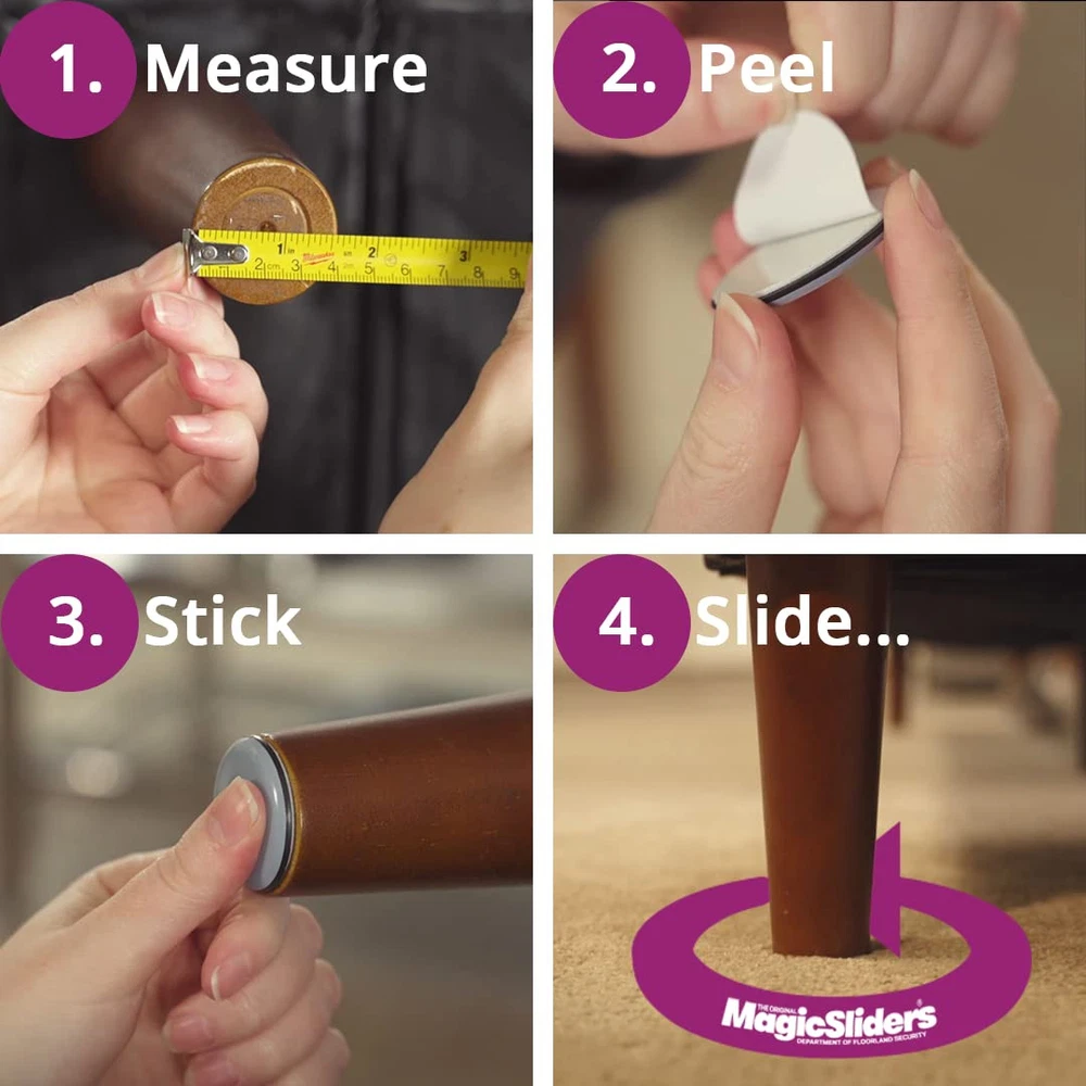 Product Description 4 pack, 2" x 2" x 2-1/2", triangle sliders, moves up to 3,200 lb, won't scratch your floors, works on any kind of surface, wood floors, vinyl, ceramic tile, carpeting. For end panel, square corner, & solid based items, adhesive included, Carded. From the Manufacturer Sliders 04557 Triangle Slider 2"x2"x2-1/2" Set of 4 It is easy to use It is highly durable Manufactured in China Model number: 04557