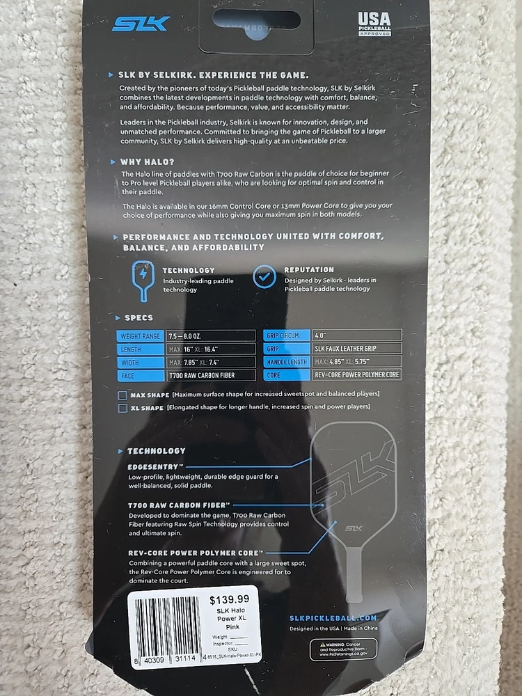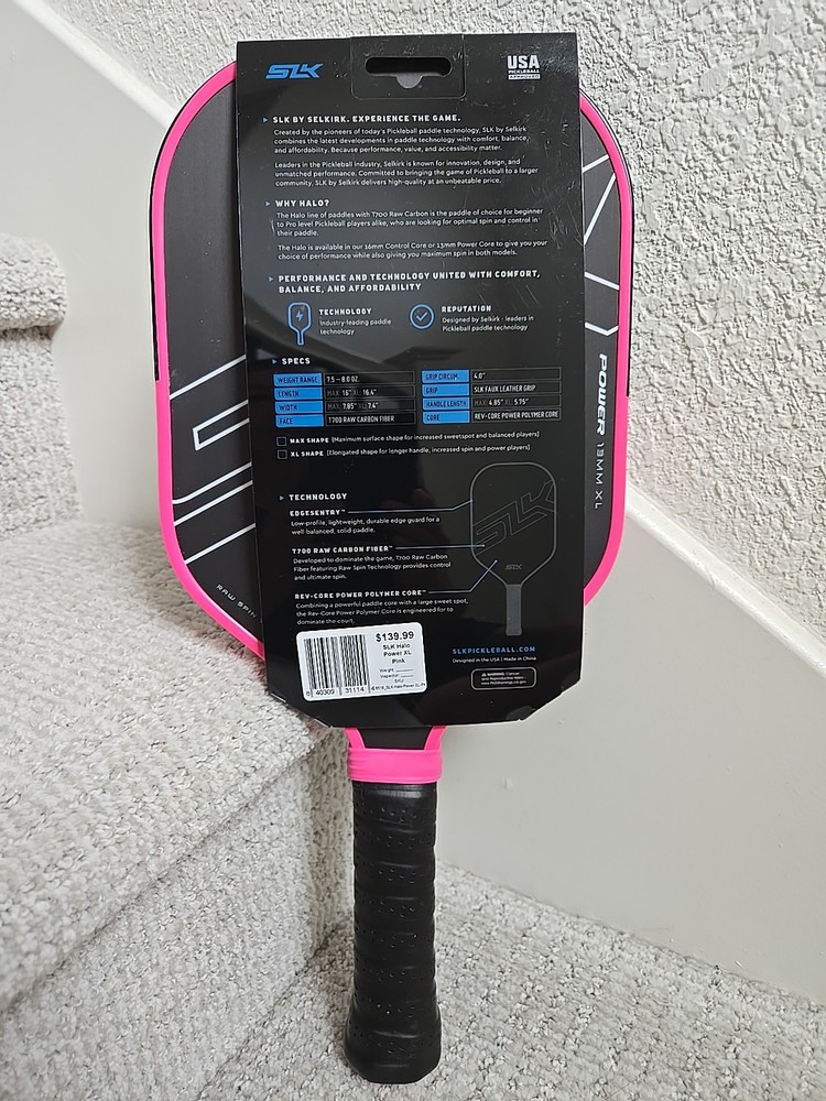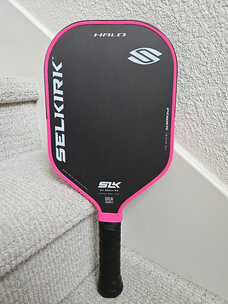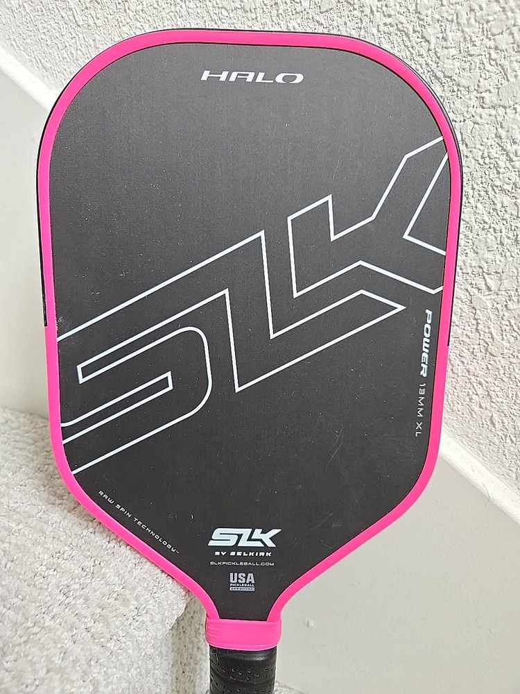 SLK by SELKIRK Halo Power 13mm XL Practically new...only played 2 short games with this paddle. Top of edge guard taped since day one, no scratches whatsoever. Original hot pink grip under the black overgrip. Will ship free if bundled with a second paddle. I also have a Holbrook Power Pro E 16mm listed.