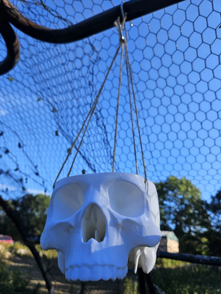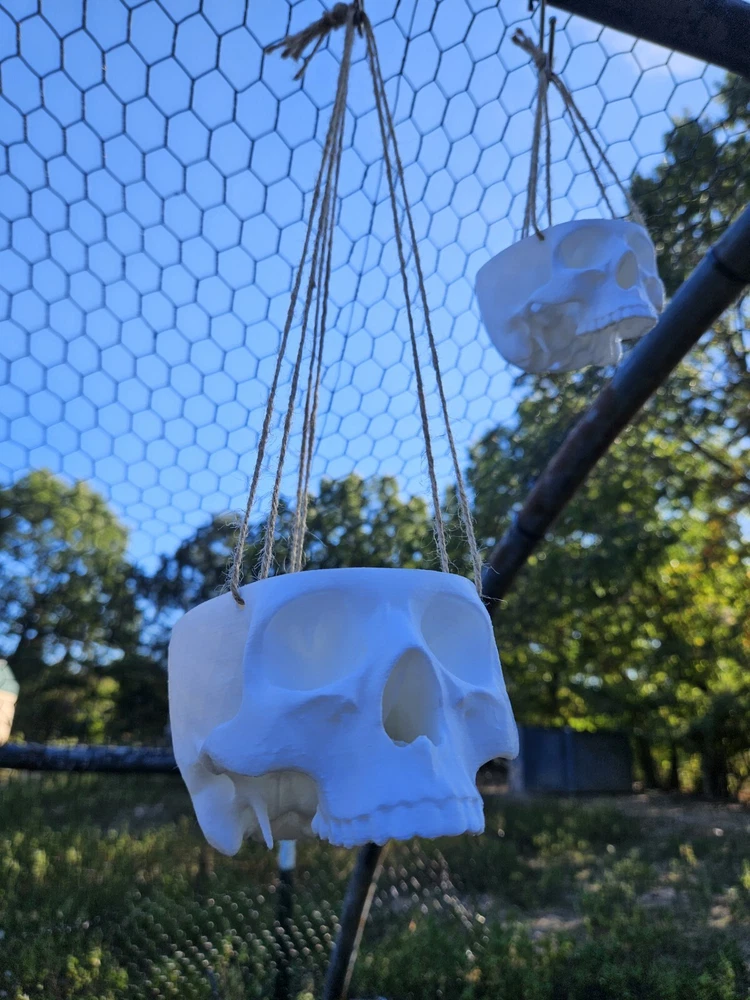 “There is no exquisite beauty… without some strangeness in the proportion” These are hanging skull planters. These work well for vining plants and have a drainage hole in the bottom. They are 3d printed with twine to hang it with. We have these in 3 sizes. Small-1 1/2in deep x 3 1/2in wide Medium-2 1/2in deep x 5in wide Large-3 1/2in deep x 7in wide This listing is for the small size.