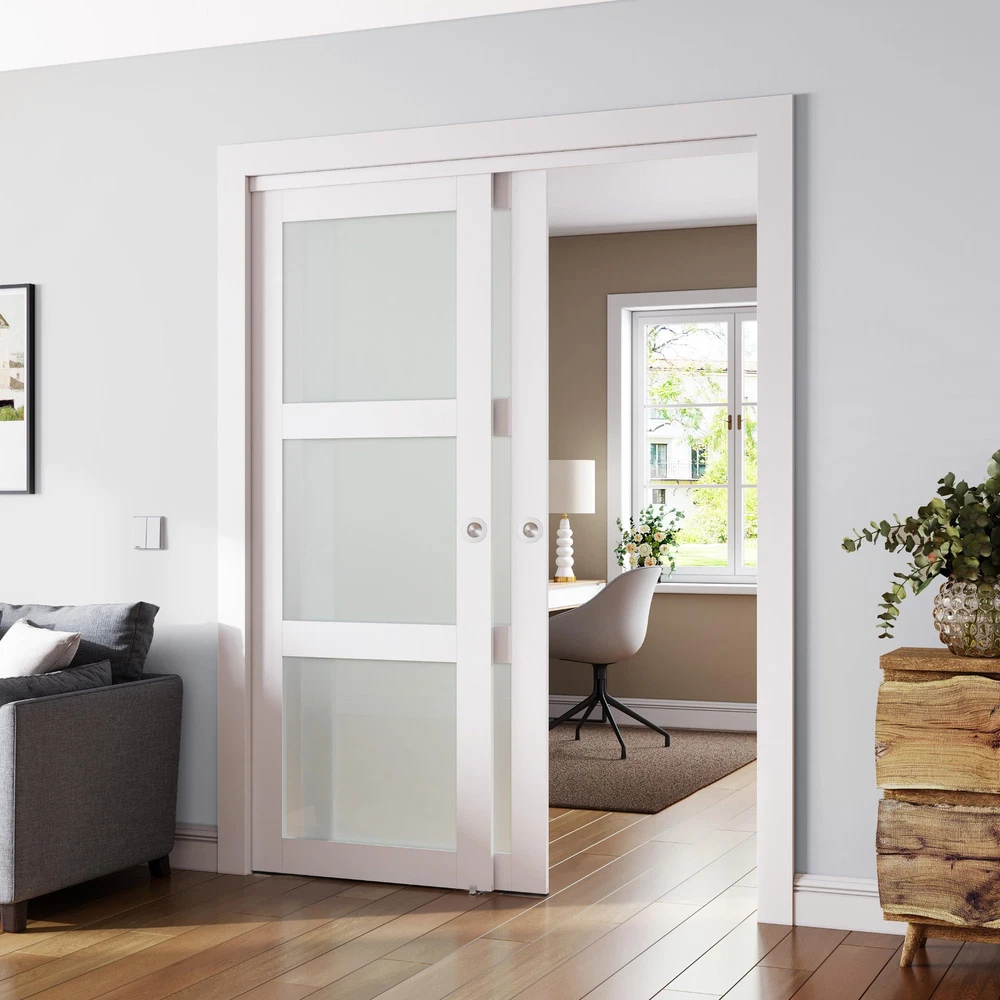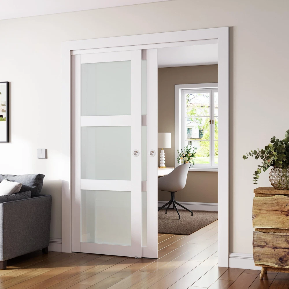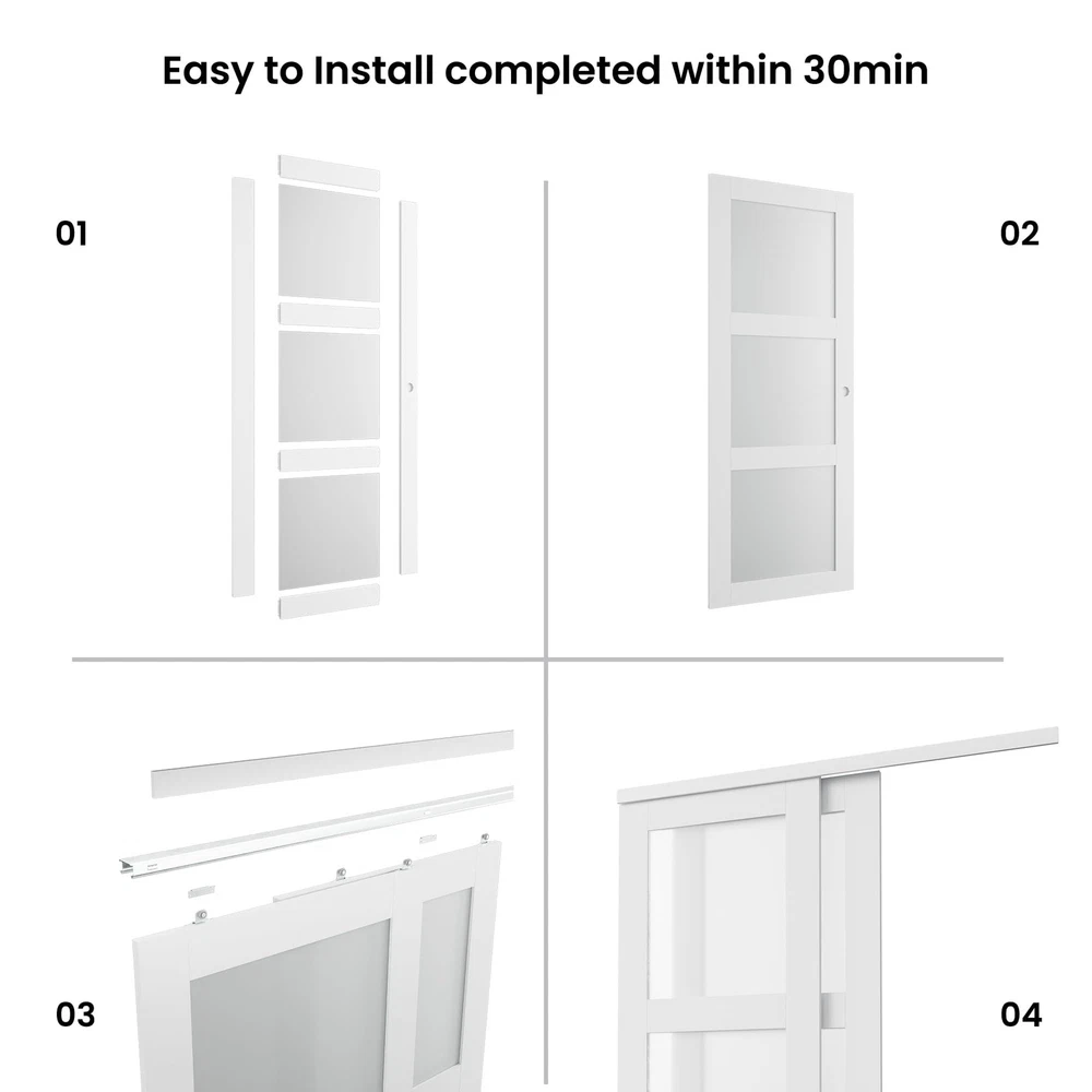 【Material Description】SMARTSTANDARD sliding closet door is made of tempered glass ,PVC film on the surface to prevent scratches and easy to clean,The frosted glass secures privacy while offering natural light. 【Door Sizes】72 "x80" door actual panel size: 2 x 37"(W) x 78 9/16"(H), thickness: 7/8"; The Door size is your door opening size; choose accordingly for the perfect fit. Please note that the door is suitable for door opening heights of 80 inches.(Door Panel Need To Assemble) 【Smooth Track】Our track is designed to be at the top, the track rollers are smooth and noiseless, and the bottom won't scratch the floor or carpet. All track rollers can endure more than 50k opening and closing actions. 【Widely Used】The sliding closet doors with classic design are suitable for most decorating style homes. You can use it in closet/laundry room/storage room/living room/pantries/kitchens and more. Sliding door moves in parallel between the opening and the wall can save space. 【Easy installation】Includes clear instructions with both written explanations and illustrations, making installation a breeze.