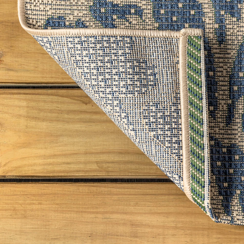 Add some graphic punch to your porch or patio with the bold blooms on our modern floral rug. The large-scale pattern has a geometric effect in a simple palette of leafy green, deep blue and beige. The flatweave design is great for high-traffic spaces indoors too. INDOOR/OUTDOOR DURABILITY: Give your patio, deck or porch an instant makeover with an indoor/outdoor rug; Low-pile synthetic rug fibers are durable for high-traffic spaces like the kitchen, mud room or entry; Perfect for families with STAIN-RESISTANT AND PET-FRIENDLY: This rug is made from synthetic fibers that resist UV fading; The pet-friendly low-pile construction won’t accumulate dirt, and spills clean up easily; It’s been machine-woven so the rug fibers will stay put EASY TO CARE FOR: To wash an outdoor rug, spray the surface with a 5-1 mixture of mild dish soap and water; Then rise thoroughly with a garden hose and hang over a railing to dry thoroughly Flat-weave construction of 100% polypropylene Leafy green and navy flowers on a beige ground