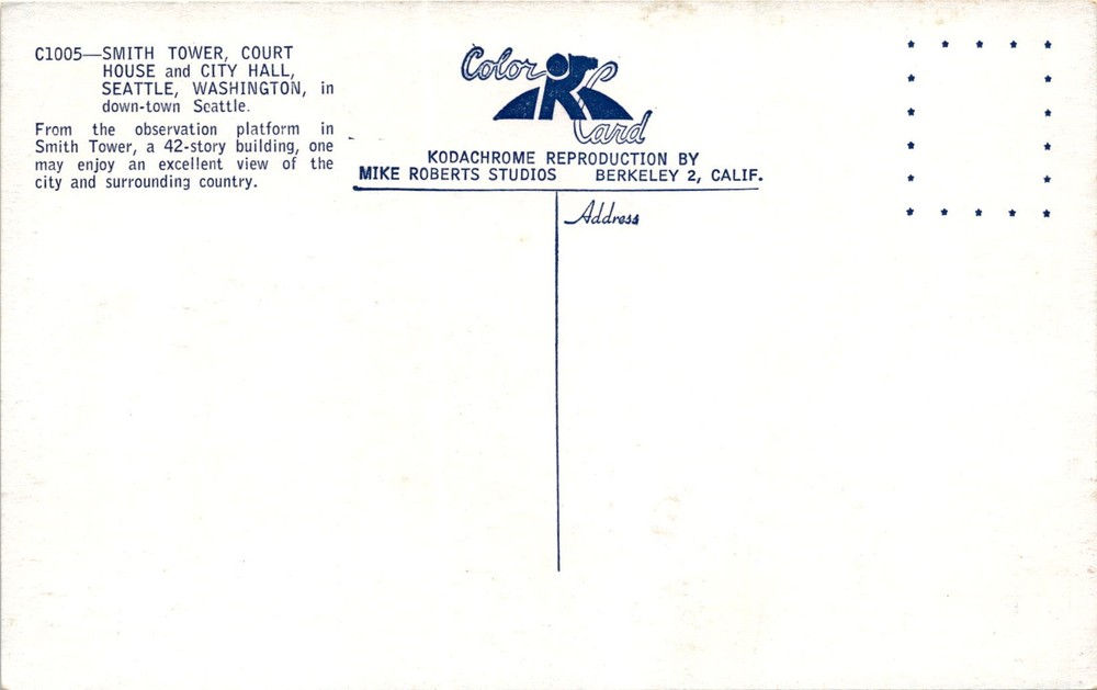The postcard features a view of the Smith Tower, Courthouse, and City Hall in downtown Seattle, Washington. Smith Tower is a historic 42-story building in Seattle, known for its observation platform that offers panoramic views of the city and surrounding areas. The postcard is in color and was reproduced using Kodachrome by Mike Roberts Studios in Berkeley, California.